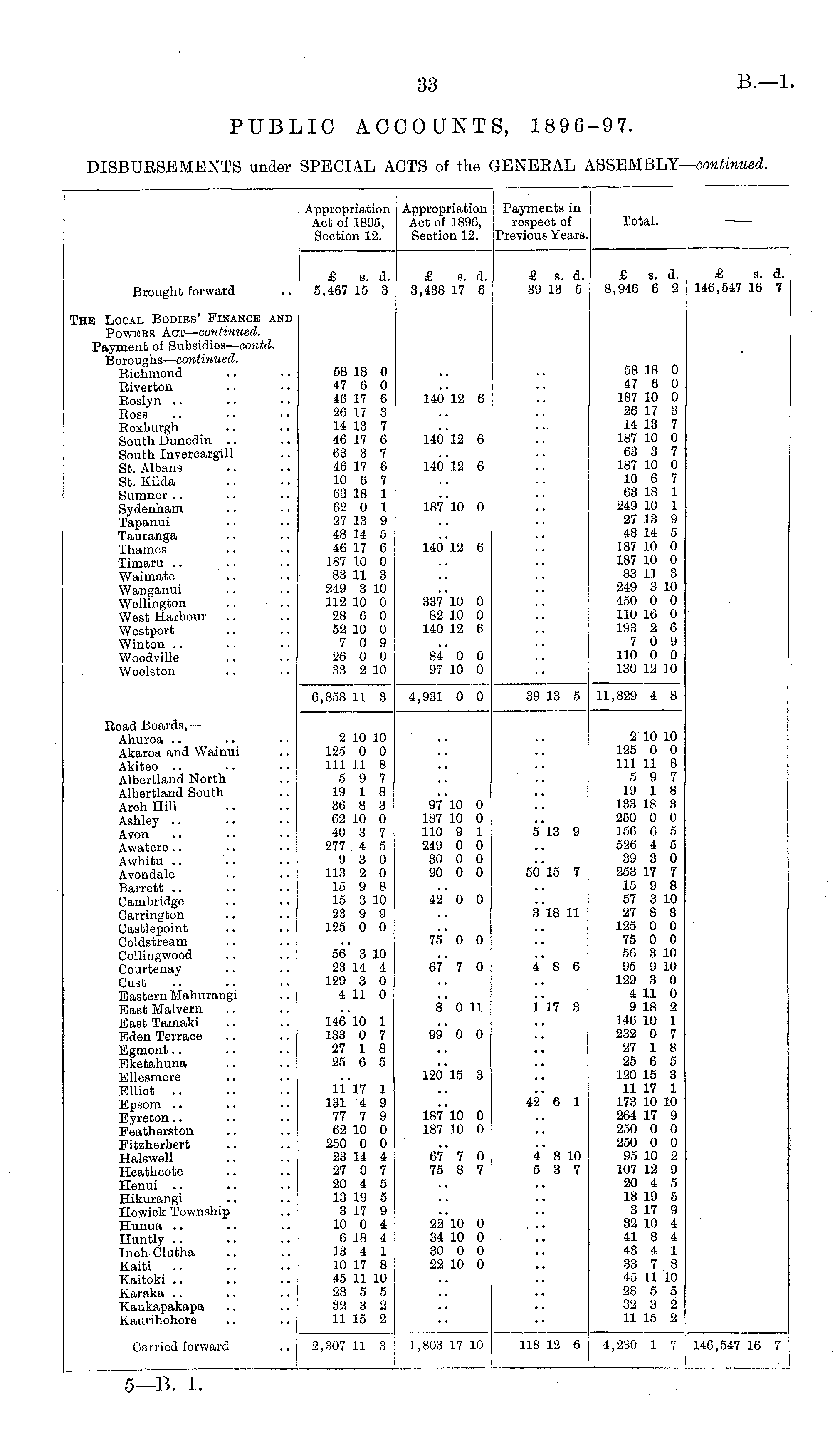 Appropriation Act of 1895, Section 12. Appropriation Act of 1896, Section 12. ! Payments in respect of Previous Years. Total. Brought forward £ s. d. 5,467 15 3 £ s. d. 3,438 17 6 £ s. d. 39 13 5 £ s. d. 8,946 6 2 £ s. d, 146,547 16 7 'he Local Bodies' Finance and Powers Act— continued. Payment of Subsidies — contd. Boroughs— continued. Richmond Riverton Roslyn Ross Roxburgh South Dunedin South Invercargill St. Albans St. Kilda Sumner Sydenham Tapanui Tauranga Thames Timaru Waimate Wanganui Wellington West Harbour Westport Winton Woodville Woolston 58 18 0 47 6 0 46 17 6 26 17 3 14 13 7 46 17 6 63 3 7 46 17 6 10 6 7 03 18 1 62 0 1 27 13 9 48 14 5 46 17 6 187 10 0 83 11 3 249 3 10 112 10 0 28 6 0 52 10 0 7 0 9 26 0 0 33 2 10 140*12 6 140 12 6 140*12 6 187*10 0 58 18 0 47 6 0 187 10 0 26 17 3 14 13 7 187 10 0 63 3 7 187 10 0 10 6 7 63 18 1 249 10 1 27 13 9 48 14 5 187 10 0 187 10 0 83 11 3 249 3 10 450 0 0 110 16 0 193 2 6 7 0 9 110 0 0 130 12 10 140*12 6 337 10 0 82 10 0 140 12 6 84* 0 0 97 10 0 6,858 11 3 4,931 0 0 39 13 5 11,829 4 8 Road Boards,— Ahuroa Akaroa and Wainui Akiteo Albertland North Albertland South Arch Hill Ashley Avon Awatere Awhitu Avondale Barrett Cambridge Carrington Castlepoint Coldstream Collingwood Courtenay Oust Eastern Mahurangi East Malvern East Tamaki Eden Terrace Egmont Eketahuna Ellesmere Elliot .. Epsom Eyreton Featherston Fitzherbert Halswell Heathcote Henui Hikurangi Howick Township Hunua Huntly Inch-Clutha Kaiti Kaitoki Karaka Kaukapakapa Kaurihohore 2 10 10 125 0 0 111 11 8 5 9 7 19 1 8 36 8 3 62 10 0 40 3 7 277 . 4 5 9 3 0 113 2 0 15 9 8 15 3 10 23 9 9 125 0 0 56 3 10 23 14 4 129 3 0 4 11 0 146 10 1 133 0 7 27 1 8 25 6 5 97 10 0 187 10 0 110 9 1 249 0 0 30 0 0 90 0 0 42* 0 0 75* 0 0 67* 7 0 8* 0 11 513 9 50 16 7 318 11 4* 8 6 i 17 3 2 10 10 125 0 0 111 11 8 5 9 7 19 1 8 133 18 3 250 0 0 156 6 5 526 4 5 39 3 0 253 17 7 15 9 8 57 3 10 27 8 8 125 0 0 75 0 0 56 3 10 95 9 10 129 3 0 4 11 0 9 18 2 146 10 1 232 0 7 27 1 8 25 6 5 120 15 3 11 17 1 173 10 10 264 17 9 250 0 0 250 0 0 95 10 2 107 12 9 20 4 5 13 19 5 3 17 9 32 10 4 41 8 4 43 4 1 33 7 8 45 11 10 28 5 5 32 3 2 11 15 2 99* 0 0 120*15 3 11 17 1 131 4 9 77 7 9 62 10 0 250 0 0 23 14 4 27 0 7 20 4 5 13 19 5 3 17 9 10 0 4 6 18 4 13 4 1 10 17 8 45 11 10 28 5 5 32 3 2 11 15 2 187 10 0 187 10 0 67 7 0 75 8 7 42* 6 1 4* 8 10 5 3 7 22 10 0 34 10 0 30 0 0 22 10 0 Carried forward 2,307 11 3 1,803 17 10 118 12 6 4,230 1 7 146,547 16 7