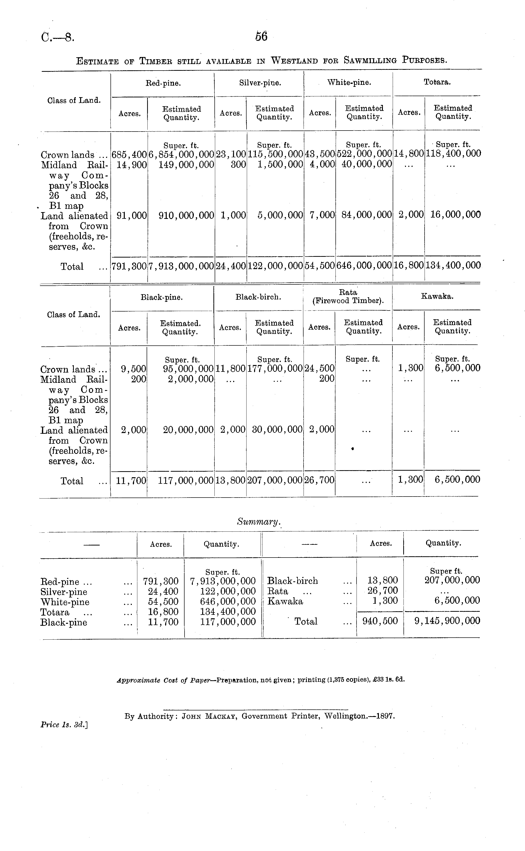 ;ed-pine. Silver-pine. White-pine. 'otara. Class of Land. Acres. Estimated Quantity. . Estimated Acres ' Quantity. Acres. Estimated Quantity. Acres. Estimated Quantity. Crown lands ... Midland Bailway Company's Blocks 26 and 28, Bl map Land alienated from Crown (freeholds, reserves, &c. 685,400 14,900 Super, ft. 6,854,000,000 149,000,000 23,100 300 Super, ft. 115,500,000 1,500,000 43,500 4,000 Super, ft. 522,000,000 40,000,000 14,800] Super, ft. |ll8,400,000 910,000,000 5,000,000 84,000,000 16,000,000 91,000 1,000 7,000 2,000 Total 791,300 7,913,000,001 24,400! 1122,000,000 54,500 646,000,000 16,800 134,400,000 ack-pine. Bli ,ck-birch. Eata ■ood Timber). !awaka. (FireClass of Land. Acres. Estimated. Quantity. Acres. Estimated Quantity. Acres. Estimated Quantity. Acres. Estimated Quantity. Crown lands ... Midland Bailway Company's Blocks 26 and 28, Bl map Land alienated from Crown (freeholds, reserves, &c. 9,500 200 Super, ft. 95,000,000 2,000,000 11,800 Super, ft. 177,000,0001 124,500 200 Super, ft. 1,300 Super, ft. 6,500,000 20,000,000 30,000,000 2,000 2,000 2,000 9 Total 11,700 117,000,000 13,800 207,000,000 26,700 1,300 6,500,000