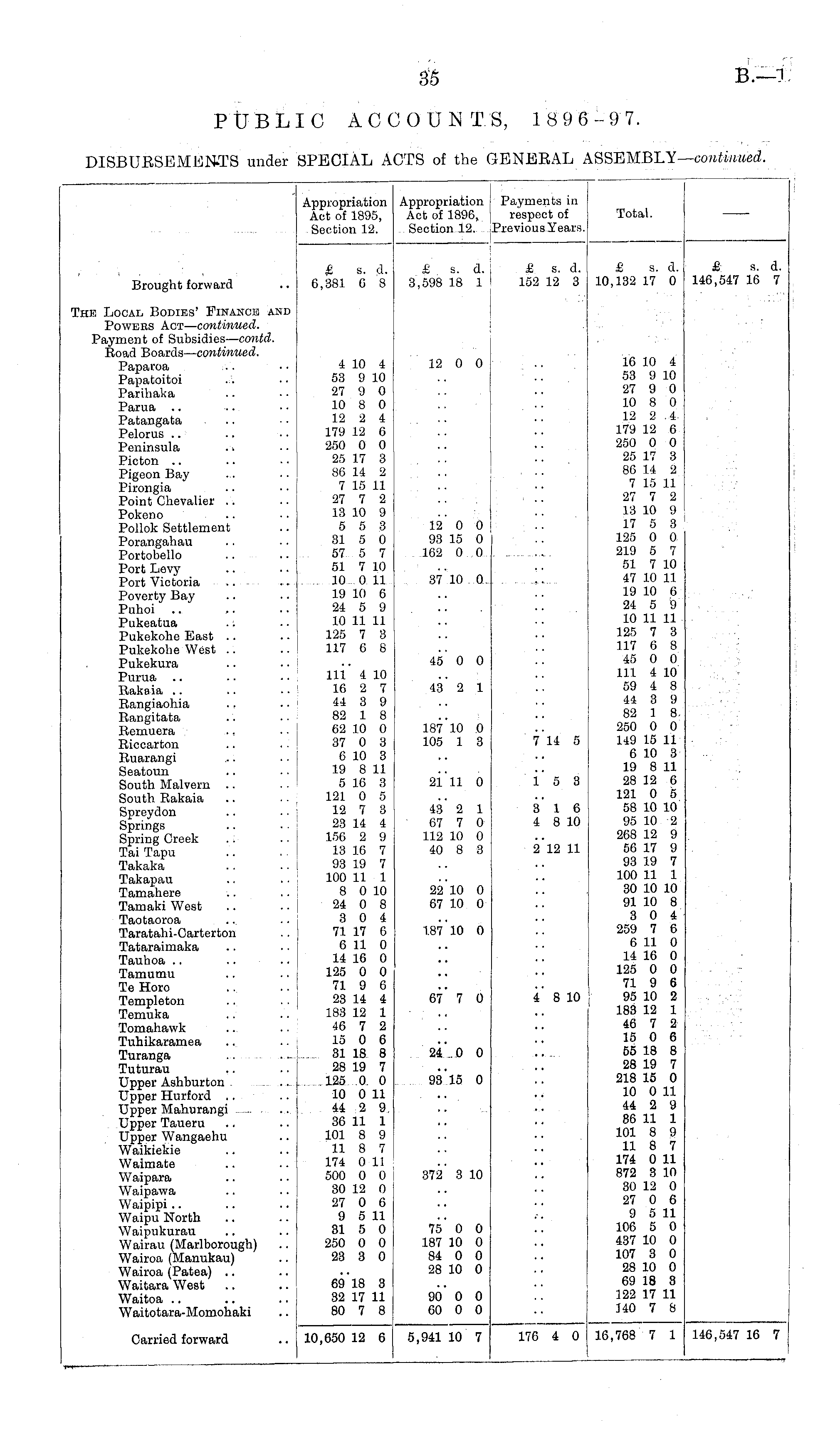 Appropriation Act of 1895, Section 12. Lppropriation Act of 1896, Section 12. Payments in respect of Previous Years. Total. Brought forward £ s. d. 6,381 6 8 £ s. d. 3,598 18 1 £ s. d. 152 12 3 £ s. d. 10,132 17 0 £ s. a. 146,547 16 7 'he Local Bodies' Finance and Powers Act— continued. Payment of Subsidies — contd. Road Boards— continued. Paparoa Papatoitoi Parihaka Parua Patangata Pelorus Peninsula Picton Pigeon Bay Pirongia Point Chevalier Pokeno Pollok Settlement Porangahau Portobello Port Levy Port Victoria - .. - Poverty Bay Puhoi Pukeatua .; Pukekohe East Pukekohe West Pukekura Purua Rakaia Rangiaohia ., Rangitata Remuera Riccarton Ruarangi Seatoun South Malvern South Rakaia Spreydon Springs Spring Creek Tai Tapu Takaka Takapau Tamahere Tamaki West Taotaoroa Taratahi-Carterton Tataraimaka Tauhoa Tamumu Te Horo Templeton Temuka Tomahawk Tuhikaramea Turanga .. ...- Tuturau Upper Ashburton . - — Upper Hurford Upper Mahurangi ... .. Upper Taueru Upper Wangaehu Waikiekie Waimate Waipara Waipawa Waipipi Waipu North Waipukurau Wairau (Marlborough) Wairoa (Manukau) Wairoa (Patea) Waitara West Waitoa Waitotara-Momohaki 4 10 4 53 9 10 27 9 0 10 8 0 12 2 4 179 12 6 250 0 0 25 17 3 86 14 2 7 15 11 27 7 2 13 10 9 5 5 3 31 5 0 57 5 7 51 7 10 10 0 11 19 10 6 24 5 9 10 11 11 125 7 3 117 6 8 111 4 10 16 2 7 44 3 9 82 1 8 62 10 0 37 0 3 6 10 3 19 8 11 5 16 3 121 0 5 12 7 3 23 14 4 156 2 9 13 16 7 93 19 7 100 11 1 8 0 10 24 0 8 3 0 4 71 17 6 6 11 0 14 16 0 125 0 0 71 9 6 23 14 4 183 12 1 46 7 2 15 0 6 31 18 8 28 19 7 .125 0. 0 10 0 11 44 2 9. 36 11 1 101 8 9 11 8 7 174 0 11 500 0 0 30 12 0 27 0 6 9 5 11 31 5 0 250 0 0 23 3 0 12 0 0 12 0 0 93 15 0 162 0 0 37 10 0. 45* 0 0 43 2 1 187*10 .0 105 1 3 21*11 0 43 2 1 67 7 0 112 10 0 40 8 3 7 14 5 i' 5 3 316 4 8 10 16 10 4 53 9 10 27 9 0 10 8 0 12 2 4 179 12 6 250 0 0 25 17 3 86 14 2 7 15 11 27 7 2 13 10 9 17 5 3 125 0 0 219 5 7 51 7 10 47 10 11 19 10 6 24 5 9 10 11 11 125 7 3 117 6 8 45 0 0 111 4 10 59 4 8 44 3 9 82 1 8. 250 0 0 149 15 11 6 10 3 19 8 11 28 12 6 121 0 5 58 10 10 95 10 2 268 12 9 56 17 9 93 19 7 100 11 1 30 10 10 91 10 8 3 0 4 259 7 6 6 11 0 14 16 0 125 0 0 71 9 6 95 10 2 183 12 1 46 7 2 15 0 6 55 18 8 28 19 7 218 15 0 10 0 11 44 2 9 86 11 1 101 8 9 11 8 7 174 0 11 872 3 10 30 12 0 27 0 6 9 5 11 106 5 0 437 10 0 107 3 0 28 10 0 69 18 3 122 17 11 140 7 8 2*12 11 22*10 0 67 10 0 1.87*10 0 67* 7 0 i 8 10 24* 0 0 9315 0 372* 3 10 75 0 0 187 10 0 84 0 0 28 10 0 69 18 3 32 17 11 80 7 8 90* 0 0 60 0 0 Carried forward 16,768 7 1 146,547 16 7 10,650 12 6 5,941 10 7 176 4 0