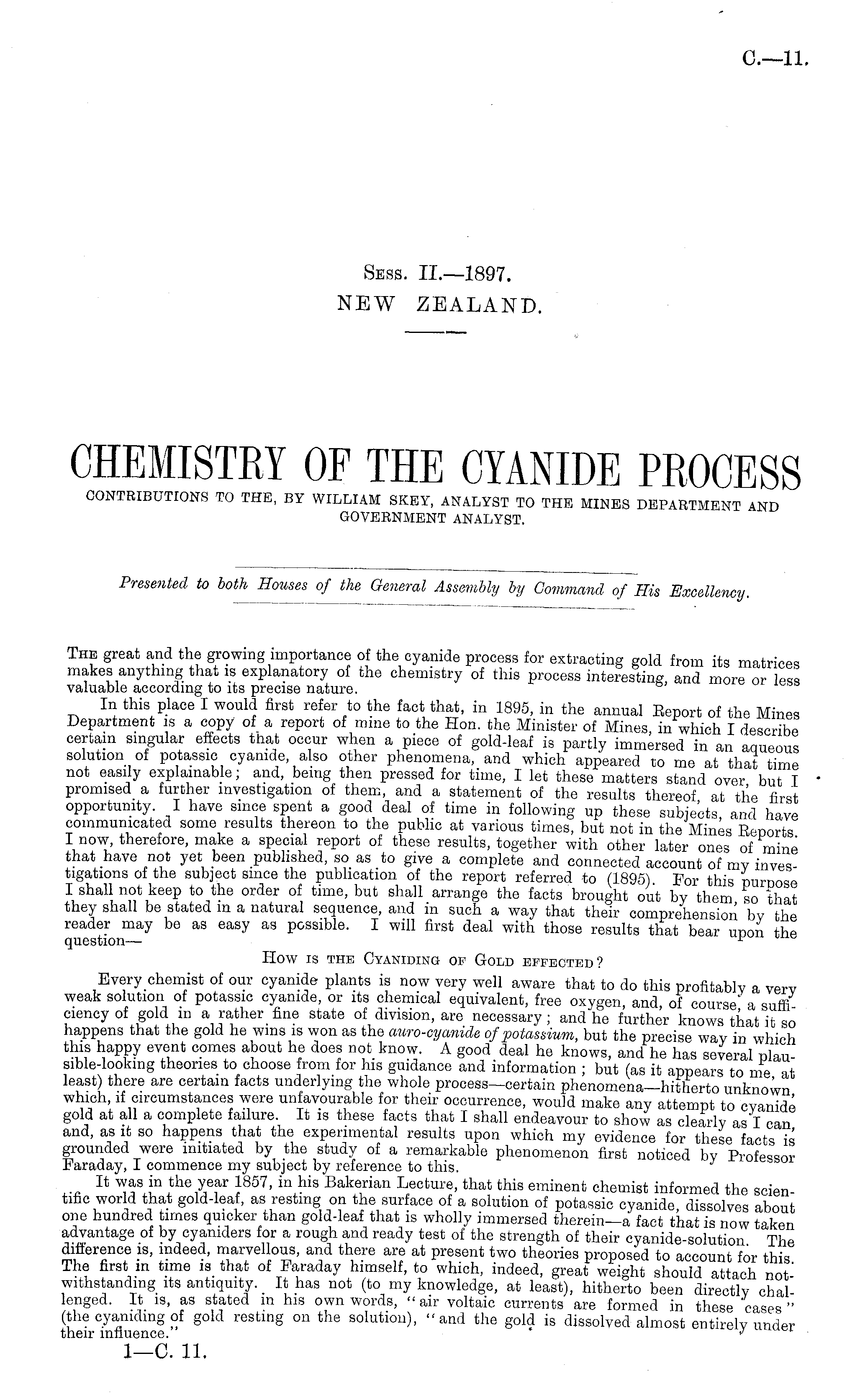 CHEMISTRY OF THE CYANIDE PROCESS CONTRIBUTIONS TO THE, BY WILLIAM SKEY, ANALYST TO THE MINES DEPARTMENT AND GOVERNMENT ANALYST.