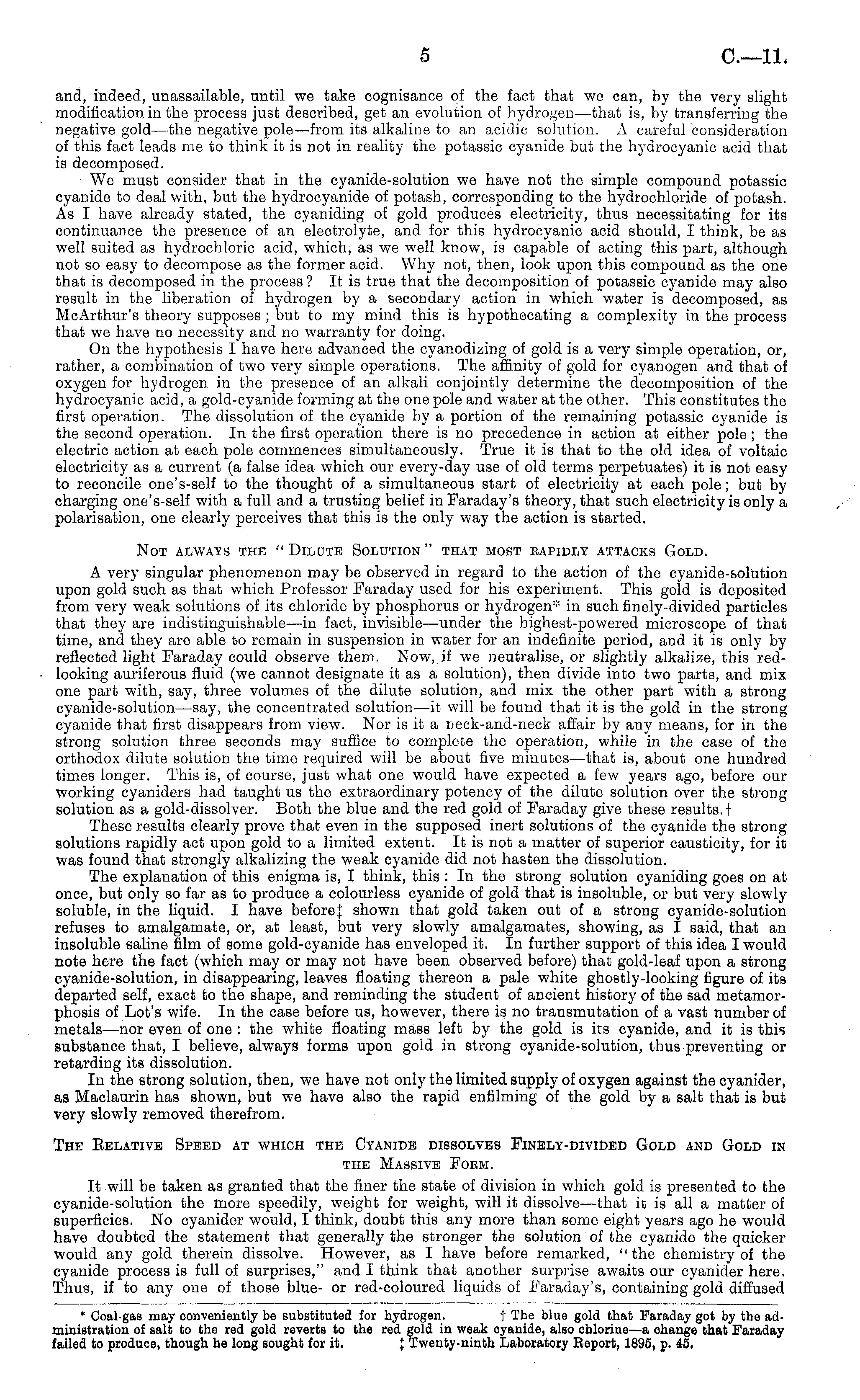 and, indeed, unassailable, until we take cognisance of the fact that we can, by the very slight modification in the process just described, get an evolution of hydrogen—that is, by transferring the negative gold—the negative pole—from its alkaline to an acidic solution. A careful consideration of this fact leads me to think it is not in reality the potassic cyanide but the hydrocyanic acid that is decomposed. We must consider that in the cyanide-solution we have not the simple compound potassic cyanide to deal with, but the hydrocyanide of potash, corresponding to the hydrochloride of potash. As I have already stated, the cyaniding of gold produces electricity, thus necessitating for its continuance the presence of an electrolyte, and for this hydrocyanic acid should, I think, be as well suited as hydrochloric acid, which, as we well know, is capable of acting this part, although not so easy to decompose as the former acid. Why not, then, look upon this compound as the one that is decomposed in the process ? It is true that the decomposition of potassic cyanide may also result in the liberation of hydrogen by a secondary action in which water is decomposed, as McArthur's theory supposes ; but to my mind this is hypothecating a complexity in the process that we have no necessity and no warranty for doing. On the hypothesis I have here advanced the cyanodizing of gold is a very simple operation, or, rather, a combination of two very simple operations. The affinity of gold for cyanogen and that of oxygen for hydrogen in the presence of an alkali conjointly determine the decomposition of the hydrocyanic acid, a gold-cyanide forming at the one pole and water at the other. This constitutes the first operation. The dissolution of the cyanide by a portion of the remaining potassic cyanide is the second operation. In the first operation there is no precedence in action at either pole; the electric action at each pole commences simultaneously. True it is that to the old idea of voltaic electricity as a current (a false idea which our every-day use of old terms perpetuates) it is not easy to reconcile ones-self to the thought of a simultaneous start of electricity at each pole; but by charging ones-self with a full and a trusting belief in Faraday's theory, that such electricity is only a polarisation, one clearly perceives that this is the only way the action is started. Not always the " Dilute Solution " that most rapidly attacks Gold. A very singular phenomenon may be observed in regard to the action of the cyanide-solution upon gold such as that which Professor Faraday used for his experiment. This gold is deposited from very weak solutions of its chloride by phosphorus or hydrogen* in such finely-divided particles that they are indistinguishable —in fact, invisible —under the highest-powered microscope of that time, and they are able to remain in suspension in water for an indefinite period, and it is only by reflected light Faraday could observe them. Now, if we neutralise, or slightly alkalize, this redlooking auriferous fluid (we cannot designate it as a solution), then divide into two parts, and mix one part with, say, three volumes of the dilute solution, and mix the other part with a strong cyanide-solution —say, the concentrated solution—it will be found that it is the gold in the strong cyanide that first disappears from view. Nor is it a neck-and-neck affair by any means, for in the strong solution three seconds may suffice to complete the operation, while in the case of the orthodox dilute solution the time required will be about five minutes —that is, about one hundred times longer. This is, of course, just what one would have expected a few years ago, before our working cyaniders had taught us the extraordinary potency of the dilute solution over the strong solution as a gold-dissolver. Both the blue and the red gold of Faraday give these results, t These results clearly prove that even in the supposed inert solutions of the cyanide the strong solutions rapidly act upon gold to a limited extent. It is not a matter of superior causticity, for it was found that strongly alkalizing the weak cyanide did not hasten the dissolution. The explanation of this enigma is, I think, this : In the strong solution cyaniding goes on at once, but only so far as to produce a colourless cyanide of gold that is insoluble, or but very slowly soluble, in the liquid. I have before} shown that gold taken out of a strong cyanide-solution refuses to amalgamate, or, at least, but very slowly amalgamates, showing, as I said, that an insoluble saline film of some gold-cyanide has enveloped it. In further support of this idea I would note here the fact (which may or may not have been observed before) that gold-leaf upon a strong cyanide-solution, in disappearing, leaves floating thereon a pale white ghostly-looking figure of its departed self, exact to the shape, and reminding the student of ancient history of the sad metamorphosis of Lot's wife. In the case before us, however, there is no transmutation of a vast number of metals—nor even of one : the white floating mass left by the gold is its cyanide, and it is this substance that, I believe, always forms upon gold in strong cyanide-solution, thus preventing or retarding its dissolution. In the strong solution, then, we have not only the limited supply of oxygen against the cyanider, as Maclaurin has shown, but we have also the rapid enfilming of the gold by a salt that is but very slowly removed therefrom. The Relative Speed at which the Cyanide dissolves Finely-divided Gold and Gold in the Massive Foem. It will be taken as granted that the finer the state of division in which gold is presented to the cyanide-solution the more speedily, weight for weight, will it dissolve—that it is all a matter of superficies. No cyanider would, I think, doubt this any more than some eight years ago he would have doubted the statement that generally the 