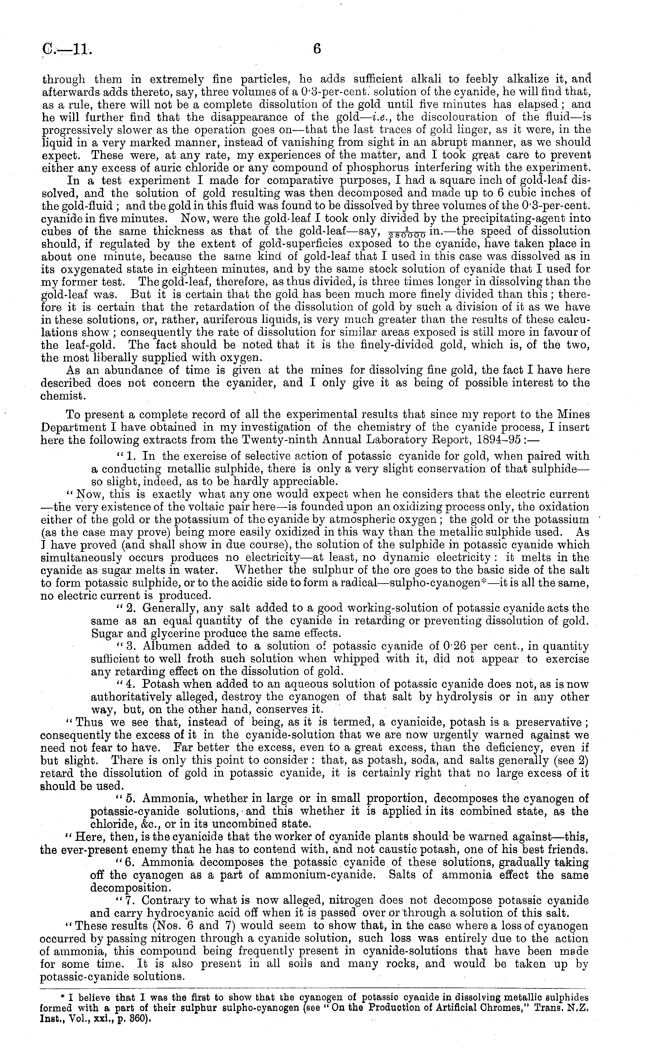 through them in extremely fine particles, he adds sufficient alkali to feebly alkalize it, and afterwards adds thereto, say, three volumes of a o'3-per-cent. solution of the cyanide, he will find that, as a rule, there will not be a complete dissolution of the gold until five minutes has elapsed ; and he will further find that the disappearance of the gold— i.e., the discolouration of the fluid—is progressively slower as the operation goes on—that the last traces of gold linger, as it were, in the liquid in a very marked manner, instead of vanishing from sight in an abrupt manner, as we should expect. These were, at any rate, my experiences of the matter, and I took great care to prevent either any excess of auric chloride or any compound of phosphorus interfering with the experiment. In a test experiment I made for comparative purposes, I had a square inch of gold-leaf dissolved, and the solution of gold resulting was then decomposed and made up to 6 cubic inches of the gold-fluid ; and the gold in this fluid was found to be dissolved by three volumes of the o'3-per-cent. cyanide in five minutes. Now, were the gold-leaf I took only divided by the precipitating-agent into cubes of the same thickness as that of the gold-leaf—say, i Q - —the s P of dissolution should, if regulated by the extent of gold-superficies exposed to the cyanide, have taken place in about one minute, because the same kind of gold-leaf that I used in this case was dissolved as in its oxygenated state in eighteen minutes, and by the same stock solution of cyanide that I used for my former test. The gold-leaf, therefore, as thus divided, is three times longer in dissolving than the gold-leaf was. But it is certain that the gold has been much more finely divided than this ; therefore it is certain that the retardation of the dissolution of gold by such a division of it as we have in these solutions, or, rather, auriferous liquids, is very much greater than the results of these calculations show ; consequently the rate of dissolution for similar areas exposed is still more in favour of the leaf-gold. The fact should be noted that it is the finely-divided gold, which is, of the two, the most liberally supplied with oxygen. As an abundance of time is given at the mines for dissolving fine gold, the fact I have here described does not concern the cyanider, and I only give it as being of possible interest to the chemist. To present a complete record of all the experimental results that since my report to the Mines Department I have obtained in my investigation of the chemistry of the cyanide process, I insert here the following extracts from the Twenty-ninth Annual Laboratory Eeport, 1894-95 : — "1. In the exercise of selective action of potassic cyanide for gold, when paired with a conducting metallic sulphide, there is only a very slight conservation of that sulphide— so slight, indeed, as to be hardly appreciable. " Now, this is exactly what any one would expect when he considers that the electric current —the very existence of the voltaic pair here —is founded upon an oxidizing process only, the oxidation either of the gold or the potassium of the cyanide by atmospheric oxygen ; the gold or the potassium (as the case may prove) being more easily oxidized in this way than the metallic sulphide used. As I have proved (and shall show in due course), the solution of the sulphide in potassic cyanide which simultaneously occurs produces no electricity—at least, no dynamic electricity : it melts in the cyanide as sugar melts in water. Whether the sulphur of the ore goes to the basic side of the salt to form potassic sulphide, or to the acidic side to form a radical —sulpho-cyanogen* —it is all the same, no electric current is produced. " 2. Generally, any salt added to a good working-solution of potassic cyanide acts the same as an equal quantity of the cyanide in retarding or preventing dissolution of gold. Sugar and glycerine produce the same effects. " 3. Albumen added to a solution of potassic cyanide of 026 per cent., in quantity sufficient to well froth such solution when whipped with it, did not appear to exercise any retarding effect on the dissolution of gold. " 4. Potash when added to an aqueous solution of potassic cyanide does not, as is now authoritatively alleged, destroy the cyanogen of that salt by hydrolysis or in any other way, but, on the other hand, conserves it. " Thus we see that, instead of being, as it is termed, a cyanicide, potash is a preservative ; consequently the excess of it in the cyanide-solution that we are now urgently warned against we need not fear to have. Far better the excess, even to a great excess, than the deficiency, even if but slight. There is only this point to consider : that, as potash, soda, and salts generally (see 2) retard the dissolution of gold in potassic cyanide, it is certainly right that no large excess of it should be used. " 5. Ammonia, whether in large or in small proportion, decomposes the cyanogen of potassic-cyanide solutions, and this whether it is applied in its combined state, as the chloride, &c, or in its uncombined state. " Here, then, is the cyanicide that the worker of cyanide plants should be warned against—this, the ever-present enemy that he has to contend with, and not caustic potash, one of his best friends. "6. Ammonia decomposes the potassic cyanide of these solutions, gradually taking off the cyanogen as a part of ammonium-cyanide. Salts of ammonia effect the same decomposition. "7. Contrary to what is now alleged, nitrogen does not decompose potassic cyanide and carry hydrocyanic acid off when it is passed over or through a solution of this salt. "These results (Nos. 6 and 7) would seem to show that, in the case where a loss of cyanogen occurred by passing nitrogen through a cyanide solution, such loss was entirely due to the action of ammonia, this compound being frequently present in cyanide-solutions that have been ma