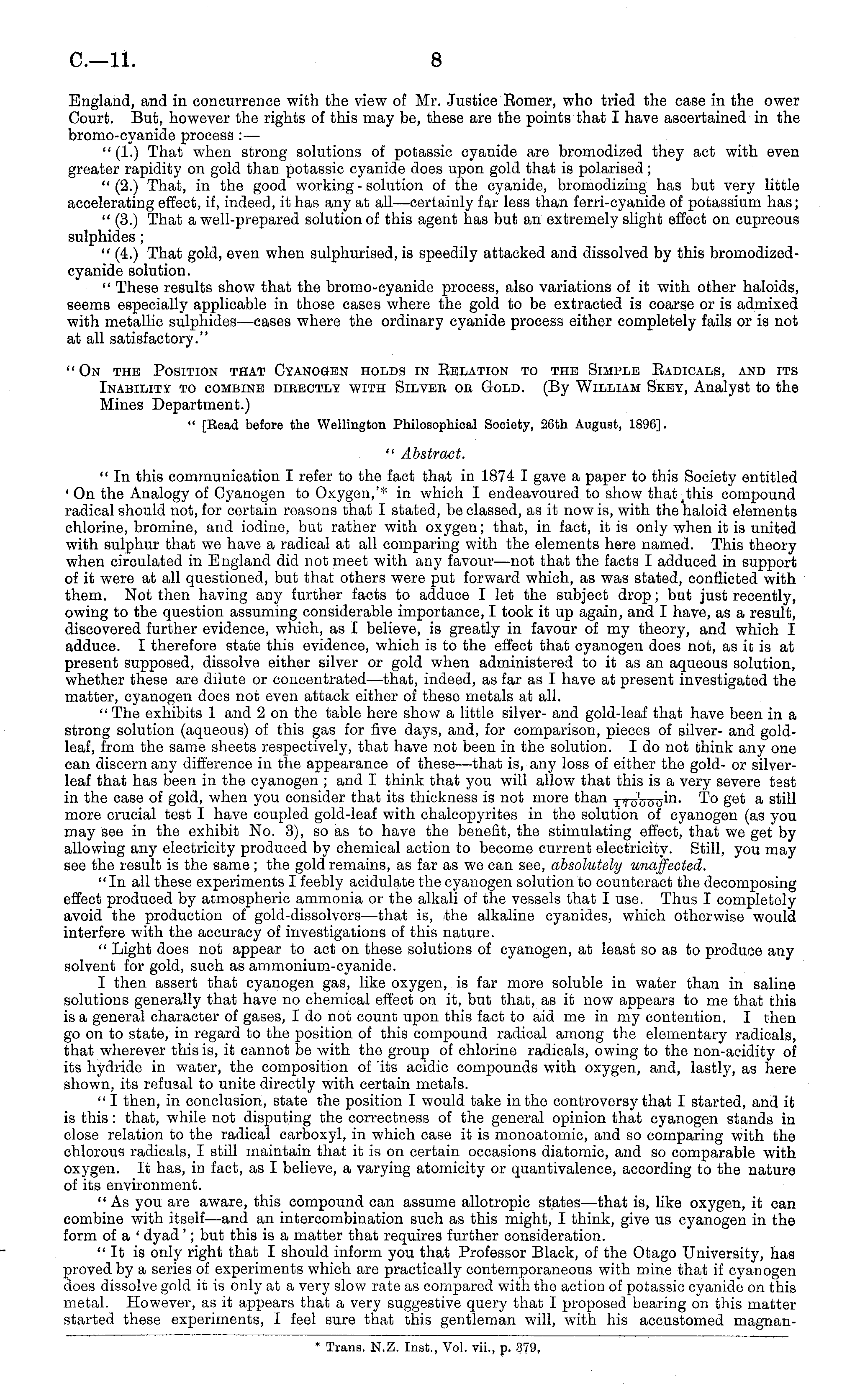 England, and in concurrence with the view of Mr. Justice Eomer, who tried the case in the ower Court. But, however the rights of this may be, these are the points that I have ascertained in the bromo-cyanide process : — " (1.) That when strong solutions of potassic cyanide are bromodized they act with even greater rapidity on gold than potassic cyanide does upon gold that is polarised; "(2.) That, in the good working - solution of the cyanide, bromodizing has but very little accelerating effect, if, indeed, it has any at all—certainly far less than ferri-cyanide of potassium has; " (3.) That a well-prepared solution of this agent has but an extremely slight effect on cupreous sulphides; " (4.) That gold, even when sulphurised, is speedily attacked and dissolved by this bromodizedcyanide solution. " These results show that the bromo-eyanide process, also variations of it with other haloids, seems especially applicable in those cases where the gold to be extracted is coarse or is admixed with metallic sulphides—cases where the ordinary cyanide process either completely fails or is not at all satisfactory." "On the Position that Cyanogen holds in Relation to the Simple Radicals, and its Inability to combine dieeotly with Silver oe Gold. (By William Skey, Analyst to the Mines Department.) " [Bead before the Wellington Philosophical Sooiety, 26th August, 1896]. " Abstract. " In this communication I refer to the fact that in 1874 I gave a paper to this Society entitled 'On the Analogy of Cyanogen to Oxygen,'* in which I endeavoured to show compound radical should not, for certain reasons that I stated, be classed, as it now is, with the haloid elements chlorine, bromine, and iodine, but rather with oxygen; that, in fact, it is only when it is united with sulphur that we have a radical at all comparing with the elements here named. This theory when circulated in England did not meet with any favour —not that the facts I adduced in support of it were at all questioned, but that others were put forward which, as was stated, conflicted with them. Not then having any further facts to adduce I let the subject drop; but just recently, owing to the question assuming considerable importance, I took it up again, and I have, as a result, discovered further evidence, which, as I believe, is greatly in favour of my theory, and which I adduce. I therefore state this evidence, which is to the effect that cyanogen does not, as it is at present supposed, dissolve either silver or gold when administered to it as an aqueous solution, whether these are dilute or concentrated—that, indeed, as far as I have at present investigated the matter, cyanogen does not even attack either of these metals at all. "The exhibits 1 and 2 on the table here show a little silver- and gold-leaf that have been in a strong solution (aqueous) of this gas for five days, and, for comparison, pieces of silver- and goldleaf, from the same sheets respectively, that have not been in the solution. Ido not think any one can discern any difference in the appearance of these—that is, any loss of either the gold- or silverleaf that has been in the cyanogen ; and I think that you will allow that this is a very severe test in the case of gold, when you consider that its thickness is not more than xrrydoo* ll - To get a still more crucial test I have coupled gold-leaf with chalcopyrites in the solution of cyanogen (as you may see in the exhibit No. 3), so as to have the benefit, the stimulating effect, that we get by allowing any electricity produced by chemical action to become current electricity. Still, you may see the result is the same ; the gold remains, as far as we can see, absolutely unaffected. "In all these experiments I feebly acidulate the cyanogen solution to counteract the decomposing effect produced by atmospheric ammonia or the alkali of the vessels that I use. Thus I completely avoid the production of gold-dissolvers—that is, the alkaline cyanides, which otherwise would interfere with the accuracy of investigations of this nature. " Light does not appear to act on these solutions of cyanogen, at least so as to produce any solvent for gold, such as ammonium-cyanide. I then assert that cyanogen gas, like oxygen, is far more soluble in water than in saline solutions generally that have no chemical effect on it, but that, as it now appears to me that this is a general character of gases, Ido not count upon this fact to aid me in my contention. I then go on to state, in regard to the position of this compound radical among the elementary radicals, that wherever this is, it cannot be with the group of chlorine radicals, owing to the non-acidity of its hydride in water, the composition of its acidic compounds with oxygen, and, lastly, as here shown, its refusal to unite directly with certain metals. " I then, in conclusion, state the position I would take in the controversy that I started, and it is this: that, while not disputing the correctness of the general opinion that cyanogen stands in close relation to the radical carboxyl, in which case it is monoatomic, and so comparing with the chlorous radicals, I still maintain that it is on certain occasions diatomic, and so comparable with oxygen. It has, in fact, as I believe, a varying atomicity or quantivalence, according to the nature of its environment. "As you are aware, this compound can assume allotropic states—that is, like oxygen, it can combine with itself—and an intercombination such as this might, I think, give us cyanogen in the form of a ' dyad'; but this is a matter that requires further consideration. " It is only right that I should inform you that Professor Black, of the Otago University, has proved by a series of experiments which are practically contemporaneous with mine that if cyanogen does dissolve gold it is only at a very slow rate as compared with the action of potassic cyanide on this metal. However, as it appears that a very suggestive query th