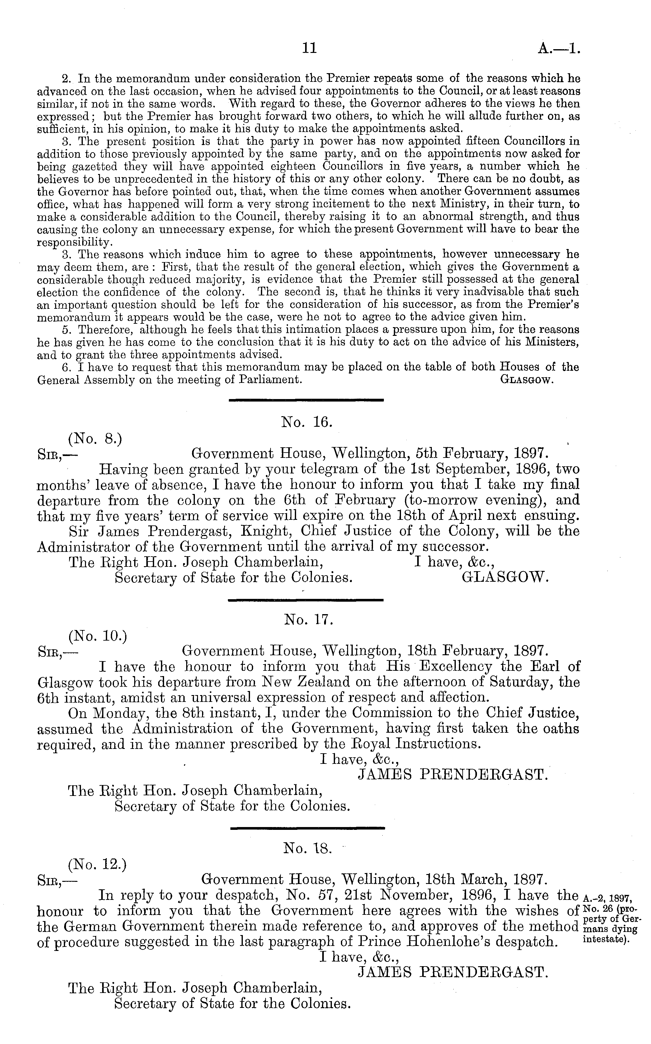 No. 17. (No. 10.) Sic, — Government House, Wellington, 18th February, 1897. I have the honour to inform you that His Excellency the Earl of Glasgow took his departure from New Zealand on the afternoon of Saturday, the 6th instant, amidst an universal expression of respect and affection. On Monday, the Bth instant, I, under the Commission to the Chief Justice, assumed the Administration of the Government, having first taken the oaths required, and in the manner prescribed by the Eoyal Instructions. I have, &c, JAMES PEENDEEGAST. The Eight Hon. Joseph Chamberlain, Secretary of State for the Colonies.