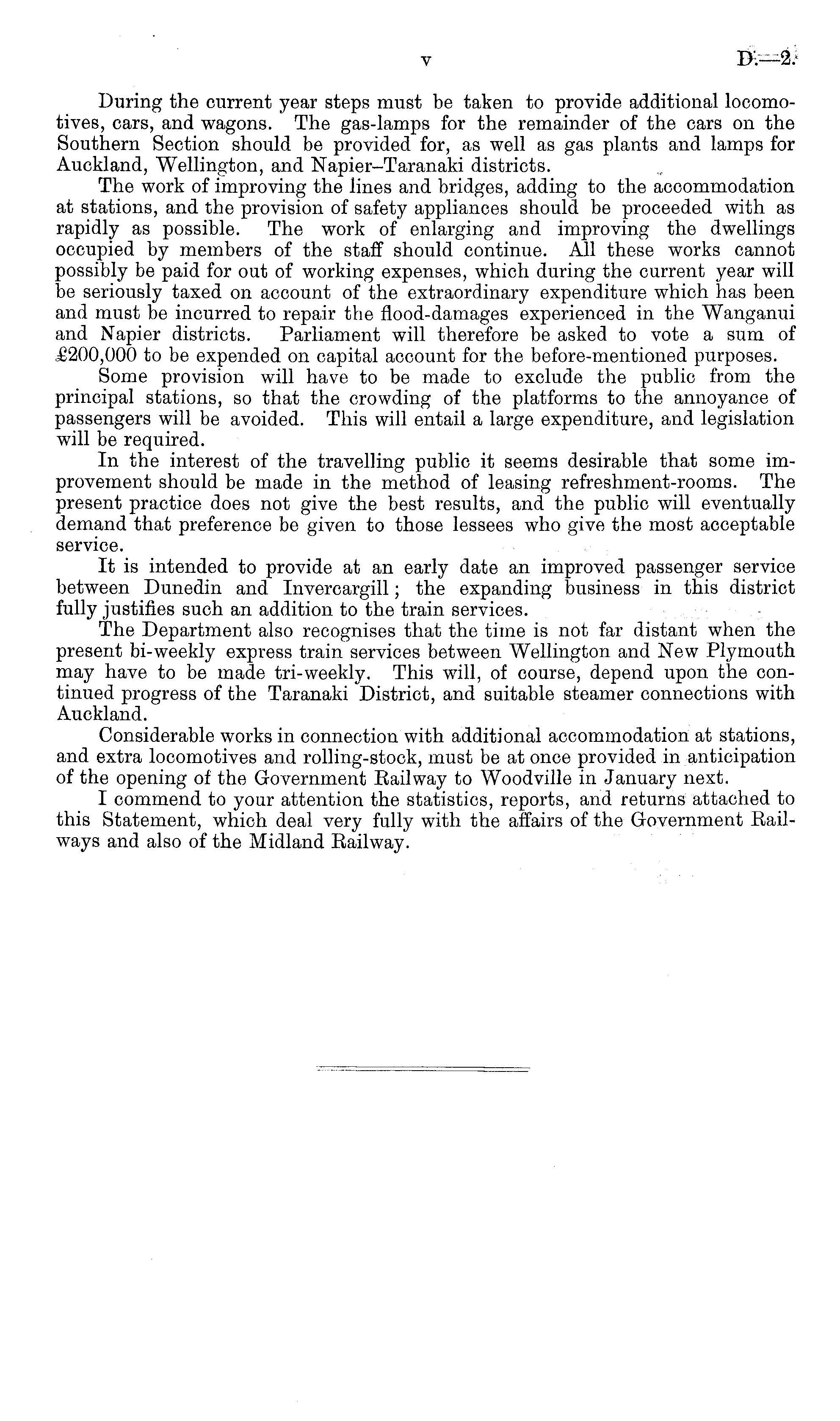 During the current year steps must be taken to provide additional locomotives, cars, and wagons. The gas-lamps for the remainder of the cars on the Southern Section should be provided for, as well as gas plants and lamps for Auckland, Wellington, and Napier-Taranaki districts. The work of improving the lines and bridges, adding to the accommodation at stations, and the provision of safety appliances should be proceeded with as rapidly as possible. The work of enlarging and improving the dwellings occupied by members of the staff should continue. All these works cannot possibly be paid for out of working expenses, which during the current year will be seriously taxed on account of the extraordinary expenditure which has been and must be incurred to repair the flood-damages experienced in the Wanganui and Napier districts. Parliament will therefore be asked to vote a sum of £200,000 to be expended on capital account for the before-mentioned purposes. Some provision will have to be made to exclude the public from the principal stations, so that the crowding of the platforms to the annoyance of passengers will be avoided. This will entail a large expenditure, and legislation will be required. In the interest of the travelling public it seems desirable that some improvement should be made in the method of leasing refreshment-rooms. The present practice does not give the best results, and the public will eventually demand that preference be given to those lessees who give the most acceptable service. It is intended to provide at an early date an improved passenger service between Dunedin and Invercargill; the expanding business in this district fully justifies such an addition to the train services. The Department also recognises that the time is not far distant when the present bi-weekly express train services between Wellington and New Plymouth may have to be made tri-weekly. This will, of course, depend upon the continued progress of the Taranaki District, and suitable steamer connections with Auckland. Considerable works in connection with additional accommodation at stations, and extra locomotives and rolling-stock, must be at once provided in anticipation of the opening of the Government Eailway to Woodville in January next. I commend to your attention the statistics, reports, and returns attached to this Statement, which deal very fully with the affairs of the Government Railways and also of the Midland Railway.