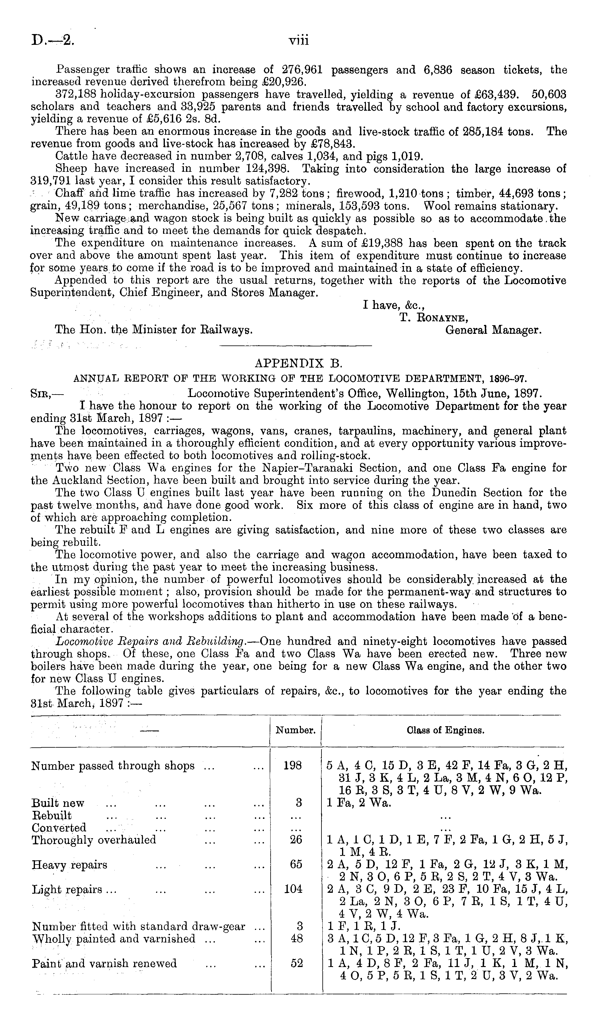 APPENDIX B. ANNXJAL REPORT OP THE WORKING OF THE LOCOMOTIVE DEPARTMENT, 1896-97. Sie, — Locomotive Superintendent's Office, Wellington, 15th June, 1897. I have the honour to report on the working of the Locomotive Department for the year ending 31st March, 1897 :— The locomotives, carriages, wagons, vans, cranes, tarpaulins, machinery, and general plant have been maintained in a thoroughly efficient condition, and at every opportunity various improvements have been effected to both locomotives and rolling-stock. Two new Class Wa engines for the Napier-Taranaki Section, and one Class Fa engine for the Auckland Section, have been built and brought into service during the year. The two Class D engines built last year have been running on the Dunedin Section for the past twelve months, and have done good work. Six more of this class of engine are in hand, two of which are approaching completion. The rebuilt F and L engines are giving satisfaction, and nine more of these two classes are being rebuilt. The locomotive power, and also the carriage and wagon accommodation, have been taxed to the utmost during the past year to meet the increasing business. In my opinion, the number of powerful locomotives should be considerably, increased at the earliest possible moment ; also, provision should be made for the permanent-way and structures to permit using more powerful locomotives than hitherto in use on these railways. At several of the workshops additions to plant and accommodation have been made of a beneficial character. Locomotive Repairs and Rebuilding. —One hundred and ninety-eight locomotives have passed through shops. Of these, one Class Fa and two Class Wa have been erected new. Three new boilers have been made during the year, one being for a new Class Wa engine, and the other two for new Class U engines. The following table gives particulars of repairs, &c, to locomotives for the year ending the 81st March, 1897 :—