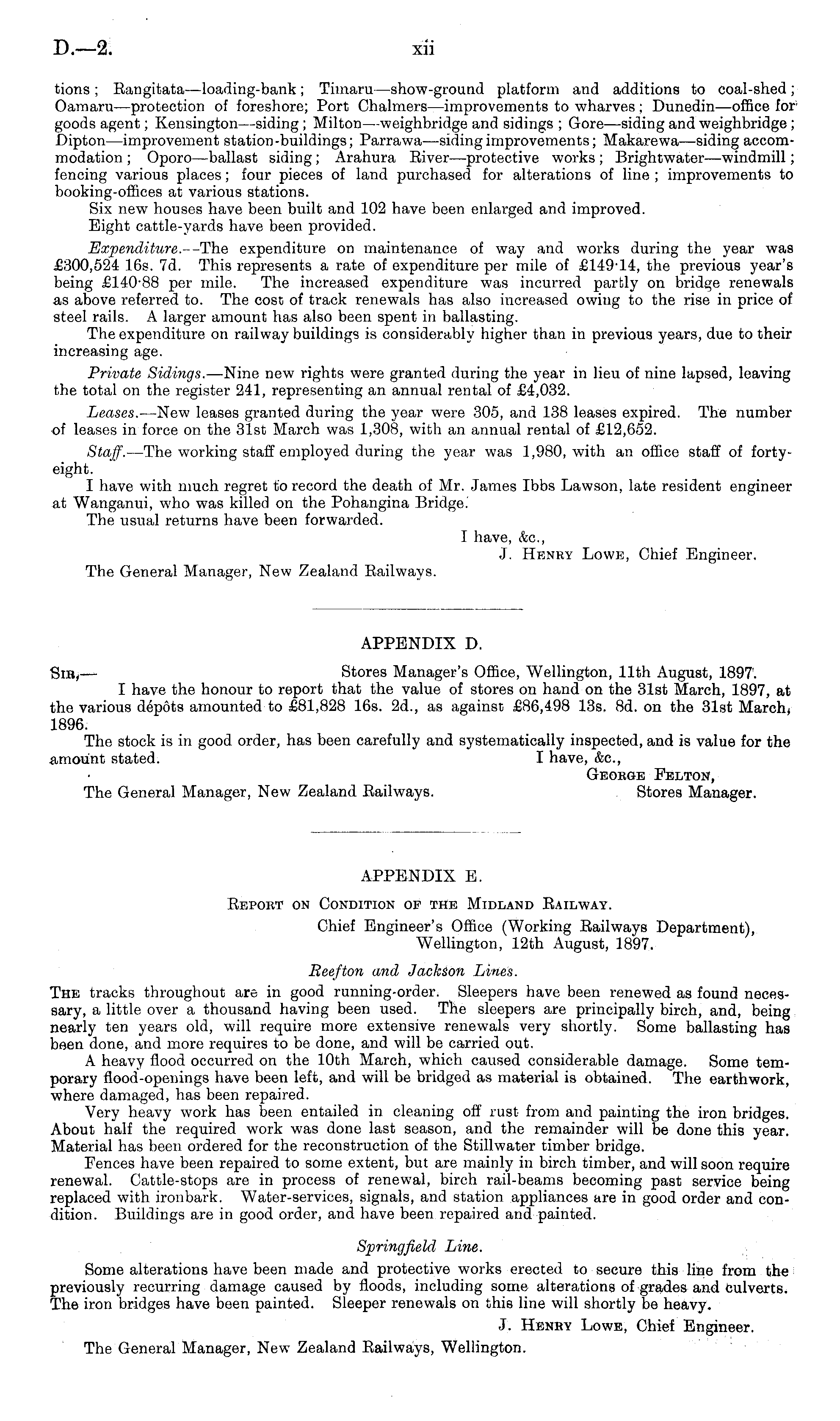 APPENDIX E. Report on Condition op the Midland Railway. Chief Engineer's Office (Working Railways Department), Wellington, 12th August, 1897. Beef ton and Jackson Lines. The tracks throughout are in good running-order. Sleepers have been renewed as found necessary, a little over a thousand having been used. The sleepers are principally birch, and, being nearly ten years old, will require more extensive renewals very shortly. Some ballasting has been done, and more requires to be done, and will be carried out. A heavy flood occurred on the 10th March, which caused considerable damage. Some temporary flood-openings have been left, and will be bridged as material is obtained. The earthwork, where damaged, has been repaired. Very heavy work has been entailed in cleaning off rust from and painting the iron bridges. About half the required work was done last season, and the remainder will be done this year. Material has been ordered for the reconstruction of the Stillwater timber bridge. Fences have been repaired to some extent, but are mainly in birch timber, and will soon require renewal. Cattle-stops are in process of renewal, birch rail-beams becoming past service being replaced with iroubark. Water-services, signals, and station appliances are in good order and condition. Buildings are in good order, and have been repaired and painted. Springfield Line. Some alterations have been made and protective works erected to secure this line from the previously recurring damage caused by floods, including some alterations of grades and culverts. The iron bridges have been painted. Sleeper renewals on this line will shortly be heavy. J. Henry Lowe, Chief Engineer. The General Manager, New Zealand Railways, Wellington.