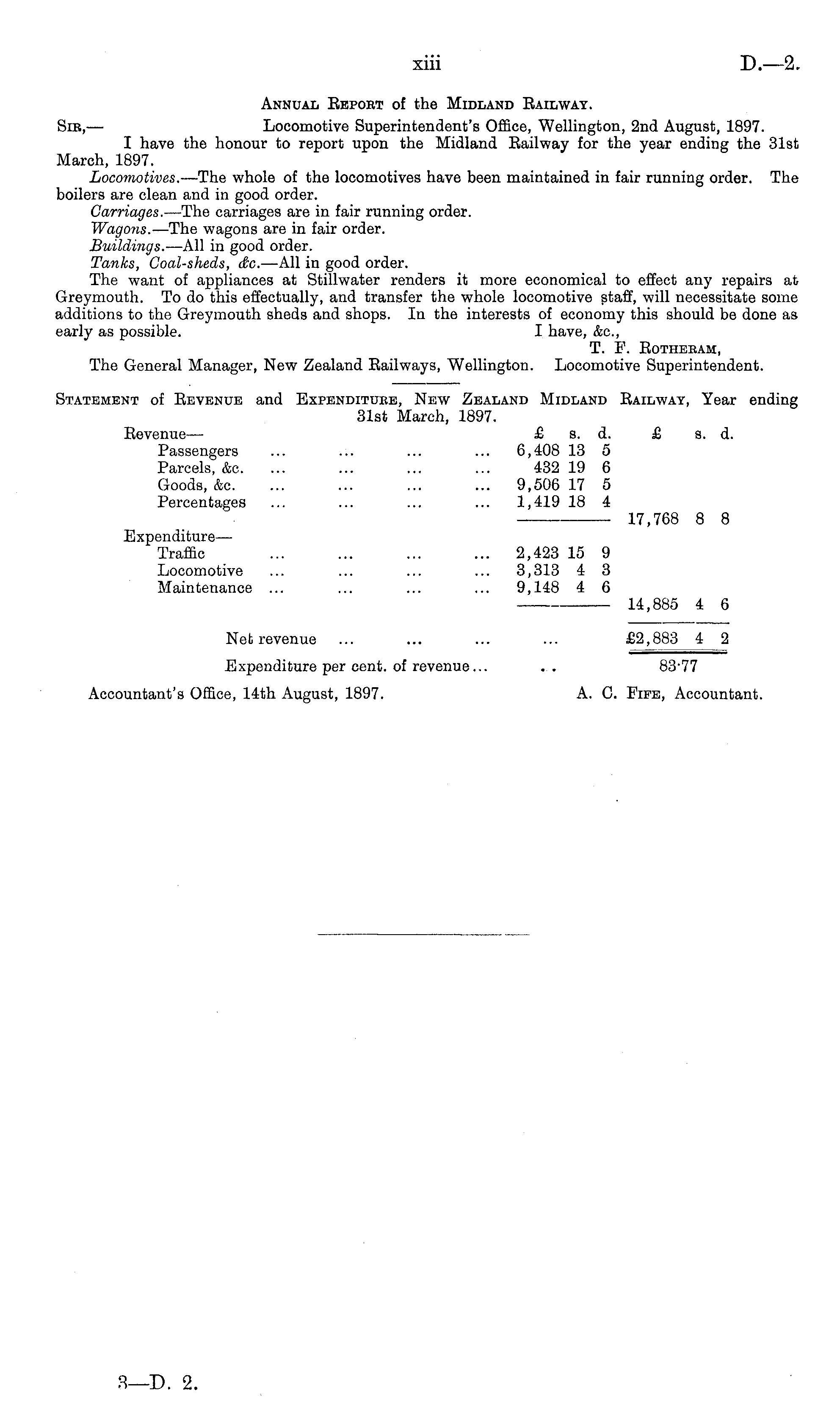 Annual Eeport of the Midland Eailwat. Sib, — Locomotive Superintendent's Office, Wellington, 2nd August, 1897. I have the honour to report upon the Midland Eailway for the year ending the 31st March, 1897. Locomotives. —The whole of the locomotives have been maintained in fair running order. The boilers are clean and in good order. Carriages. —The carriages are in fair running order. Wagons. —The wagons are in fair order. Buildings. —All in good order. Tanks, Coal-sheds, do. —All in good order. The want of appliances at Stillwater renders it more economical to effect any repairs at Greymouth. To do this effectually, and transfer the whole locomotive staff, will necessitate some additions to the Greymouth sheds and shops. In the interests of economy this should be done as early as possible. I have, &c, T. F. Rotheram, The General Manager, New Zealand Eailways, Wellington. Locomotive Superintendent.