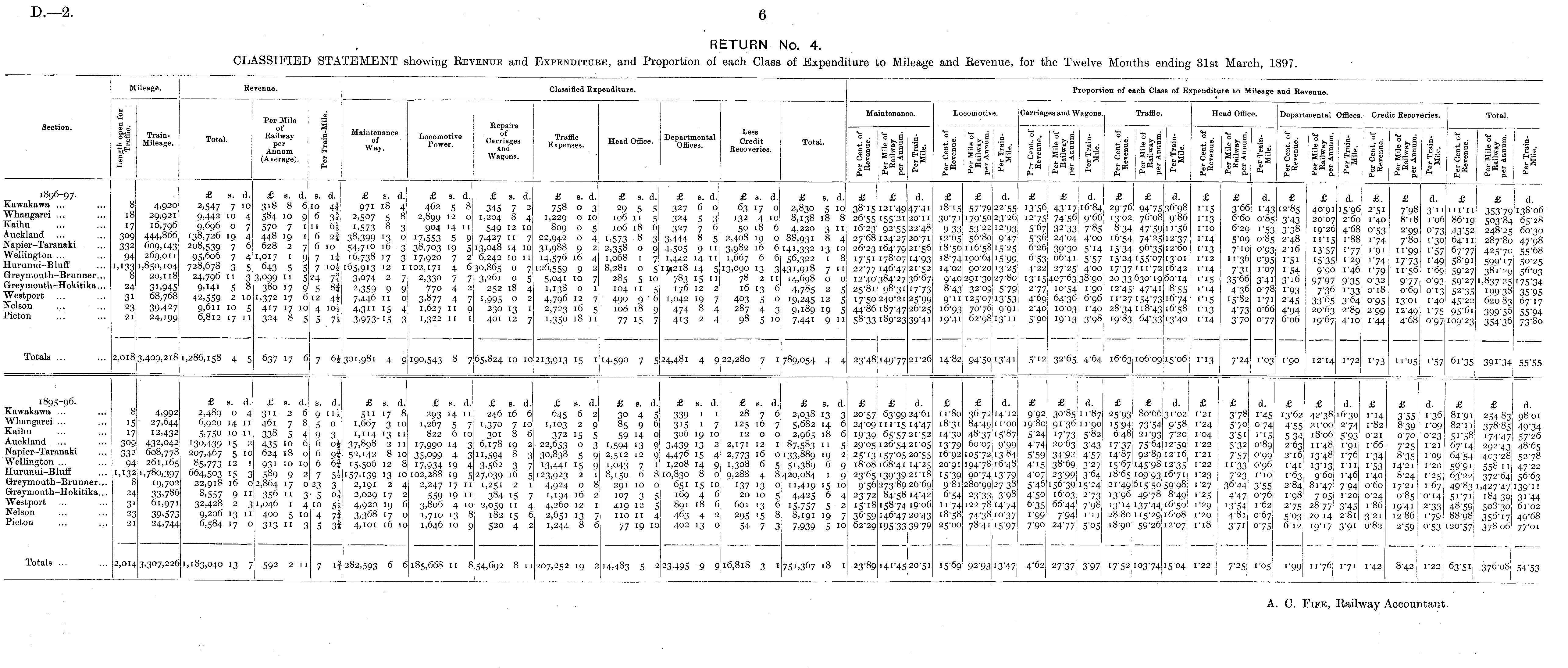RETURN No. 4. CLASSIFIED STATEMENT showing Revenue and Expenditure, and Proportion of each Class of Expenditure to Mileage and Revenue, for the Twelve Months ending 31st March, 1897.