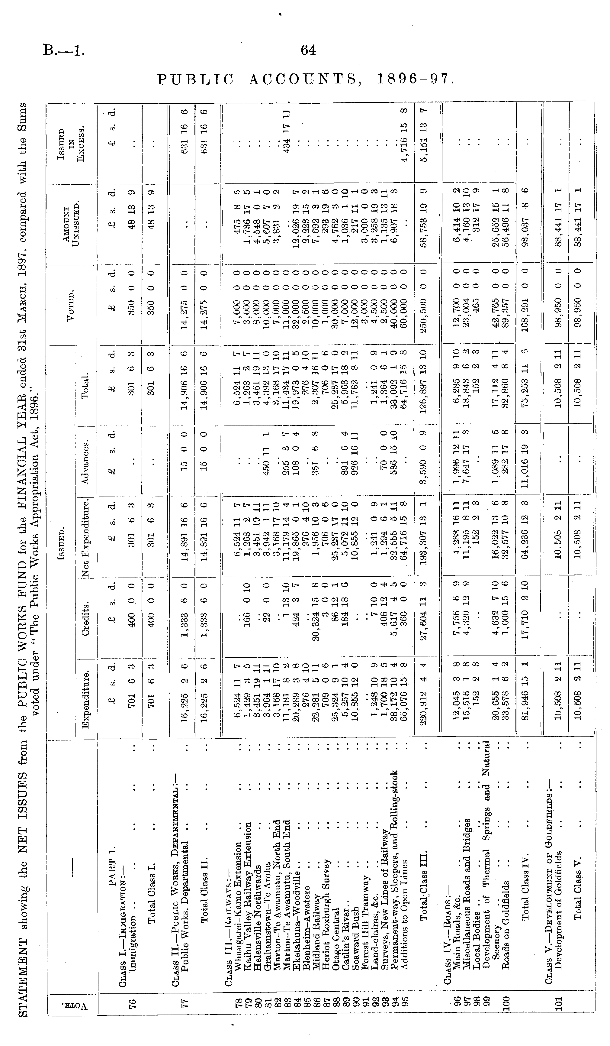 STATEMENT showing the NET ISSUES from the PUBLIC WORKS FUND for the FINANCIAL YEAR ended 31st March, 1897, compared with the Sums voted under "The Public Works Appropriation Act, 1896."