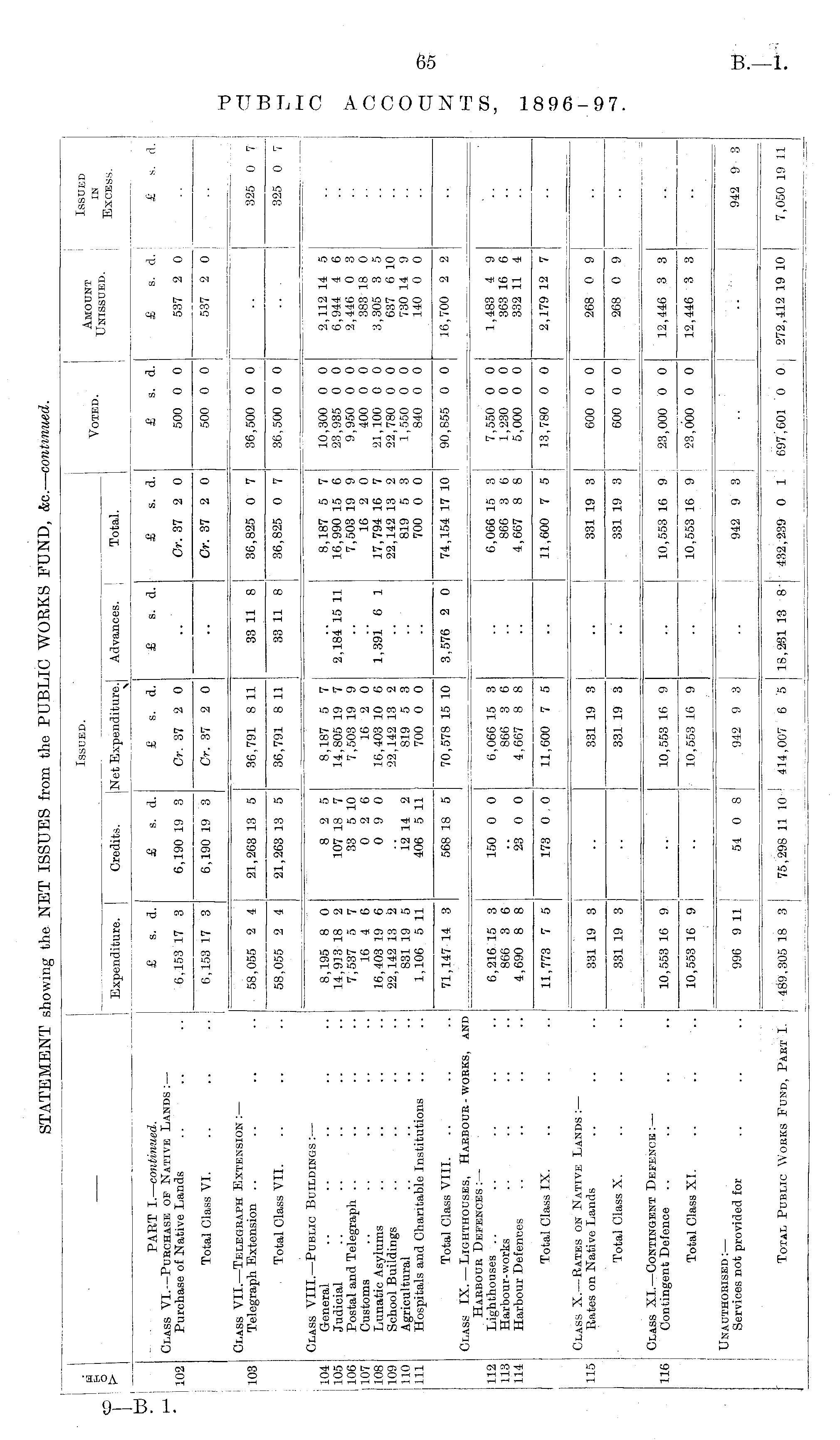 o > Expenditure. Issued. Voted. Amount Unissued. Issued in Excess. Credits. Net Expenditure. Advances. Total. PART I.— continued. Class VI. —Purchase of Native Lands :— Purchase of Native Lands £ s. d. £ s. d. £ s. d. £ s. d. £ s. d. Cr. 37 2 0 £ s. d. 500 0 0 . £ s. a. 537 2 0 £ s. d. 6,153 17 3 6,190 19 3 Cr. 37 2 0 102 Total Class VI. I 6,153 17 3 6,190 19 3 Cr. 37 2 0 Cr. 37 2 0 500 0 0 537 2 0 103 I Class VII. —Telegraph Extension :— Telegraph Extension 58,055 2 4 I 21,263 13 5 36,791 8 11 33 11 8 36,825 0 7 30,500 0 0 325 0 7 1 ! Total Class VII. 58,055 2 4 I 21,263 13 5 36,791 8 11 33 11 8 36,825 0 7 30,500 0 0 325 0 7 104 105 106 107 108 109 110 111 Class VIII. —Public Buildings :— General Judicial Postal and Telegraph Customs Lunatic Asylums School Buildings Agricultural Hospitals and Charitable Institutions 8,195 8 0 14,913 18 2 7,537 5 7 16 4 6 16,403 19 6 22,142 13 2 831 19 5 1,106 5 11 8 2 5 107 18 7 33 5 10 0 2 6 0 9 0 8,187 5 7 14,805 19 7 7,503 19 9 16 2 0 16,403 10 6 22,142 13 2 819 5 3 700 0 0 2,184 15 11 8,187 5 7 16,990 15 6 7,503 19 9 16 2 0 17,794 16 7 22,142 13 2 819 5 3 700 0 0 10,300 0 0 23,935 0 0 9,950 0 0 400 0 0 21,100 0 0 22,780 0 0 1,550 0 0 840 0 0 2,112 14 5 6,944 4 6 2,446 0 3 383 18 0 3,305 3 5 637 6 10 730 14 9 140 0 0 1,391 6 1 12 14 2 406 5 11 Total Class VIII. 71,147 14 3 568 18 5 70,578 15 10 3,576 2 0 74,154 17 10 90,855 0 0 16,700 2 2 112 113 114 Class IX. — Lighthouses, Haeboub - works, and Haeboue Defences :— Lighthouses Harbour- works Harbour Defences 6,216 15 3 866 3 6 4,690 8 8 150 0 0 0,066 15 3 866 3 6 4,667 8 8 6,066 15 3 866 3 6 4,667 8 8 7,550 0 0 1,230 0 0 5,000 0 0 1,483 4 9 363 16 6 332 11 4 23 0 0 Total Class IX. 11,773 7 5 173 0 0 11,600 7 5 11,600 7 5 13,780 0 0 2,179 12 7 Class X. —Rates on Native Lands :— Rates on Native Lands 115 331 19 3 331 19 3 331 19 3 000 0 0 268 0 9 Total Class X. 331 19 3 | 331 19 3 331 19 3 600 0 0 268 0 9 116 Class XL —Contingent Defence :— Contingent Defence Total Class XI. 10,553 16 9 10,553 16 9 10,553 16 9 23,000 0 0 12,446 3 3 10,553 16 9 ; 10,553 16 9 10,553 16 9 23,000 0 0 12,446 3 3 : Unauthorised :— Services not provided for .. 996 9 11 54 0 8 942 9 3 942 9 3 942 9 3 . ... Total Public Works Fund, Past I. 489,305 18 3 75,298 11 10 ! 414,007 6 5 18,231 13 8" 432,239 0 1 697,601 0 0 272,412 19 10 7,050 19 11