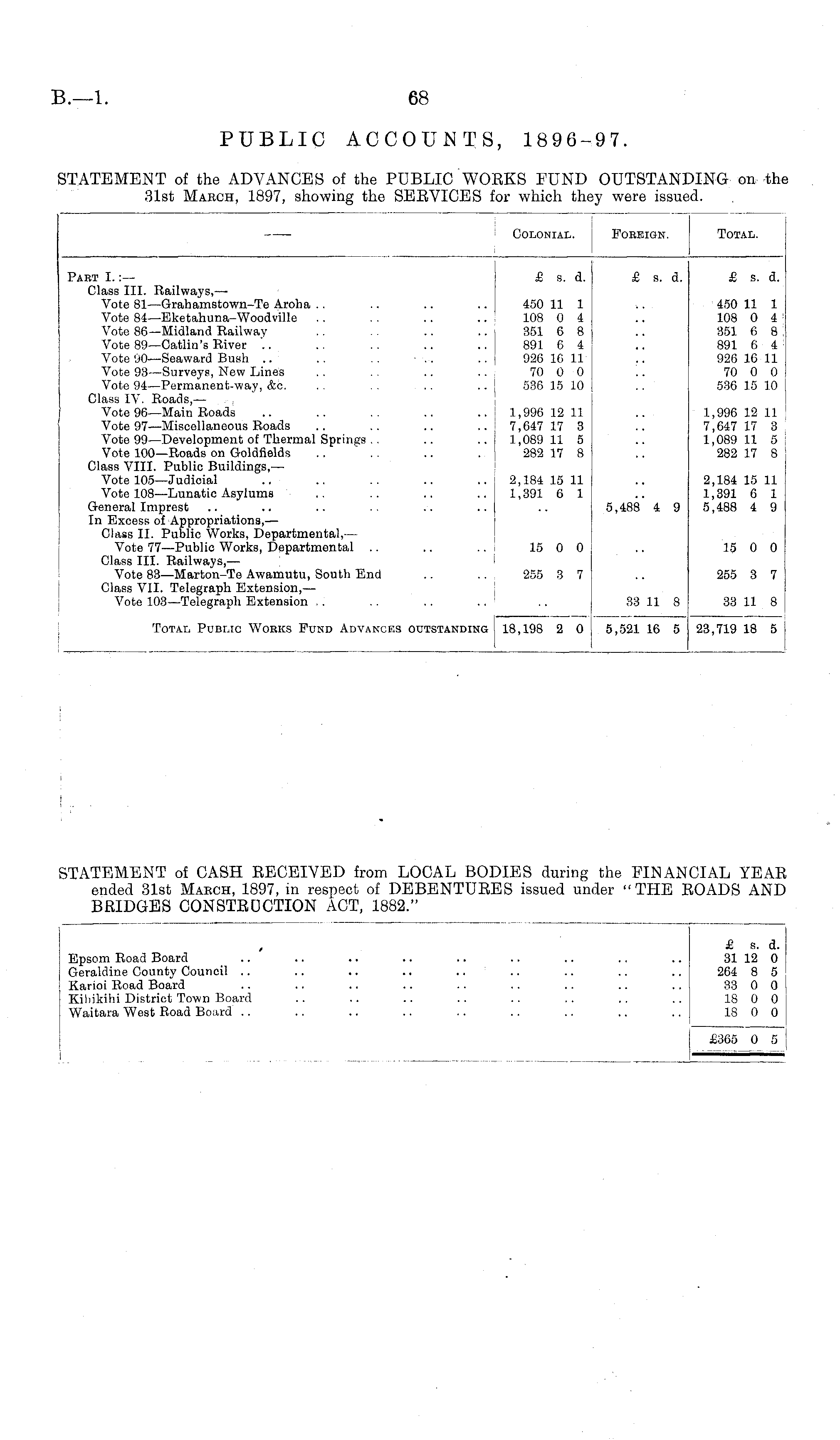 Colonial. Foreign. Total. Part I.:— £ s. d. Class III. Railways,— Vote 81—Grahamstown-Te Aroha .. .. .. .. 450 11 1 Vote 84—Eketahuna-Woodville .. .. .. .. 108 0 4 Vote 86—Midland Railway .. .. .. .. 351 6 8 Vote 89—Catlin's River .. .. .. .. .. 891 6 4 Vote 90—Seaward Bush .. .. .. ■ .. ..j 926 10 11 Vote 93—Surveys, New Lines .. .. .. 70 0 0 Vote 94—Permanent-way, &c. .. .. .. .. 536 15 10 Class IV. Roads, — Vote 96—Main Roads .. .. .. .. .. 1,996 12 11 Vote 97—Miscellaneous Roads .. .. .. .. 7,647 17 3 Vote 99—Development of Thermal Springs . . .. .. 1,089 11 5 Vote 100—Roads on Goldfields .. .. .. . 282 17 8 Class VIII. Public Buildings,— Vote 105—Judicial .. .. .. .. .. 2,184 15 11 Vote 108—Lunatic Asylums .. .. .. .. 1,391 6 1 General Imprest In Excess of Appropriations,— Class II. Public Works, Departmental,-— Vote 77—Public Works, Departmental .. .. .. 15 0 0 Class III. Railways,— Vote 83—Marton-Te Awamutu, South End .. .. 255 3 7 Class VII. Telegraph Extension, — Vote 103 —Telegraph Extension .. .. .. .. £ s. d. £ s. d. 450 11 1 108 0 4 351 6 8 891 6 4 926 16 11 70 0 0 536 15 10 1,996 12 11 7,647 17 3 1,089 11 5 282 17 8 5,488 4 9 2,184 15 11 1,391 6 1 5,488 4 9 15 0 0 255 3 7 33 11 8 33 11 8 Total Public Works Fund Advances outstanding | 18,198 2 0 I 5,521 16 5 23,719 18 5