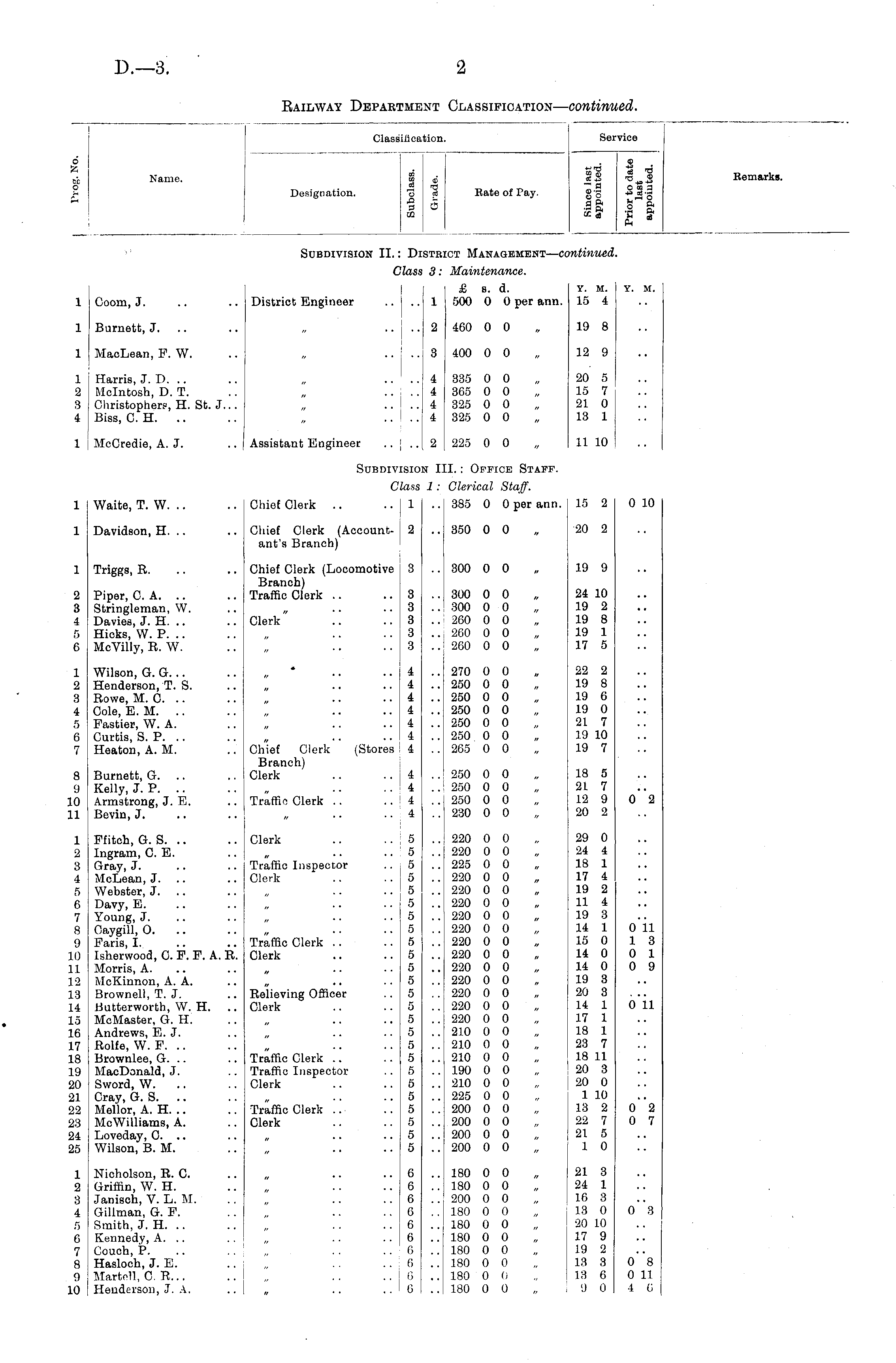 ! o o Name. Designation. Classiiioation. & ■j: if Service o ta a Remarks. 5 Rate of Pay. Subdivision II.: C Di: its: [ct Management— co mtinued, 'lass 3: Maintenance. Coom, J. District Engineer £ s. d. 500 0 0 per ann. Y. M. 15 4 Y. M. 1 1 1 Burnett, J. 2 460 0 0 19 8 1 MacLean, P. W. 3 400 0 0 12 9 1 2 3 4 Harris, J. I). .. Mclntosh, D. T. Christopher?, H. St. J... Biss, C. H. .. 4 i 4 4 335 0 0 365 0 0 325 0 0 325 0 0 20 5 15 7 21 0 13 1 » 1 MeCredie, A. J. Assistant Engineer 2 225 0 0 11 10 SUBDIVI [Sio: i: !I. : Office Staff. Waits, T. W. .. C, Chief Clerk lass 1 1: Clerical Staff. 385 0 0 per ann. 15 2 1 0 10 1 Davidson, H. .. Chief Clerk (Accountant's Branch) 2 350 0 0 20 2 Triggs, R Chief Clerk (Locomotive Branch) Traffic Clerk .. 3 300 0 0 19 9 1 2 :s 4 5 6 Piper, C. A. .. Stringleraan, W. Davies, J. H. .. Hicks, W. P. .. McVilly, R. W. Clerk" '.'. '.'A 3 3 3 3 3 300 0 0 300 0 0 260 0 0 260 0 0 260 0 0 24 10 19 2 19 8 19 1 17 5 1 2 3 4 5 6 7 Wilson, G. G. .. Henderson, T. S. Rowe, M. C. .. Cole, E. M. .. Fastier, W. A. Curtis, S. P. .. Heaton, A. M. m 4 4 4 i i 4 4 270 0 0 250 0 0 250 0 0 250 0 0 250 0 0 250 0 0 265 0 0 22 2 19 8 19 6 19 0 21 7 19 10 19 7 Chief Clerk (Stores Branch) Clerk 8 9 .0 .1 Burnett, G. .. Kelly, J. P. .. Armstrong, J. E. Bevin, J. Traffifi Clerk 4 4 4 4 250 0 0 250 0 0 250 0 0 230 0 0 18 5 21 7 12 9 20 2 0 - 2 1 2 3 4 5 6 7 8 9 L0 LI l2 L3 14 L5 L6 L7 L8 L9 20 21 22 23 24 25 Ffitch, G. S. .. Ingram, G. E. Gray, J. McLean, J. Webster, J. Davy, E. Young, J. Oaygill, 0. Faris, I. Isherwood, C. P. F. A. R. Morris, A. McKinnon, A. A. Brownell, T. J. Butterworth, W. H. .. McMaster, G. H. Andrews, E. J. Rolfe, W. F. .. Brownlee, G. .. MacDonald, J. Sword, W. Cray, G. S. Mellor, A. H. .. McWilliams, A. Loveday, C. .. Wilson, B. M. Clerk Traffic Inspector Clerk • • I Traffic Clerk '.'. Clerk Relieving Officer Clerk 5 5 5 5 5 5 5 5 5 5 5 5 5 5 5 5 5 5 5 5 5 5 5 5 5 220 0 0 220 0 0 225 0 0 220 0 0 220 0 0 220 0 0 220 0 0 220 0 0 220 0 0 220 0 0 220 0 0 220 0 0 220 0 0 220 0 0 220 0 0 210 0 0 210 0 0 210 0 0 190 0 0 210 0 0 225 0 0 200 0 0 200 0 0 200 0 0 200 0 0 29 0 24 4 18 1 17 4 19 2 11 4 19 3 14 1 15 0 14 0 14 0 19 3 20 3 14 1 17 1 18 1 23 7 18 11 20 3 20 0 1 10 13 2 22 7 21 5 1 0 0 11 1 3 0 1 0 9 oil Traffic Clerk Traffic Inspector Clerk Traffic Clerk .. Clerk 0 2 0 7 1 2 3 4 5 6 7 8 9 .0 Nicholson, R. C. Griffin, W. H. Janisch, V. L. M. Giilman, G. F. Smith, J. H. .. Kennedy, A. .. Couch,P. Hasloch, J. E. Martoll, C "R... Henderson, J. A. 6 6 6 6 6 6 6 6 G 6 180 0 0 180 0 0 200 0 0 180 0 0 180 0 0 180 0 0 180 0 0 180 0 0 180 0 (/ 180 0 0 21 3 24 1 16 3 13 0 ■20 10 17 9 19 2 13 3 13 6 9 0 0 3 0 8 0 11 4 G .. I