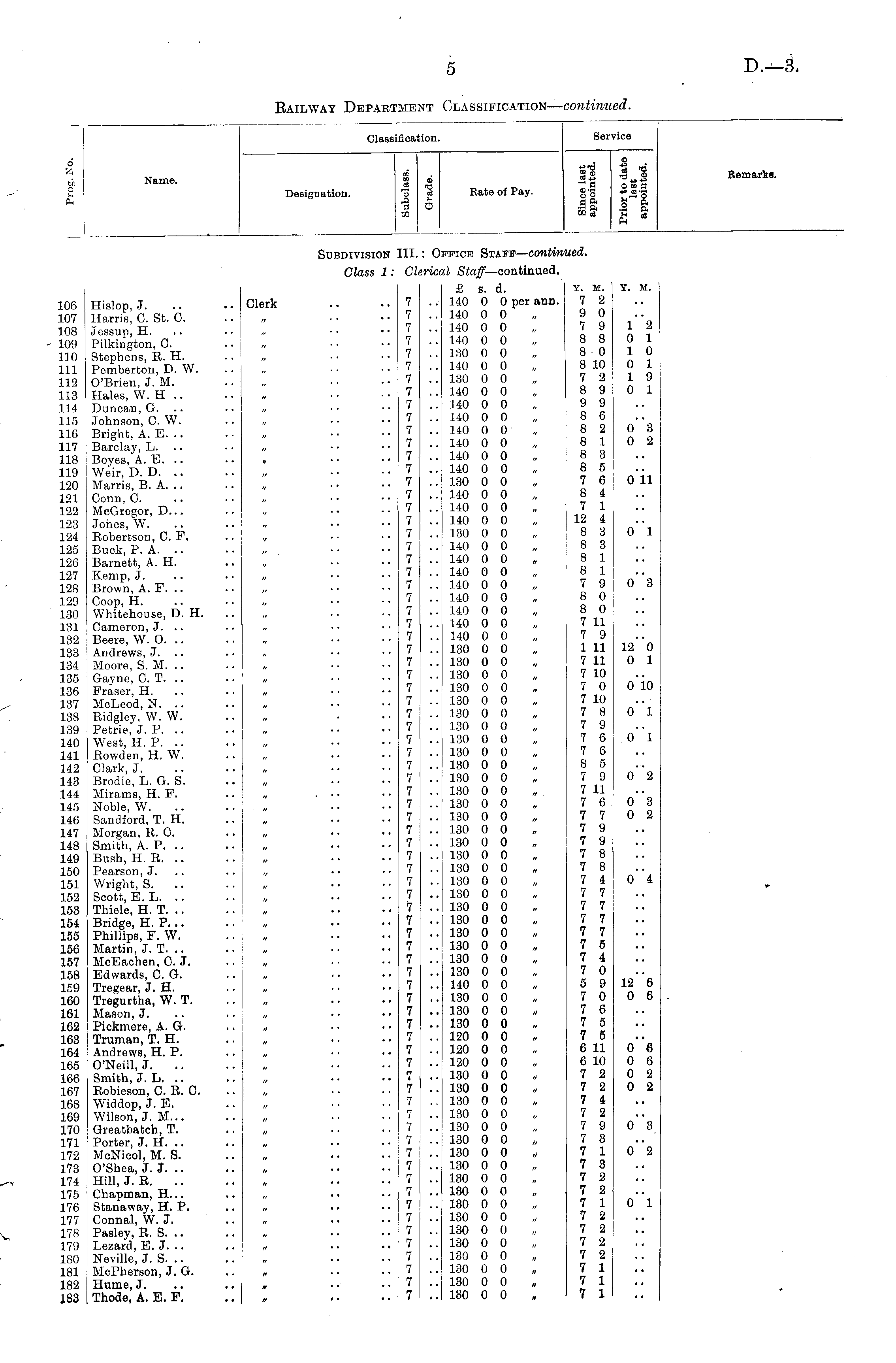 d •A o £ j Name. Designation. Classificai I I CO jion. 1 s Rate of Pay. II ij •I «ii I! I I Service Remarks. Subdivision :n. : 0 fFicE Staff — contir. lUed. Class 1: ci '.rice X Staff— continued. 106 107 108 109 110 111 112 113 114 115 116 117 118 119 120 121 122 123 124 125 126 127 128 129 130 181 132 133 134 135 136 137 138 139 140 141 142 143 144 145 146 147 148 149 150 151 152 153 154 155 156 157 158 1£9 160 161 162 163 164 165 166 167 168 169 170 171 172 173 174 175 176 177 178 179 180 181 182 183 Hislop, J. Harris, C. St. C. jessup, H. Pilkington, G. Stephens, E. H. Pemberton, D. W. O'Brien, J. M. Hales, W. H .. Duncan, G. Johnson, C. W. Bright, A. E. .. Barclay, L. Boyes, A. E. .. Weir, D. D. .. Marris, B. A. .. Conn, C. McGregor, D... Jones, W. Eobertson, C. F. Buck, P. A. .. Barnett, A. H. Kemp, J. Brown, A. F. .. Coop, H. Whitehouse, D. H. Cameron, J. .. Beere, W. O. .. Andrews, J. Moore, S. M. .. Gayne, C. T. .. Fraser, H. McLeod, N. .. Ridgley, W. W. Petrie, J. P. .. West, H. P. .. Rowden, H. W. Clark, J. Brodie, L. G. S. Mirams, H. F. Noble, W. Sandford, T. H. Morgan, E. C. Smith, A. P. .. Bush, H. R. .. Pearson, J. Wright, S. Scott, E. L. .. Thiele, H. T. .. Bridge, H. P... Phillips, F. W. Martin, J. T. .. McEaohen, C. J. Edwards, C. G. Tregear, J. H. Tregurtha, W. T. Mason, J. Pickmere, A. G-. Truman, T. H. Andrews, H. P. O'Neill, J. Smith, J. L. Robieson, C. E. C. Widdop, J. E. Wilson, J. M... Greatbatch, T. Porter, J. H. McNicol, M. S. O'Shea, J. J. .. Hill, J. R. Chapman, H... Stanaway, H. P. Connal, W. J. Pasley, R. S. .. Lezard, E. J. .. Neville, J. S. .. McPherson, J. G. Hume, J. Thode, A. E. F. | ■ • I 4 t I Clerk n 7 7 7 7 7 7 7 7 7 7 7 7 7 7 7 7 7 7 7 7 7 7 7 7 7 7 7 7 7 7 7 7 7 7 7 7 7 V 7 7 7 7 7 7 7 7 7 7 7 7 7 7 7 7 7 7 7 n 7 7 rI 7 7 r- ( 7 7 7 7 7 7 7 7 7 7 7 7 7 7 £ s. d. 140 0 0 per arm. 140 0 0 140 0 0 140 0 0 130 0 0 140 0 0 130 0 0 140 0 0 140 0 0 140 0 0 140 0 0 140 0 0 140 0 0 140 0 0 130 0 0 140 0 0 140 0 0 140 0 0 130 0 0 140 0 0 140 0 0 140 0 0 140 0 0 140 0 0 140 0 0 140 0 0 140 0 0 130 0 0 130 0 0 130 0 0 130 0 0 130 0 0 130 0 0 130 0 0 130 0 0 130 0 0 130 0 0 130 0 0 130 0 0 130 0 0 130 0 0 130 0 0 130 0 0 130 0 0 130 0 0 130 0 0 130 0 0 130 0 0 130 0 0 130 0 0 130 0 0 130 0 0 130 0 0 140 0 0 130 0 0 130 0 0 130 0 0 120 0 0 120 0 0 120 0 0 130 0 0 a 130 0 0 130 0 0 130 0 0 130 0 0 130 0 0 ,, 130 0 0 a 130 0 0 130 0 0 130 0 0 130 0 0 130 0 0 130 0 0 130 0 0 180 0 0 130 0 0 130 0 0 130 0 0 Y. M. 7 2 9 0 7 9 8 8 8 0 8 10 7 2 : 8 9 9 9 8 6 8 2 8 1 8 3 8 5 7 6 8 4 7 1 12 4 8 3 8 3 8 1 8 1 7 9 8 0 8 0 7 11 . 7 9 1 11 7 11 7 10 7 0 7 10 7 8 7 9 7 6 7 6 8 5 7 9 7 11 7 6 7 7 7 9 7 9 7 8 7 8 7 4 7 7 7 7 7 7 7 7 7 5 7 4 7 0 5 9 7 0 7 6 7 5 7 5 6 11 6 10 7 2 7 2 7 4 7 2 7 9 7 3 7 1 7 3 7 2 7 2 7 1 7 2 7 2 7 2 7 2 7 1 7 1 7 1 Y. M. 1 2 0 1 1 0 0 1 1 9 0 1 0*3 0 2 oil 0 1 o'*3 12*0 0 1 o'io o i o"i o"2 o"s 0 2 04 12~ 6 0 6 0 6 0 6 0 2 0 2 0 - 3 a o"2 0 1