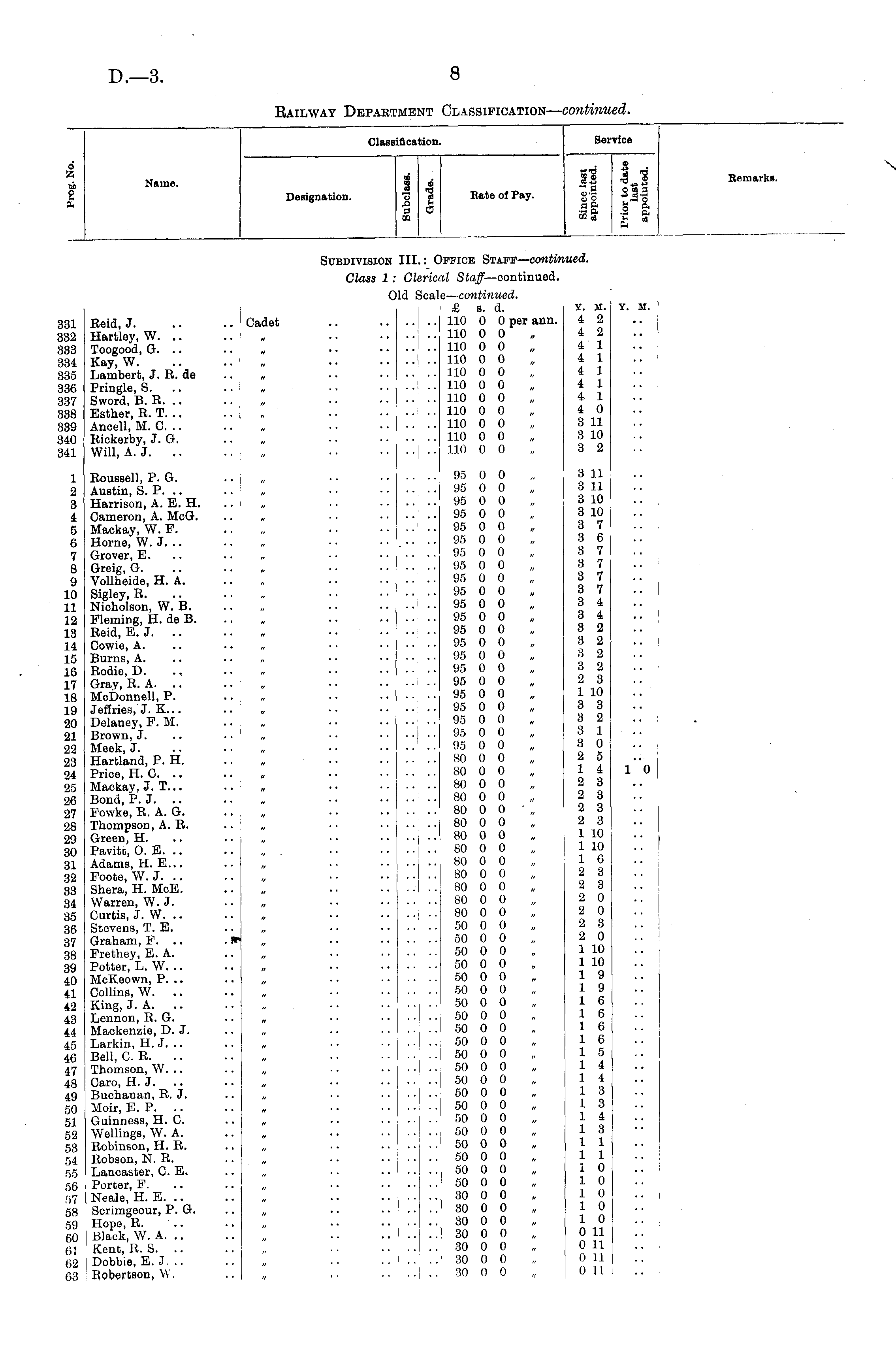 Classincatio] ler lea y, Name. Designation. i 2 3 EC 6 I 0 Bate of Pay. if sa| Remarks. 181 183 188 184 188 186 187 188 189 140 Ml Reid, J. Hartley, W. .. Toogood, G. .. Kay, W. Lambert, J. R. de Pringle, S. Sword, B. R. Esther, R. T. .. Ancell, M. C. .. Rickerby, J. G. Will, A. J. .. .. Cadet • • H Subdivision Class 1 : r L III.: Office Staff— continued. Clerical Staff —continued. lid Scale— continued. £ s. d. Y. m. .. .. 110 0 0 per arm. 4 2 .... 110 0 0 , 4 2 .... 110 0 0 , 4 1 .... 110 0 0 , 41 .... 110 0 0 „ 41 .... 110 0 0 „ 4 1 .... 110 0 0 „ 4 1 .... 110 0 0 , 40 .... 110 0 0 „ 3 11 .... 110 0 0 „ 3 10 .... 110 0 0 „ 3 2 y. m. 1 2 3 i 5 6 7 8 9 10 11 IS 18 14 15 Lβ 17 18 L9 20 21 29 23 34 3(i 26 ■11 •m 29 30 81 32 33 84 35 Bβ 87 88 89 40 U 4:2 43 14 45 46 ■17 48 49 50 51 r,-i 53 54 55 56 l>7 58 59 60 61 62 Roussell, P. G. Austin, S. P. Harrison, A. E. H. Cameron, A. McG. Mackay, W. P. Home, W. J. .. Grover, E. Greig, G. Vollheide, H. A. Sigley, R. Nicholson, W. B. Fleming, H. de B. Reid, E. J. .. Cowie, A. Burns, A. Rodie, D. Gray, R. A. McDonnell, P. Jefiries, J. K... Delaney, F. M. Brown, J. Meek, J. Hartland, P. H. Price, H. 0. .. Mackay, J. T... Bond, P. J. Fovvke, R. A. G. Thompson, A. R. Green, H. PaviU, O. E. Adams, H. E... Foote, W. J. .. Shera, H. McE. Warren, W. J. Curtis, J. W. .. Stevens, T. B. Graham, F. .. Frethey, E. A. Potter, L. W. .. MoKeown, P. .. Collins, W. .. King, J. A. Lennon, R. G. Mackenzie, D. J. Larkin, H. J. Bell, C. R. Thomson, W. .. Caro, H. J. Buchanan, R. J. Moir, E. P. Guinness, H. C. Wellings, W. A. Robinson, H. R. Robson, N. R. Lancaster, C. E. Porter, F. Neale, H. E. .. Scrimgeour, P. G. Hope, R. Black, W. A. Kent, B. S. .. Dobbie, E. J. .. Robertson, VV. • • W • • II .... 95 0 0 „ 3 11 .... 95 0 0 „ 311 .... 95 0 0 „ 3 10 .... 95 0 0 , 3 10 .... 95 0 0 „ 37 .... 95 0 0 „ 36 ' .... 95 0 0 „ 37 ..... 95 0 0 „ 3 7 .; .. 95 0 0 „ 3 7 .... 95 0 0 „ 3 7 .... 95 0 0 „ 34 .... 95 0 0 „ 34 .... 95 0 0 . 3 2 .... 95 0 0 „ 3 2 .... 95 0 0 . 32 .... 95 0 0 „ 3 2 ..! .. 95 0 0 , 2 3 .... 95 0 0 „ 1 10 ..| .. 95 0 0 , 3 3 ..i .. 95 0 0 „ 3 2 .. i .. 95 0 0 , 3 1 .... 95 0 0 . 3 0 .... 80 0 0 „ 2 5 .... 80 0 0 „ 14 .... 60 0 0 „ 2 3 .... 80 0 0 „ 2 3 .... 80 0 0 "„ 23 ... 80 0 0 „ 2 3 .... 80 0 0 „ 1 10 .... 80 0 0 „ 1 10 .... 80 0 0 „ 16 .... 80 0 0 „ 23 .... 80 0 0 . 2 3 .... 80 0 0 , 2 0 ..; .. 80 0 0 „ 2 0 .... 50 0 0 , 2 3 .... 50 0 0 „ 20 .... 50 0 0 „ 1 10 .... 50 0 0 . 1 10 .... 50 0 0 „ 19 .... 50 0 0 „ 19 .... 50 0 0 „ 16 .... 50 0 0 „ 16 .... 50 0 0 „ 16 .... 50 0 0 „ i 1 6 .... 50 0 0 „ 15 .... I 50 0 0 „ 14 .... 50 0 0 „ 14 .... 50 0 0 „ 13 .... 50 0 0 „ 13 .... 50 0 0 „ 14 .... 50 0 0 , 13 .... 50 0 0 „ 11 .... 50 0 0 „ 11 .... 50 0 0 „ 10 .... 50 0 0 . 10 .... 30 0 0 „ 10 .... 30 0 0 „ 10 .... 30 0 0 „ 10 .... 30 0 0 , 0 11 .... 30 0 0 „ 0 11 .. ..! 30 0 0 „ 0 11 ..[..' 30 0 0 ,. 0 11 ::]:: 10 " I ■ ■ ! • .. .. ..