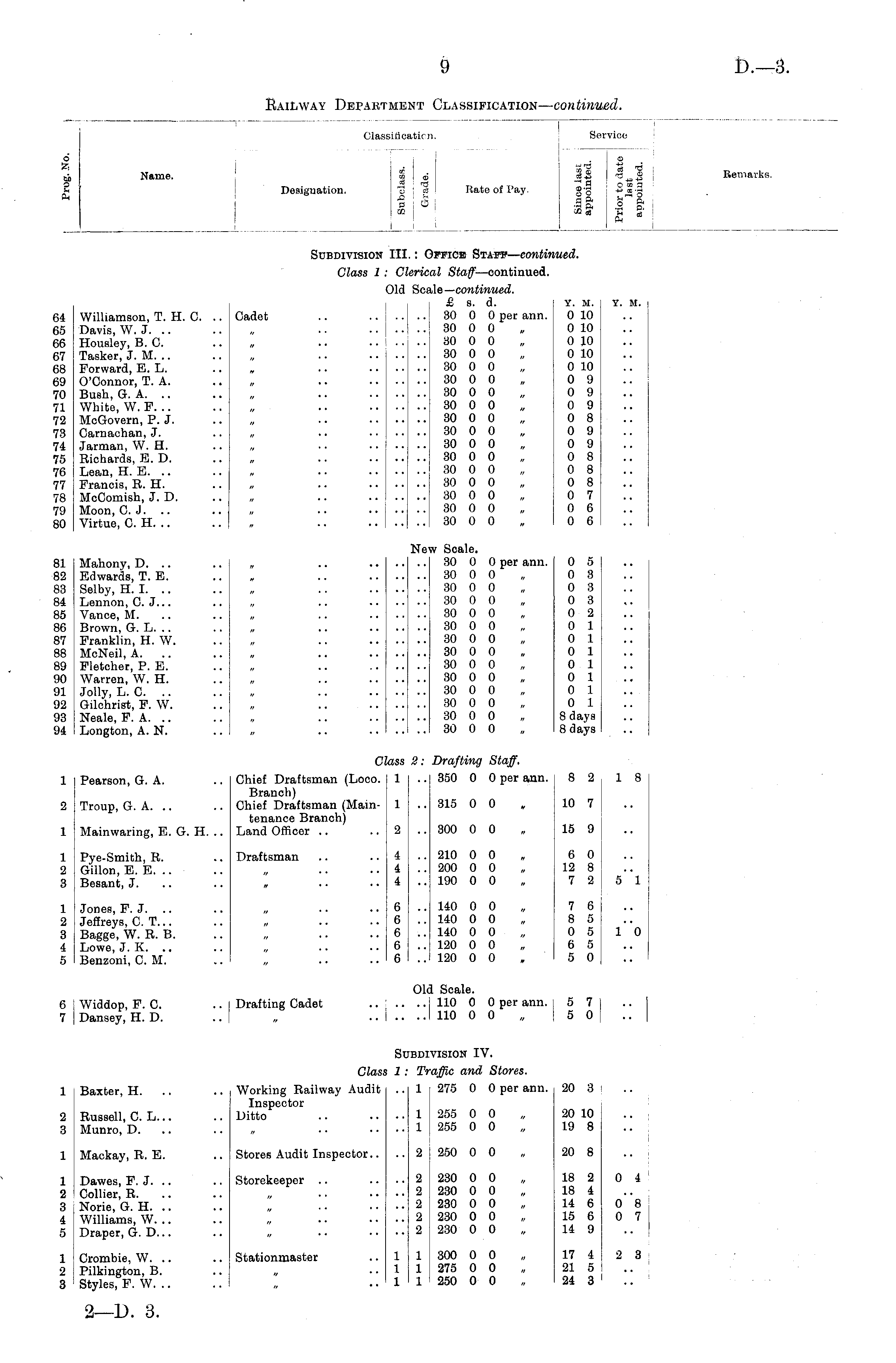 I i 6 Sβ Classilicatirn. Service -■a I ■« Name. 1 * J* i e^ Designation. "3 i s Rate o( Pay. g-g i S S3 Is ills j ; ! _J ? L_ Name. 1 i Designation. Classiii D B i E a I Remarks. Subdivision III.: Office Staff— continued. :.: < Class 1 : Clerical Staff —continued. leric Old Scale— continued, I £, s. d. i Y. m. i Y. M. j Williamson, T. H. C. .. Cadet .. 30 0 0 pec ann. j 0 10 j Davis, W. J. .. .. „ ■• I 30 0 0 „ 0 10 Housley, B.C. .. . .. ...... 30 0 0 . 0 10 Tasker, J. M. .. .. „ .. 30 0 0 „ 0 10 Forward, E. L. .. „ .. 30 0 0 „ 0 10 O'Connor, T. A. .. , .. 30 0 0 „ | 0 9 Bush, G. A. .. .. . .. 30 0 0 „ 0 9 White, W. F „ 30 0 0 „ ! 0 9 MoGovern, P. J. .. „ .. 30 0 0 „ 0 8 Carnachan, J. .. „ .. 30 0 0 , 0 9.. Jarman.W. H. .. „ 30 0 0 „ 0 9.. Richards, E. D. .. „ .. 30 0 0 „ 0 8.. Lean, H. E. .. .. „ .. 80 0 0 „ ! 0 8, .. Francis, B. H. .. . 30 0 0 „ 0 8 McComish, J. D. .. „ .. 30 0 0 „ 0 7 Moon, C.J. .. .. , .. 30 0 0 , j 0 6 Virtue, C. H. .. .. , .. 30 0 0 „ I 0 6 I Sci 11 Iβ Iβ 17 18 19 '0 1 ■2 '3 'i T> re •7 ■8 ".) SO New Scale. Mahony, D. .. .. „ .. 30 0 0 per ann. 0 5 1 Edwards, T. E. .. , .. 30 0 0 , 0 3 Selby, H. I. .. .. „ .. 30 0 0 , 0 3 Lennon, C. J... .. „ .. 30 0 0 „ 0 3 Vance, M. .. .. „ .. 30 0 0 , 0 2 Brown, G. L. .. .. . .. 30 0 0 „ 0 1.. Franklin, H. W. .. „ .. 30 0 0 „ 0 1 McNeil, A. .. .. „ .. 30 0 0 „ 0 1 Fletcher, P. E. .. „ .. 30 0 0 „ 0 1 Warren, W. H. .. , .. 30 0 0 , 0 1 Jolly, L. C. .. .. „ .. 30 0 0 , 0 1 Gilchrist, F. W. .. . .. 30 0 0 . 0 1 Neale, F. A. .. .. „ .. 30 0 0 , 8 daya Longton, A. N. .. „ .. 30 0 0 . 8 days I Nβ' 81 82 83 84 85 86 87 88 89 90 91 98 98 1)4 1 o Class 2: Drafting Staff, Pearson, G. A. .. Chief Draftsman (Loco. 1 .. 350 0 0 per ann. 8 2,18 Branch) Troup, G. A. .. .. Chief Draftsman (Main- 1 .. 315 0 0 , 10 7 tenance Branch) Mainwaring, E. G. H. .. Land Officer .. .. 2 .. 300 0 0 . 15 9 1 1 2 3 Pye-Smith, R. .. Draftsman .. .. 4 .. 210 0 0 , 6 0 Gillon.E. E .. .. 4 •• 200 0 0 , 12 8 Besant, J . . • .. 4 .. 190 0 0 . 7 2 | 5 1 1 2 3 4 5 Jones, F. J , .. .. 6 .. 140 0 0 „ 7 6 j Jeffreys, C. T .. 6 .. 140 0 0 . 8 5, Basse, W. R. B. .. „ .. .. 6 .. 140 0 0 „ 0 5 10 Lowe, J. K. .. .. , .. .. 6 .. 120 0 0 . 6 8 Benzoni, CM. .. „ .. .. 6 .. 120 0 0 , > 5 0 r> 7 Old Scale. Widdop, F. C. .. Drafting Cadet 110 0 0 per ann. j 5 7 Dansey, H. D. .. , 110 0 0 „ | 5 0 Subdivision IV. 1 Class 1 : Traffic and Stores. Baxter, H. .. .. Working Railway Audit .. 1 275 0 0 per ann. 20 3 Inspector Russell, C. L Ditto 1 255 0 0 . 20 10 Munro, D . 1 255 0 0 . 19 8 2 3 1 Mackay, R. E. .. Stores Audit Inspector.. .. 2 ! 250 0 0 „ 20 8 1 2 3 i 5 Dawes, F. J. .. .. Storekeeper .. .... 2 | 230 0 0 , 18 2 04 Collier, R „ 2 230 0 0 , 18 4 Norie, G. H , 2 230 0 0 „ 14 6 0 8 Williams, W 2 230 0 0 „ 15 6 0 7 Draper, G. D , 2 230 0 0 „ 14 9 1 2 3 Crombie, W. .. .. Stationmaster .. 1 1 300 0 0 „ 17 4 2 3 Pilkington, B. .. , .. 1 1 275 0 0 „ 21 5 I .. Styles, F. W .. 1 1 250 0 0 „ 24 3 ' .. 1 1 1