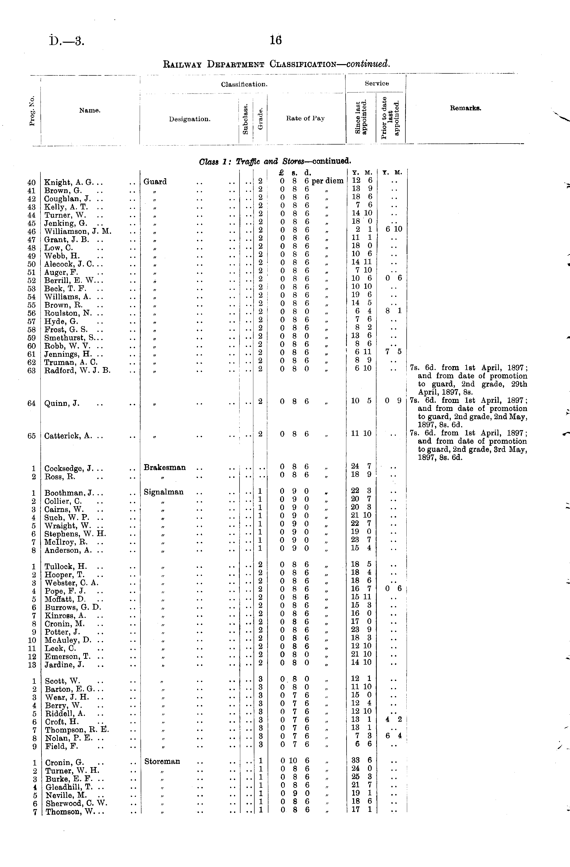 ~ I " I Classificai iion. Service i 6 I Name. s Designation. s 5 Rate of Pay II ij « 11 Bern arks. Class 1: Trafj \c ar, nd Stores —continuec L. 40 41 42 43 44 45 46 47 48 49 50 51 52 53 54 55 56 57 58 59 60 61 62 63 [0 tl L2 13 14 L-5 16 :7 :8 19 >o >1 >2 i3 >i >5 it; i7 >8 19 50 (1 >2 18 Knight, A. G. .. Brown, G. Coughlan, J. .. Kelly, A. T. Turner, W. .. Jenking, G. Williamson, J. M. Grant, J. B. Low, C. Webb, H. Alecook, J. C. .. Auger, F. Berrill, B. W... Beck, T. F. Williams, A. .. Brown, R. Roulston, N. .. Hyde, G. Frost, G. S. Smethurst, S... Robb, W. V. Jennings, H. .. Truman, A. C. Radford, W. J. B. Guard .. .. .. 2 2 2 'J 2 2 2 2 ■I 2 2 2 2 2 2 2 2 2 2 2 2 2 2 2 2 2 2 2 2 2 2 2 2 2 2 2 2 ' 2 ) 2 ! 2 ! 2 ! 2 2 2 l\ 2 2 £ s. d. 0 8 6 per diem 0 8 6 0 8 6 0 8 6 0 8 6 0 8 6 0 8 6 0 8 6 0 8 6 0 8 6 0 8 6 0 8 6 0 8 6 0 8 6 0 8 6 0 8 6 0 8 0 0 8 6 0 8 6 0 8 0 0 8 6 0 8 6 0 8 6 0 8 0 Y. M. 12 6 13 9 18 6 7 6 14 10 18 0 2 1 11 1 18 0 10 6 14 11 7 10 10 6 10 10 19 6 14 5 6 4 7 6 8 2 13 6 8 6 6 11 8 9 6 10 T. M. 6 10 0 6 8 1 7*5 64 Quinn, J. 2 0 8 6 10 5 0 9 7s. 6d. from 1st April, 1897; and from date of promotion to guard, 2nd grade, 29th April, 1897, 8s. 7s. 6d. from 1st April, 1897; and from date of promotion to guard, 2nd grade, 2nd May, 1897, 8s. 6d. 7s. 6d. from 1st April, 1897; and from date of promotion to guard, 2nd grade, 3rd May, 1897, 8s. 6d. 65 Gatterick, A. .. 2 i 0 8 6 11 10 1 2 1 2 Cooksedge, J. .. Ross, R. Brakeaman .. .... ' j 0 8 6 0 8 6 24 7 18 9 1 2 3 4 5 6 7 8 1 2 3 4 5 B 7 8 Boothman, J. .. Collier, G. Cairns, W. Such, W. P. Wraight, W. Stephens, W. H. Mellroy, R. .. Anderson, A. .. Signalman 1 1 1 1 1 1 1 1 1 1 1 1 1 1 1 1 0 9 0 0 9 0 0 9 0 0 9 0 0 9 0 0 9 0 0 9 0 0 9 0 22 3 20 7 20 3 21 10 22 7 19 0 23 7 15 4 1 2 3 4 5 6 7 8 9 10 11 12 13 1 •2 8 4 5 6 7 8 9 L0 LI 12 L3 Tullock, H. .. Hooper, T. Webster, C. A. Pope, F. J. .. Moffatt, D. .. Burrows, G. D. Kinross, A. Cronin, M. Potter, J. MoAuley, D. .. Leek, C. Emerson, T. .. Jardine, J. 2 2 2 ■A a 2 2 2 2 2 2 2 2 2 2 2 2 2 2 2 2 2 2 2 2 2 0 8 6 0 8 6 0 8 6 0 8 6 0 8 6 0 8 6 0 8 6 0 8 6 0 8 6 0 8 6 0 8 6 0 8 0 0 8 0 18 5 18 4 18 6 16 7 15 11 15 3 16 0 17 0 23 9 18 3 12 10 21 10 14 10 0 - 6 1 2 3 i 5 6 7 8 9 1 2 3 i 5 6 7 8 9 Scott, W. Barton, E. G. .. Wear, J. H. Berry, W. Riddell,A. .. Croft, H. Thompson, R. E. Nolan, P. E. Field, F. 8 3 3 3 3 3 3 3 3 3 3 3 3 3 3 3 3 3 0 8 0 0 8 0 0 7 6 0 7 6 0 7 6 0 7 6 0 7 6 0 7 6 0 7 6 12 1 11 10 15 0 12 4 12 10 13 1 13 1 7 3 6 6 4 2 6"4 1 3 4 5 6 7 1 2 3 i 5 6 7 Cronin, G. Turner, W. H. Burke, E. F. Gleadhill, T. .. Neville, M. .. Sherwood, C. W. Thomson, W. .. Storeman 1 1 1 1 1 1 1 1 1 1 1 1 1 1 0 10 6 0 8 6 0 8 6 0 8 6 0 9 0 0 8 6 0 8 6 33 6 24 0 25 3 21 7 19 1 18 6 17 1