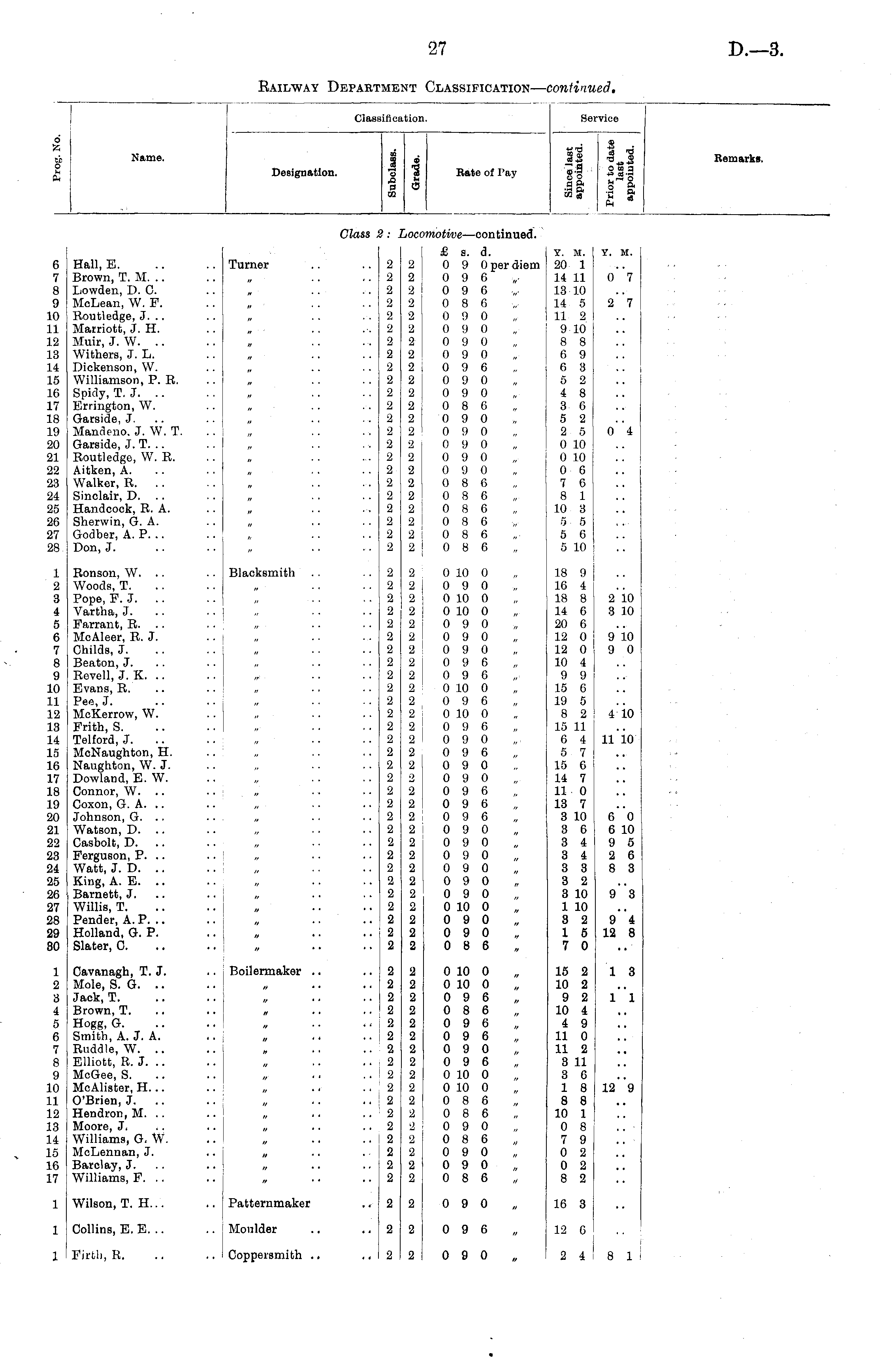 Class; Location. Service 6 a if £ Name. Designation. I & 9 Bate of Pay I| 3j si S31 Remarks. Class ,<>(■• miotive —con tinned. 6 7 8 S -0 .1 a .3 L4 L5 L6 L7 L8 L9 !0 11 ',2 !3 it m 36 !7 !8 Hall, E. Brown, T. M. .. Lowden, D. C. McLean, W. F. Koutledge, J. .. Marriott, J. H. Muir, J. W. Withers, J. L. Dickenson, W. Williamson, P. R. Spidy, T. J. Errington, W. Garside, J. Mandeno. J. W. T. Garside, J. T. .. Routledge, W. B. Aitken,A. Walker, R. .. Sinclair, D. Handcock, R. A. Sherwin, G. A. Godber, A. P. .. Don, J. '.'. i Turner 2 2 2 2 ■2 :> 2 2 2 2 2 2 2 2 2 2 2 2 2 2 2 2 2 2 2 2 2 2 2 2 2 2 2 2 2 2 2 2 2 2 2 2 2 2 2 2 £ s. d. 0 9 0 per diem 0 9 6 0 9 6 0 8 0 0 9 0 0 9 0 0 9 0 0 9 0 0 9 6 0 9 0 0 9 0 0 8 6 0 9 0 0 9 0 o i) o 0 9 o 0 9 0 0 8 G 0 8 6 0 8 6 0 8 6 0 8 6 0 8 6 y. m. 20 1 14 11 13 10 14 5 11 2 9 10 8 8 6 9 6 3 5 2 4 8 3 6 5 2 2 6 0 10 o io 0 6 7 6 8 1 10 8 S 5 5 6 5 10 y. m. o"7 2 7 0 4 1 2 3 4 5 6 7 8 !) L0 LI L2 L3 L4 L5 L6 17 .8 L9 !0 11 !2 !8 !4 25 26 !7 18 ill i0 Ronson, W. .. Woods, T. Pope, P. J. Vartha, J. Parrant, R. .. McAleer, R. J. Childs, J. Beaton, J. Revell, J. K. Evans, R. Pee, J. McKerrow, W. Frith, S. Telford, J. McNaughton, H. Naughton, W. J. Dowland, E. W. Connor, W. Coxon, G. A. Johnson, G. .. Watson, D. .. Casbolt, T>. .. Ferguson, P. .. Watt, J. D. King, A. E. .. Barnett, J. Willis, T. Pender, A. P. .. Holland, G. P. Slater, C. '.'. J Blacksmith "„ '■'■ 2 2 ■1 2 2 2 2 2 2 2 2 2 2 2 2 2 2 2 2 2 2 2 2 2 ■2 a 2 2 2 2 2 2 2 2 2 2 2 2 2 2 2 2 2 2 2 2 2 2 2 2 2 2 2 2 2 2 2 2 0 10 0 0 9 0 0 10 0 0 10 0 0 9 0 0 9 0 0 9 0 0 9 6 0 9 6 0 10 0 0 9 6 0 10 0 0 9 6 0 9 0 0 9 6 0 9 0 0 9 0 0 9 6 0 9 6 0 9 6 0 9 0 0 9 0 0 9 0 0 9 0 0 9 0 0 9 0 0 10 0 0 9 0 0 9 0 0 8 6 18 9 16 4 18 8 14 6 20 6 12 0 12 0 10 4 9 9 15 0 19 5 8 2 15 11 6 4 5 7 15 6 14 7 11 0 13 7 3 10 3 6 3 4 3 4 3 3 3 2 3 10 1 10 3 2 1 5 7 0 2 10 3 10 9 IO 9 0 4 10 11 IO 6 0 6 10 9 5 2 6 8 3 9"3 9"4 12 8 1 2 3 4 5 6 7 8 9 .0 .1 .2 .3 .4 .5 .6 .7 Cavanagh, T. J. Mole, S. G. .. Jack, T. Brown, T. Hogg, G. Smith, A. J. A. Ruddle, W. .. Elliott, R. J. .. McGee, S. McAlister, H... O'Brien, J. Hendron, M. .. Moore, J. Williams, G. W. McLennan, J. Barclay, J. Williams, P. .. :: Boilermaker .. H • • II ' ' It I ' 2 2 2 2 2 2 2 2 2 2 2 2 2 2 2 2 2 2 2 2 2 2 2 2 2 2 2 2 2 2 2 2 2 0 10 0 0 10 0 0 9 6 0 8 6 0 9 6 0 9 6 0 9 0 0 9 6 0 10 0 0 10 0 0 8 6 0 8 6 0 9 0 0 8 6 0 9 0 0 9 0 0 8 6 15 2 10 2 9 2 10 4 4 9 11 0 11 2 3 11 3 6 1 8 8 8 10 1 0 8 7 9 0 2 0 2 8 2 1 3 1 1 12"9 1 Wilson, T. H... Patternmaker 2 2 0 9 0 16 3 1 Collins, E.E. .. Moulder 2 2 0 9 6 12 6 1 Firth, R. Coppersmith .. 2 2 0 9 0 2 4 8 1