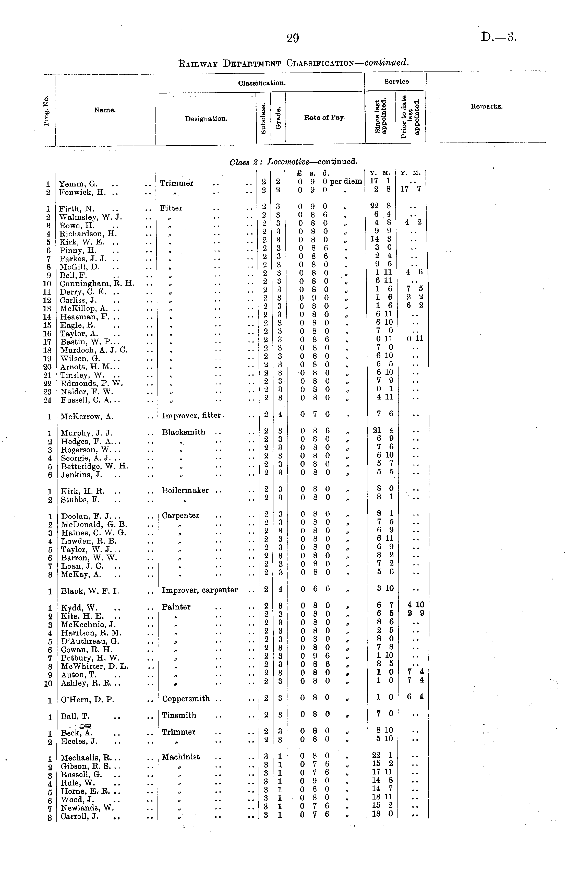 d Si Classi ifical ;ion. Service f Name. Designation. 1 00 6 1 5 Rate of Pay. go SS-8 Remarks. Class i ,oc< notive —continued. 1 2 Yemm, G. Fenwick, H. .. Trimmer 2 2 2 2 £ s. a. 0 9 0 per diem 0 9 0 y. M. 17 1 2 8 Y. M. 17 7 1 2 3 4 5 6 7 8 9 10 11 12 13 14 15 16 17 18 19 2(1 21 22 23 24 Firth, N. Walmsley, W. J. Rowe, H. Richardson, H. Kirk, W. E. Pinny, H. Parkes, J. J. McGill, D. .. Bell.F. Cunningham, R. H. Derry, G. E. Corliss, J. McKillop, A. .. Heasman, F. .. Eagle, R. Taylor, A. Bastin, W. P... Murdoch, A. J. C. Wilson, G. Arnott, H. M... Tinsley, W. .. Edmonds, P. W. Nalder, F. W. Fussell, C. A. .. Fitter 2 2 2 2 2 2 2 2 2 2 2 2 2 2 2 2 2 2 2 2 2 2 2 2 3 3 3 3 3 3 3 3 3 3 3 3 3 3 3 3 3 3 3 3 3 3 3 3 0 9 0 0 8 6 0 8 0 0 8 0 0 8 0 0 8 6 0 8 6 0 8 0 0 8 0 0 8 0 0 8 0 0 9 0 0 8 0 0 8 0 0 8 0 0 8 0 0 8 6 0 8 0 0 8 0 0 8 0 0 8 0 0 8 0 0 8 0 0 8 0 22 8 6 i 4 8 9 9 14 3 3 0 2 4 9 5 1 11 6 11 1 6 1 6 1 6 6 11 6 10 7 0 0 11 7 0 6 10 5 5 6 10 7 9 0 1 4 11 4 2 i 6 7 5 2 2 6 2 o ii 1 McKerrow, A. Improver, fitter 2 4 0 7 0 7 6 1 2 3 4 5 6 Murphy, J. J. Hedges, F. A... Rogerson, W. .. Scorgie, A. J. .. Betteridge, W. H. Jenkins, J. Blacksmith 2 2 2 2 2 2 3 3 3 3 3 3 0 8 6 0 8 0 0 8 0 0 8 0 0 8 0 0 8 0 21 4 6 9 7 6 6 10 5 7 5 5 1 2 Kirk, H. R. Stubbs, F. Boilermaker 2 2 3 3 0 8 0 0 8 0 8 0 8 1 1 2 3 4 5 6 7 8 Doolan, F. J. .. McDonald, G. B. Haines, C. W. G. Lowden, R. B. Taylor, W. J. .. Barren, W. W. Loan, J. 0. McKay, A. Carpenter 2 2 2 2 2 2 2 2 3 3 3 3 3 3 3 3 0 8 0 0 8 0 0 8 0 0 8 0 0 8 0 0 8 0 0 8 0 0 8 0 8 1 7 5 6 9 6 11 6 9 8 2 7 2 5 6 1 Black, W. F. I. Improver, carpenter 2 4 0 6 6 3 10 1 2 3 4 5 6 7 8 9 10 Kydd, W. Kite, H. E. .. McKechnie, J. Harrison, R. M. D'Authreau, G. Cowan, R. H. Potbury, H. W. McWhirter, D. L. Auton, T. Ashley, R. R. .. Painter * • ■ * • « • • • ■ 2 2 2 2 2 2 2 2 2 2 3 3 3 3 3 3 3 3 3 3 0 8 0 0 8 0 0 8 0 0 8 0 0 8 0 0 8 0 0 9 6 0 8 6 0 8 0 0 8 0 6 7 6 5 8 6 2 5 8 0 7 8 1 10 8 5 1 0 1 0 4 10 2 9 7 4 7 4 a • • • • 1 O'Hern, D. P. Coppersmith 2 3 0 8 0 1 0 6 4 1 Ball, T. ■ &s*j Beck, A. Ecclea, J. Tinsmith 2 3 I 0 8 0 7 0 1 2 Trimmer 2 2 3 3 0 8 0 0 8 0 8 10 5 10 1 2 8 4 5 6 7 8 Mechaelis, R... Gibson, R. S. .. Russell, G. .. Rule, W. Home, E. R. .. Wood, J. Newlands, W. Carroll, J. .. Machinist 3 3 3 3 3 8 3 8 1 1 1 1 1 1 1 1 0 8 0 0 7 6 0 7 6 0 9 0 0 8 0 0 8 0 0 7 6 0 7 6 22 1 15 2 17 11 14 8 14 7 13 11 15 2 18 0 rr * * • •