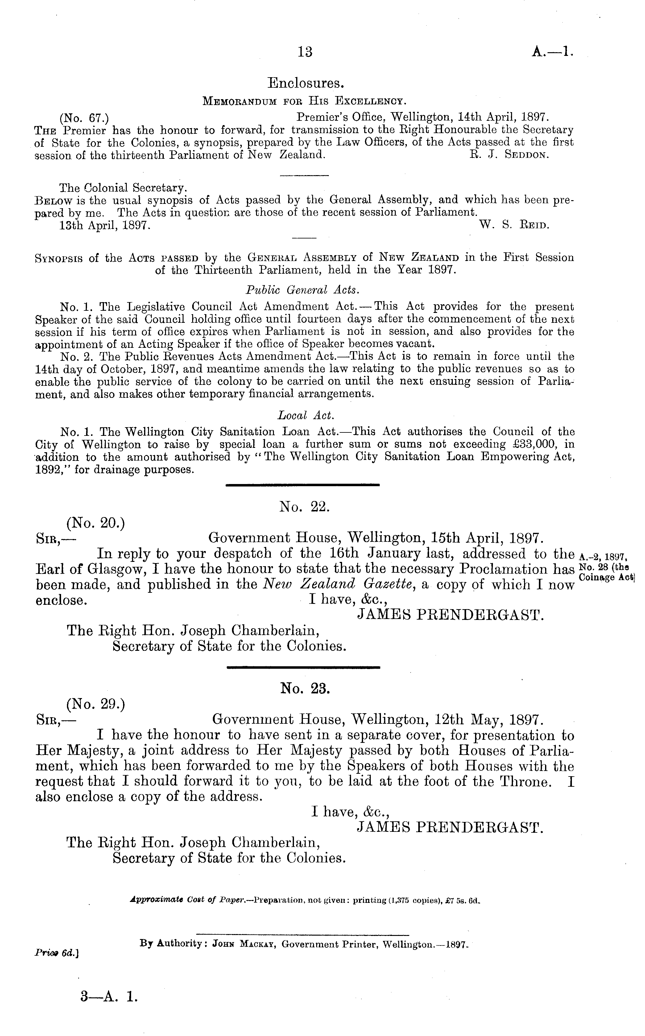 Enclosures. Memorandum for His Excellency. (No. 67.) Premier's Office, Wellington, 14th April, 1897. The Premier has the honour to forward, for transmission to the Eight Honourable the Secretary of State for the Colonies, a synopsis, prepared by the Law Officers, of the Acts passed at the first session of the thirteenth Parliament of New Zealand. E. J. Seddon.