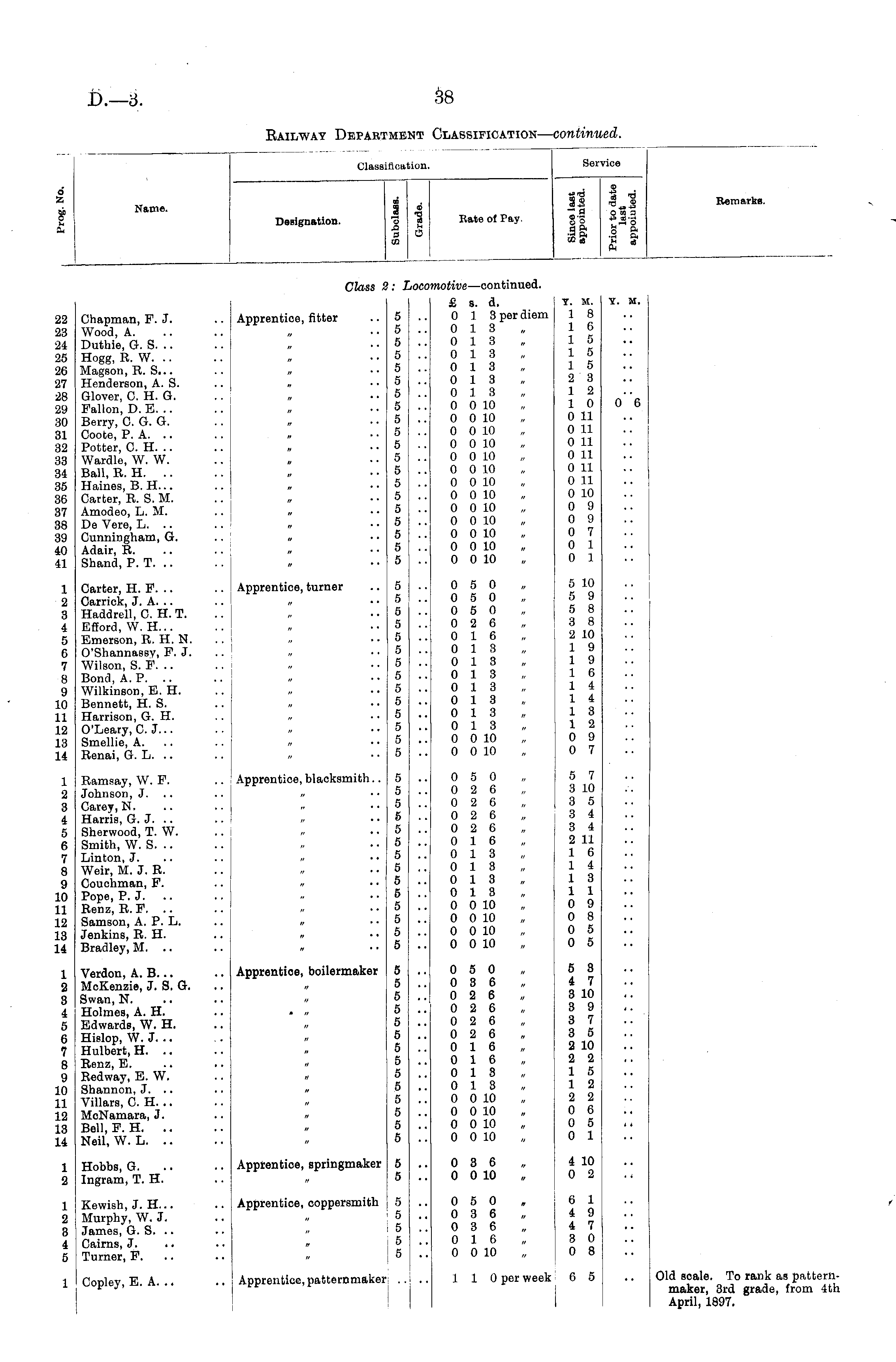 Classi Lncation. Service 6 Z ■z Name. Designation. § t I 1 S 5 as Rate of Pay. If 1 -d •a S 2 3-3 ft Remarks. Class 2 ,OCl totive —continued. ta !3 14 !5 i<; !7 Iβ !9 Ml )] 12 V.i 14 15 16 17 !H 19 10 LI Chapman, P. J. Wood, A. Duthie, G. S. .. Hogg, R. W. .. Magson, R. S... Henderson, A. S. Glover, C. H. G. Pallon, D. E. .. Berry, C. G. G. Coote, P. A. Potter, C. H. .. Wardle, W. W. Ball, R. H. Haines, B. H... Carter, R. S. M. Amodeo, L. M. De Vere, L. .. Cunningham, G. Adair, R. Shand, P. T. Apprentice, fitter 5 5 5 5 5 5 5 5 5 5 5 5 5 5 5 5 5 5 5 5 £ s. d. 0 13 per diem 0 13 0 13 0 13 0 13 0 13 0 13 0 0 10 0 0 10 0 0 10 0 0 10 0 0 10 0 0 10 0 0 10 0 0 10 0 0 10 0 0 10 0 0 10 0 0 10 0 0 10 T. M. 1 8 1 6 1 5 1 5 1 5 2 3 1 2 1 0 0 11 0 11 0 11 0 11 0 11 0 11 0 10 0 9 0 9 0 7 0 1 0 1 Y. M. o"6 a • * it '' 1 2 8 4 5 6 7 8 >.) 0 11 .2 13 A Carter, H. P. .. Garrick, J. A. .. Haddrell, C. H. T. Efford, W. H... Emerson, R. H. N. O'Shannassy, P. J. Wilson, S. P. .. Bond, A. P. .. Wilkinson, E. H. Bennett, H. S. Harrison, G. H. O'Leary, C. J... Smellie, A. Renai, G. L. Apprentice, turner 5 5 5 5 5 5 5 5 5 5 5 5 5 5 0 5 0 0 5 0 0 5 0 0 2 6 0 16 0 13 0 13 0 13 0 13 0 13 0 13 0 13 0 0 10 0 0 10 5 10 5 9 5 8 3 8 2 10 1 9 1 9 1 6 1 4 1 4 1 3 1 2 0 9 0 7 1 2 3 4 5 6 7 8 B o 1 .2 .3 .4 Ramsay, W. P. Johnson, J. Carey, N. Harris, G. J. Sherwood, T. W. Smith, W. S. .. Linton, J. Weir, M. J. E. Couohman, P. Pope, P. J. Renz, R. P. Samson, A. P. L. Jenkins, R. H. Bradley, M. .. Apprentice, blacksmith.. 5 5 5 8 5 5 5 6 5 E 5 5 5 5 0 5 0 0 2 6 0 2 6 0 2 6 0 2 6 0 16 0 13 0 13 0 13 0 13 0 0 10 0 0 10 0 0 10 0 0 10 5 7 3 10 3 5 3 4 3 4 2 11 1 6 1 4 1 3 1 1 0 9 0 8 0 5 0 5 1 2 8 i 5 6 7 8 9 0 lI L2 13 [4 Verdon, A. B. .. MoKenzie, J. S. G. Swan, N. Holmes, A. H. Edwards, W. H. Hislop, W. J. .. Hulbert, H. .. Renz, B. Redway, E. W. Shannon, J. .. Villars, C. H. .. MoNamara, J. Bell, F. H. .. Neil, W. L. Apprentice, boilermaker w * n n 5 5 5 5 5 5 5 5 6 5 5 5 5 5 0 5 0 0 3 6 0 2 6 0 2 6 0 2 6 0 2 6 0 16 0 16 0 13 0 13 0 0 10 0 0 10 0 0 10 0 0 10 5 3 4 7 3 10 3 9 3 7 3 5 2 10 2 2 1 5 1 2 2 2 0 6 0 5 0 1 H ti It 1 2 Hobbs, G. Ingram, T. H. Apprentice, springmaker 5 5 0 3 6 0 0 10 4 10 0 2 1 2 3 4 5 Kewish, J. H... Murphy, W. J. James, G. S. Cairns, J. Turner, P. Apprentice, coppersmith " „ 5 5 5 5 5 0 5 0 0 3 6 0 3 6 0 16 0 0 10 6 1 4 9 i 7 3 0 0 8 0 1 Copley, E. A. .. Apprentice, patternmaker 110 per week G 5 Old scale. To rank as patternmaker, 3rd grade, from 4th April, 1897.