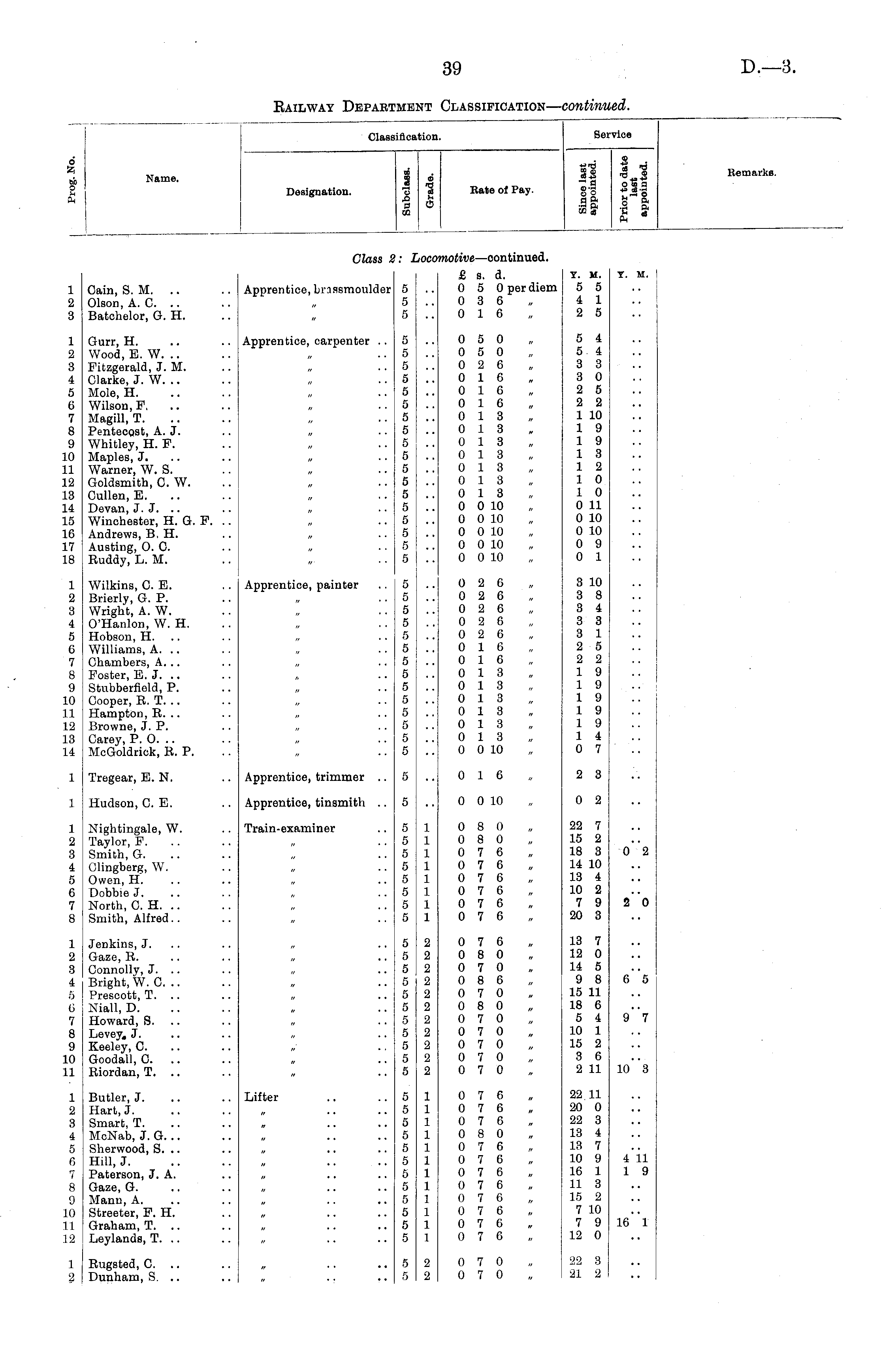 Clas: jittcal lion. Service 6 i, 60 o Name. Designation. I .8 <D 0 Rate of Pay. jD il hi II I , Kemarks. Class k iOCi wtive —oontinued. 1 2 3 Gain, S. M. Olson, A. C. .. Batchelor, G. H. Apprentice, bnnsmoulder 5 5 5 £ s. d. 0 5 0 per diem 0 3 6 0 16 y. m. 5 5 4 1 2 5 T. M. 1 2 3 4 5 6 7 8 9 0 .1 .2 .3 .4 .5 .6 7 .8 Gurr, H. Wood, B. W. .. Fitzgerald, J. M. Clarke, J. W. .. Mole, H. Wilson, P. Magill, T. Pentecost, A. J. Whitley, H. F. Maples, J. Warner, W. S. Goldsmith, C. W. Oullen, E. Devan, J.J... Winchester, H. G. F. Andrews, B, H. Auating, 0. 0. Ruddy, L. M. Apprentice, carpenter .. 5 5 5 5 5 5 5 5 5 5 5 5 5 5 5 5 5 5 0 5 0 0 5 0 0 2 6 0 16 0 16 0 16 0 13 0 13 0 13 0 13 0 13 0 13 0 13 0 0 10 0 0 10 0 0 10 0 0 10 0 0 10 5 4 5. 4 3 3 3 0 2 5 2 2 1 10 1 9 1 9 1 3 1 2 1 0 1 0 0 11 0 10 0 10 0 9 0 1 1 2 3 4 5 (i 7 8 9 0 :i L2 .3 .4 Wilkins, C. E. Brierly, G. P. Wright, A. W. O'Hanlon, W. H. Hobson, H. .. Williams, A. .. Chambers, A. .. Foster, E. J. .. Stubberfield, P. Cooper, R. T. .. Hampton, R. .. Browne, J. P. Carey, P. 0. .. McGoldrick, R. P. Apprentice, paiater 5 5 5 5 5 5 5 5 5 5 5 5 5 5 0 2 6 0 2 6 0 2 6 0 2 6 0 2 6 0 16 0 16 0 13 0 13 0 13 0 13 0 13 0 13 0 0 10 3 10 3 8 3 4 3 3 3 1 2 5 2 2 1 9 1 9 1 9 1 9 1 9 1 4 0 7 1 Tregear, E. N. Apprentice, trimmer .. 5 0 16 2 3 1 Hudson, C. E. Apprentice, tinsmith .. 5 0 0 10 0 2 1 2 3 4 5 6 7 8 Nightingale, W. Taylor, F. Smith, G. Clingberg, W. Owen, H. Dobbie J. North, C. H. .. Smith, Alfred.. Train-examiner 5 5 5 5 5 5 5 5 1 1 1 1 1 1 1 1 0 8 0 0 8 0 0 7 6 0 7 6 0 7 6 0 7 6 0 7 6 0 7 6 22 7 15 2 18 3 14 10 13 4 10 2 7 9 20 3 o"2 s"o 1 2 3 4 5 6 7 8 9 LO 11 Jenkins, J. Gaze, R. Connolly, J. .. Bright, W. C. .. Prescott, T. .. Niall, T>. Howard, S. Levey, J. Keeley, C. Goodall, 0. .. Riordan, T. .. 5 5 5 5 5 5 5 5 5 5 5 2 2 2 2 2 2 2 2 2 2 2 0 7 6 0 8 0 0 7 0 0 8 6 0 7 0 0 8 0 0 7 0 0 7 0 0 7 0 0 7 0 0 7 0 13 7 12 0 14 5 9 8 15 11 18 6 5 4 10 1 15 2 3 6 2 11 6"5 9"7 10 3 1 2 3 4 5 6 7 8 9 LO 11 L2 Butler, J. Hart, J. Smart, T. McNab, J. G. .. Sherwood, S. .. Hill, J. Paterson, J. A. Gaze, G. Mann, A. Streeter, F. H. Graham, T. .. Leylands, T. .. Lifter 5 5 5 5 5 5 5 5 5 5 5 5 1 1 1 1 1 1 1 1 1 1 1 1 0 7 6 0 7 6 0 7 6 0 8 0 0 7 6 0 7 6 0 7 6 0 7 6 0 7 6 0 7 6 0 7 6 0 7 6 22 11 20 0 22 3 13 4 13 7 10 9 16 1 11 3 15 2 7 10 7 9 12 0 i il 1 9 16 1 1 2 Rugsted, C. .. Dunham, S. .. 5 5 2 2 0 7 0 0 7 0 22 3 21 2