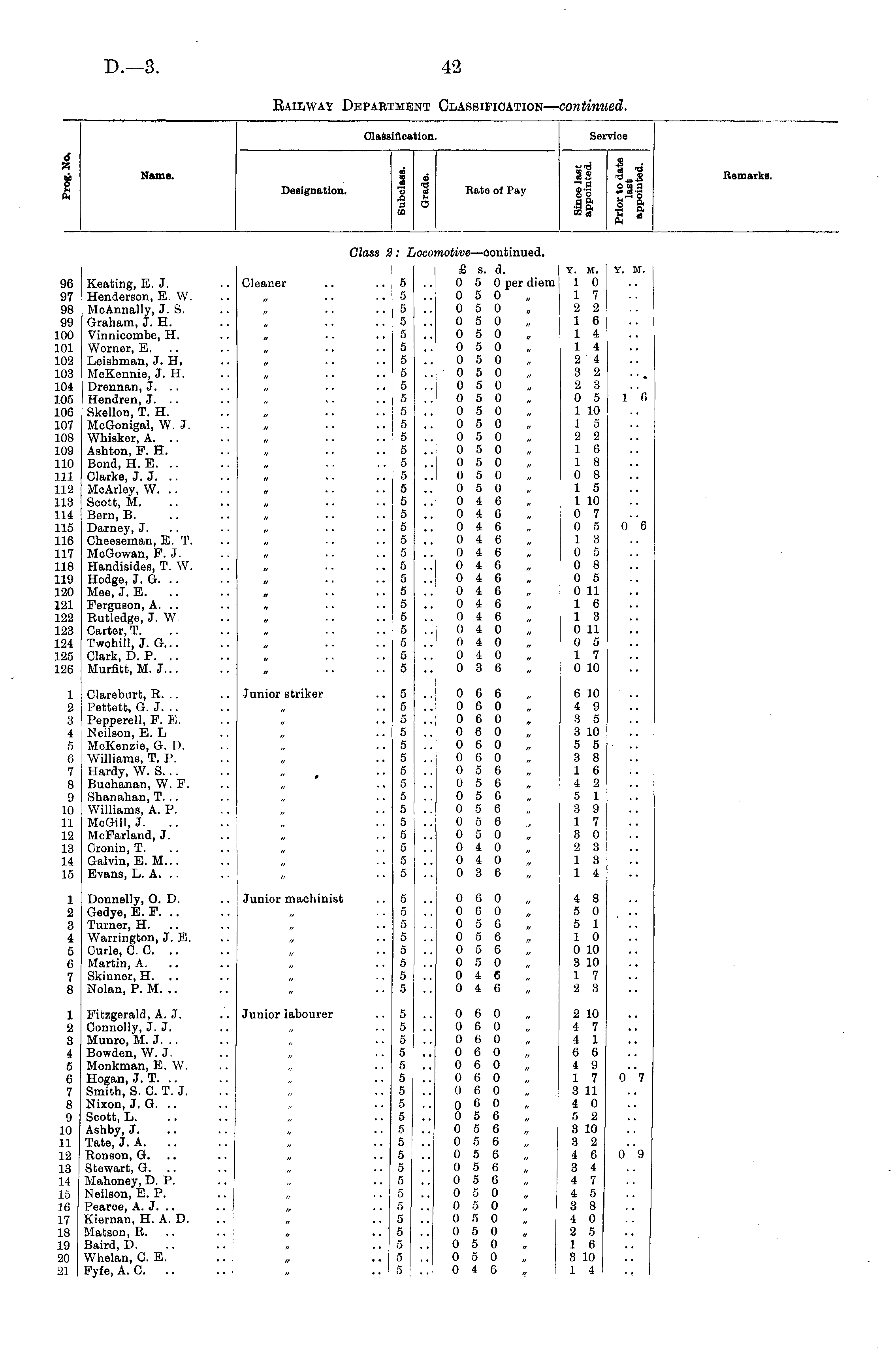 Classification, Se: rvice ! Name. Designation. 02 Rate of Pay il •as 5 « ■8 3-3 JfS Remarks. Class , lOCOl ,otive —continued. '.Hi '.)7 98 99 100 101 102 108 104 105 10(1 107 I OH KM) 1 10 111 112 118 114 115 Uβ 117 118 111) 120 121 Vli 12a 124 125 126 Keating, E. J. Henderson, E. W. McAnnally, J. S. Graham, J. H. Vinnicombe, H. Worner, E. Leishroan, J. H, McKennie, J. H. Drennan, J. .. Hendren, J. .. Skellon, T. H. MoGonigal, W. J. Whisker, A. .. Ashton, P. H. Bond, H. E. Clarke, J. J. .. McArley, W. .. Scott, M. Bern, B. Darney, J. Cheeseman, E. T. MoGowan, F. J. Handisides, T. W. Hodge, J. G. .. Mee, J. E. Ferguson, A. .. Rutledge, J. W Carter, T. Twohill, J. G... Clark, D. P. Murfitt, M. J... Cleaner 5 5 5 5 5 5 5 5 5 5 5 5 5 5 5 5 5 5 5 5 5 5 5 5 5 5 5 5 5 5 5 £ s. d. 0 5 0 per diem 0 5 0 0 5 0 0 5 0 0 5 0 0 5 0 0 5 0 0 5 0 0 5 0 0 5 0 0 5 0 0 5 0 0 5 0 0 5 0 0 5 0 0 5 0 0 5 0 0 4 6 0 4 0 0 4 6 0 4 6 0 4 6 0 4 6 0 4 6 0 4 6 0 4 6 0 4 6 0 4 0 0 4 0 0 4 0 0 3 6 Y. M. 1 0 1 7 2 2 1 6 1 4 1 4 2 4 3 2 2 3 0 5 1 10 1 5 2 2 1 6 1 8 0 8 1 5 1 10 0 7 0 5 1 3 0 5 0 8 0 5 0 11 1 6 1 3 0 11 0 5 1 7 0 10 Y. M. l'V) o"e 1 2 3 4 5 6 7 8 9 10 11 12 13 14 15 Clareburt, R. .. Pettett, G. J. .. Pepperell, F. l>). Neilson, E. L MeKenzie, G. D. Williams, T. P. Hardy, W. S. .. Buchanan, W. F. Shanahan, T. .. Williams, A. P. McGill, J. McFarland, J. Cronin, T. Galvin, E. M... Evans, L. A. Junior striker " * 5 5 5 5 5 5 5 5 5 5 5 5 5 5 5 0 6 6 0 6 0 0 6 0 0 6 0 0 6 0 0 6 0 0 5 G 0 5 6 0 5 6 0 5 6 0 5 6 0 5 0 0 4 0 0 4 0 0 3 6 6 10 4 9 3 5 3 10 5 5 3 8 1 6 4 2 5 1 3 9 1 7 3 0 2 3 1 3 1 4 1 9 3 4 5 6 7 8 Donnelly, 0. D. Gedye, E. F. Turner, H. Warrington, J. E. Curie, CO. Martin, A. Skinner, H. Nolan, P. M. .. Junior machinist 5 5 5 5 5 5 5 5 0 6 0 0 6 0 0 5 6 0 5 6 0 5 6 0 5 0 0 4 6 0 4 6 4 8 5 0 5 1 1 0 0 10 3 10 1 7 2 3 1 2 3 4 5 6 7 8 9 10 11 12 13 14 15 16 17 18 ID 20 21 Fitzgerald, A. J. Connolly, J. J. Munro, M. J. .. Bowden, W. J. Monkman, E. \V. Hogan, J. T. Smith, S. C. T. J. Nixon, J. G. .. Scott, L. Ashby, J. Tate, J. A. Ronson, G. Stewart, G. Mahoney, D. P. Neilson, E. P. Pearce, A. J. Kiernan, H. A. D. Matson, R. Baird, D. Whelan, C. E. Fyfe, A. C. Junior labourer 5 5 5 5 5 5 5 5 5 5 5 5 5 5 5 5 5 5 5 5 5 0 6 0 0 6 0 0 6 0 0 6 0 0 6 0 0 6 0 0 6 0 0 (> 0 0 5 6 0 5 6 0 5 6 0 5 6 0 5 6 0 5 6 0 5 0 0 5 0 0 5 0 0 5 0 0 5 0 0 5 0 0 4 6 2 10 4 7 4 1 6 6 4 9 1 7 3 11 4 0 5 2 3 10 3 2 4 6 3 4 4 7 4 5 3 8 4 0 2 5 1 6 3 10 1 4 o"7 o"9 ■■ .J