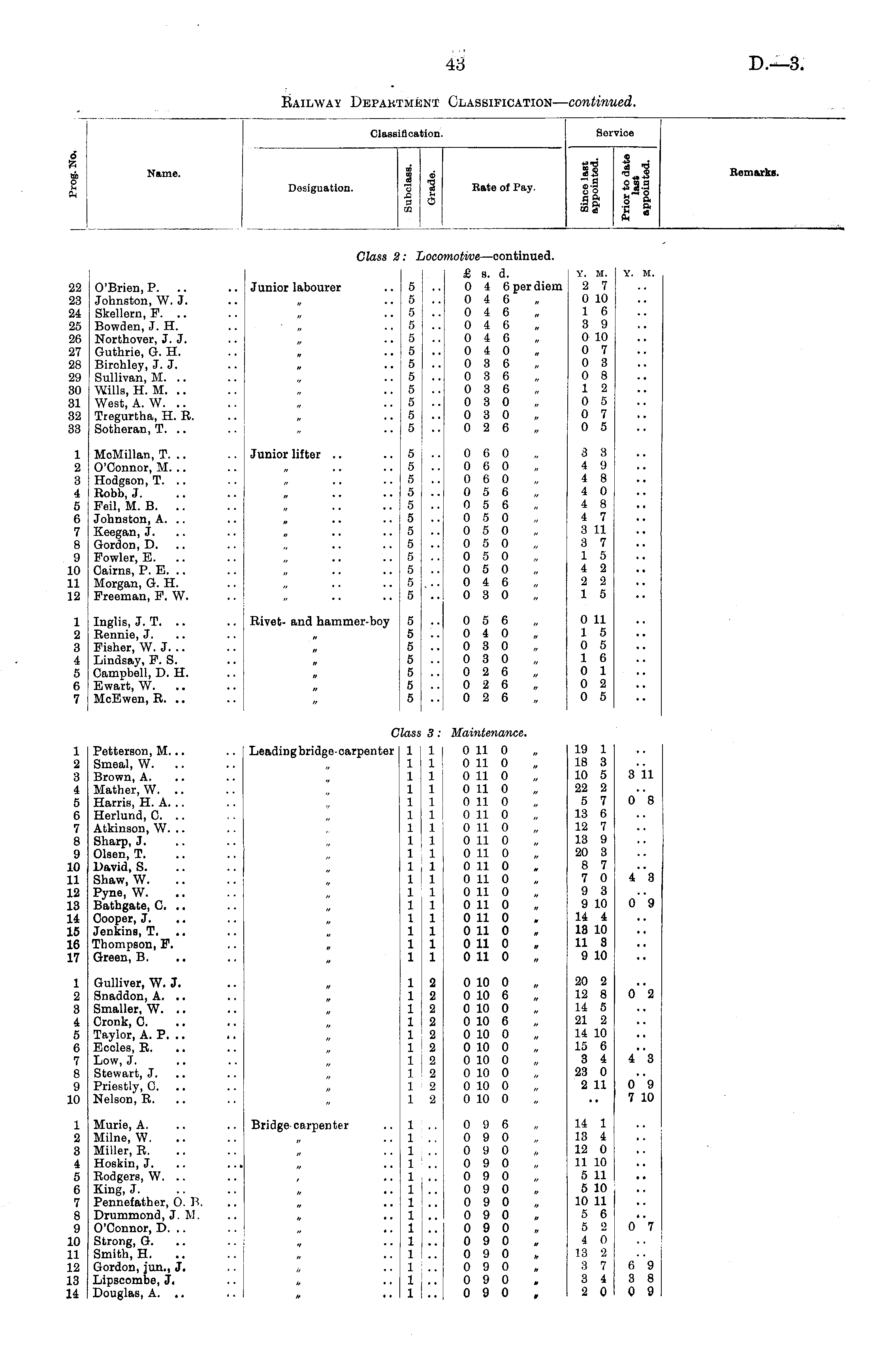i Name. Class; iflcai I £ 03 jion. I Eate of Pay. II I t il *H II I § Service Remarks, Designation. Class l toco; wtive —continued. 22 23 24 25 26 27 28 2!) 80 Bl 32 88 O'Brien, P. Johnston, W. J. Skellern, F. .. Bowden, J. H. Northover, J. J. Guthrie, G. H. Birehley, J. J. Sullivan, M. .. Wills, H. M. .. West, A. W. .. Tregurtha, H. R. Sotheran, T. .. Junior labourer 5 5 5 5 5 5 5 5 5 5 5 5 £ s. d. 0 4 6 per diem 0 4 6 0 4 6 0 4 6 0 4 6 0 4 0 0 3 6 0 3 6 0 3 6 0 3 0 0 3 0 0 2 6 Y. M. 2 7 0 10 1 6 3 9 0 10 0 7 0 3 0 8 1 2 0 5 0 7 0 5 Y. M. 1 2 3 4 5 6 7 8 9 10 11 12 McMillan, T. .. O'Connor, M. .. Hodgson, T. .. Robb, J. Peil, M. B. Johnston, A. .. Keegan, J. Gordon, D. Fowler, E. Cairns, P. E. Morgan, G. H. Freeman, F. W. Junior lifter 5 5 5 5 5 r> 5 5 5 5 5 5 0 6 0 0 6 0 0 6 0 0 5 6 0 5 6 0 5 0 0 5 0 0 5 0 0 5 0 0 5 0 0 4 6 0 3 0 3 3 4 y 4 8 4 0 4 8 4 7 3 11 3 7 1 5 4 2 2 2 1 5 1 a 3 4 5 6 7 Inglis, J. T. Rennie, J. Fisher, W. J. .. Lindsay, F. S. Campbell, D. H. Bwart, W. MoEwen, R. .. Rivet- and hammer-boy 5 5 5 5 5 5 5 0 5 6 0 4 0 0 3 0 0 3 0 0 2 6 0 2 6 0 2 6 0 11 1 5 0 5 1 6 0 1 0 2 0 5 Petterson, M... Smeal, W. Brown, A. Mather, W. .. Harris, H. A. .. Herlund, C. .. Atkinson, W. .. Sharp, J. Olsen, T. David, S. Shaw, W. Pyne, W. Bathgate, C. .. Cooper, J. Jenkins, T, Thompson, F. Green, B. ( Leading bridge-carpenter 'lass 3: Maintenance. 1 9 8 4 5 6 7 8 ■J L0 LI L2 L3 L4 L5 L6 17 i ii 11 11 11 11 11 i, i 11 11 11 11 11 11 11 11 11 0 11 0 0 11 0 0 11 0 0 11 0 0 11 0 0 11 0 0 11 0 0 11 0 0 11 0 0 11 0 0 11 0 0 11 0 0 11 0 0 11 0 0 11 0 0 11 0 0 11 0 19 1 18 3 10 5 22 2 5 7 13 6 12 7 13 9 20 3 8 7 7 0 9 3 9 10 14 4 13 10 11 3 9 10 3 11 o"s 4*3 0 9 1 2 3 4 5 6 7 8 9 L0 Gulliver, W. J. Snaddon, A. .. Smaller, W. .. Cronk, C. Taylor, A. P. Ecoles, R. Low, J. Stewart, J. Priestly, O. .. Nelson, R. 1 2 1 2 1 2 1 2 1 2 1 2 1 2 1 2 1 2 1 2 0 10 0 0 10 6 0 10 0 0 10 6 0 10 0 0 10 0 0 10 0 0 10 0 0 10 0 0 10 0 20 2 12 8 14 5 21 2 14 10 15 6 3 4 23 0 2 11 o"2 4"3 0 - 9 7 10 1 2 8 4 5 6 7 8 9 L0 LI [2 .3 A Murie, A. Milne, W. Miller, R. Hoskin, J. Rodgers, W. .. King, J. Pennefather, O. B. Drummond, J. M. O'Connor, D. .. Strong, G. Smith, H. Gordon, jun., J, Lipscombe, J, Douglas, A. ,. Bridge carpenter 1 .. 1 .. 1 .. 1 .. 1 .. 1 .. 1 .. 1 ! .. 1 j.. 1 I .. 1 .. 1 ... 1 .. 1 .. 0 9 6 0 9 0 0 9 0 „ 0 9 0 0 9 0 0 9 0 0 9 0 0 9 0 0 9 0 0 9 0 0 9 0 0 9 0 0 9 0 0 9 0 14 1 13 4 12 0 11 10 5 11 5 10 10 11 5 6 5 2 4 0 13 2 3 7 3 4 2 0 o"7 6 9 3 8 0 9