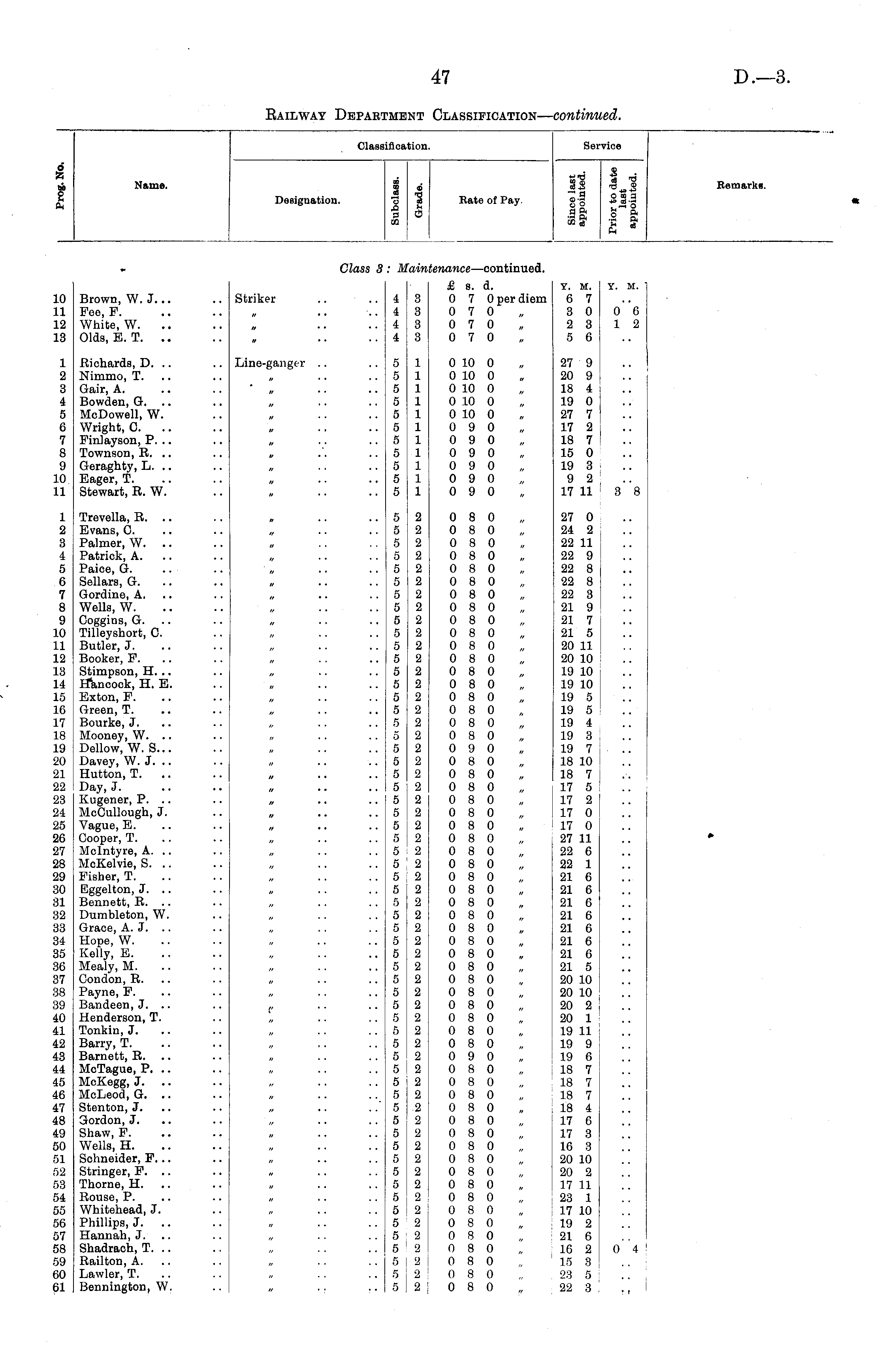 Classifical iio] Service i i Name. Designation. I 5 Bate of Pay. . s ■ 8 o -".So ■9 a g Remarks. Class 3 'nil (ereance—continued. 10 11 12 13 Brown, W. J. .. Pee, P. White, W. .. Olds, E. T. Striker 4 4 4 4 3 3 3 3 £ s. d. 0 7 0 per diem 0 7 0 0 7 0 0 7 0 Y. M. 6 7 3 0 2 3 5 6 Y. M. o"6 1 2 1 2 3 i 5 6 7 8 9 10 11 Richards, D. .. Nimmo, T. Gair, A. Bowden, G. McDowell, W. Wright, G. .. Pinlayson, P. .. Townson, R. .. Geraghty, L. .. Eager, T. Stewart, E. W. Line-ganger .. 5 5 5 5 5 5 5 5 5 5 5 1 1 1 1 1 1 1 1 1 1 1 0 10 0 0 10 0 0 10 0 0 10 0 0 10 0 0 9 0 0 9 0 0 9 0 0 9 0 0 9 0 0 9 0 27 9 20 9 18 4 19 0 27 7 17 2 18 7 15 0 19 3 9 2 17 11 3"8 1 2 3 4 5 (i 7 8 9 10 11 12 18 U 16 1C 17 18 19 20 21 22 23 24 25 86 27 28 29 30 31 32 88 34 86 36 37 38 39 40 41 42 43 44 45 l(i 47 48 4<J 50 51 52 53 54 55 f>0 57 58 59 60 61 Trevella, R. .. Evans, G. Palmer, W. .. Patrick, A. Paice, G. Sellars, G. Gordine, A. Wells, W. Coggins, G. Tilleyshort, C. Butler, J. Booker, P. Stimpson, H. .. Hancock, H. E. Exton, P. Green, T. Bourke, J. Mooney, W. .. Dellow, W. S... Davey, W. J. .. Hutton, T. .. Day, J. Kugener, P. .. McCullough, J. Vague, E. Cooper, T. Mclntyre, A. .. McKelvie, S. .. Pisber, T. Eggelton, J. .. Bennett, R. .. Dumbleton, W. Grace, A. J. Hope, W. Kelly, E. Mealy, M. Condon,E. Payne, P. Bandeen, J. .. Henderson, T. Tonkin, J. Barry, T. Barnett, R. .. McTague, P. .. MeKegg, J. MoLeod, G. .. Stenton, J. Gordon, J. Shaw, P. Wells, H. Schneider, P. .. Stringer, P. .. Thorne, H. .. Eouse, P. Whitehead, 3. Phillips, J. .. Hannah, J. Shadrach, T. .. Eailton, A. Lawler, T. Bennington, W. 5 5 5 5 5 5 5 5 5 5 5 5 5 5 5 5 5 5 5 5 5 a 5 5 5 5 5 5 5 5 5 5 5 5 5 5 5 5 5 5 5 5 5 5 5 5 5 5 5 5 5 5 5 5 5 5 5 5 5 5 5 2 2 2 2 2 2 2 2 2 2 2 2 2 2 2 2 2 2 2 2 2 2 2 2 2 2 2 2 2 2 2 2 2 2 2 2 2 2 2 2 2 2 2 2 I 2 I 2 I -2 i 2 2 2 2 2 2 I 2 2 2 2 2 2 0 8 0 0 8 0 0 8 0 0 8 0 0 8 0 0 8 0 0 8 0 0 8 0 0 8 0 0 8 0 0 8 0 0 8 0 0 8 0 0 8 0 0 8 0 0 8 0 0 8 0 0 8 0 0 9 0 0 8 0 0 8 0 0 8 0 0 8 0 0 8 0 0 8 0 0 8 0 0 8 0 0 8 0 0 8 0 0 8 0 0 8 0 0 8 0 0 8 0 0 8 0 0 8 0 0 8 0 0 8 0 0 8 0 0 8 0 0 8 0 0 8 0 0 8 0 0 9 0 0 8 0 0 8 0 0 8 0 0 8 0 0 8 0 0 8 0 0 8 0 0 8 0 0 8 0 0 8 0 0 8 0 0 8 0 0 8 0 0 8 0 0 8 0 0 8 0 0 8 0 0 8 0 27 0 24 2 22 11 22 9 22 8 22 8 22 3 21 9 21 7 21 5 20 11 20 10 19 10 19 10 19 5 19 5 19 4 19 3 19 7 18 10 18 7 17 5 17 2 17 0 17 0 27 11 22 6 22 1 21 6 21 6 21 6 21 6 21 6 21 6 21 6 21 5 20 10 20 10 20 2 20 1 19 11 19 9 19 6 18 7 18 7 18 7 18 4 17 6 17 3 16 3 20 10 20 2 17 11 23 1 17 10 19 2 21 6 16 2 15 3 23 5 22 3 I' 0 4