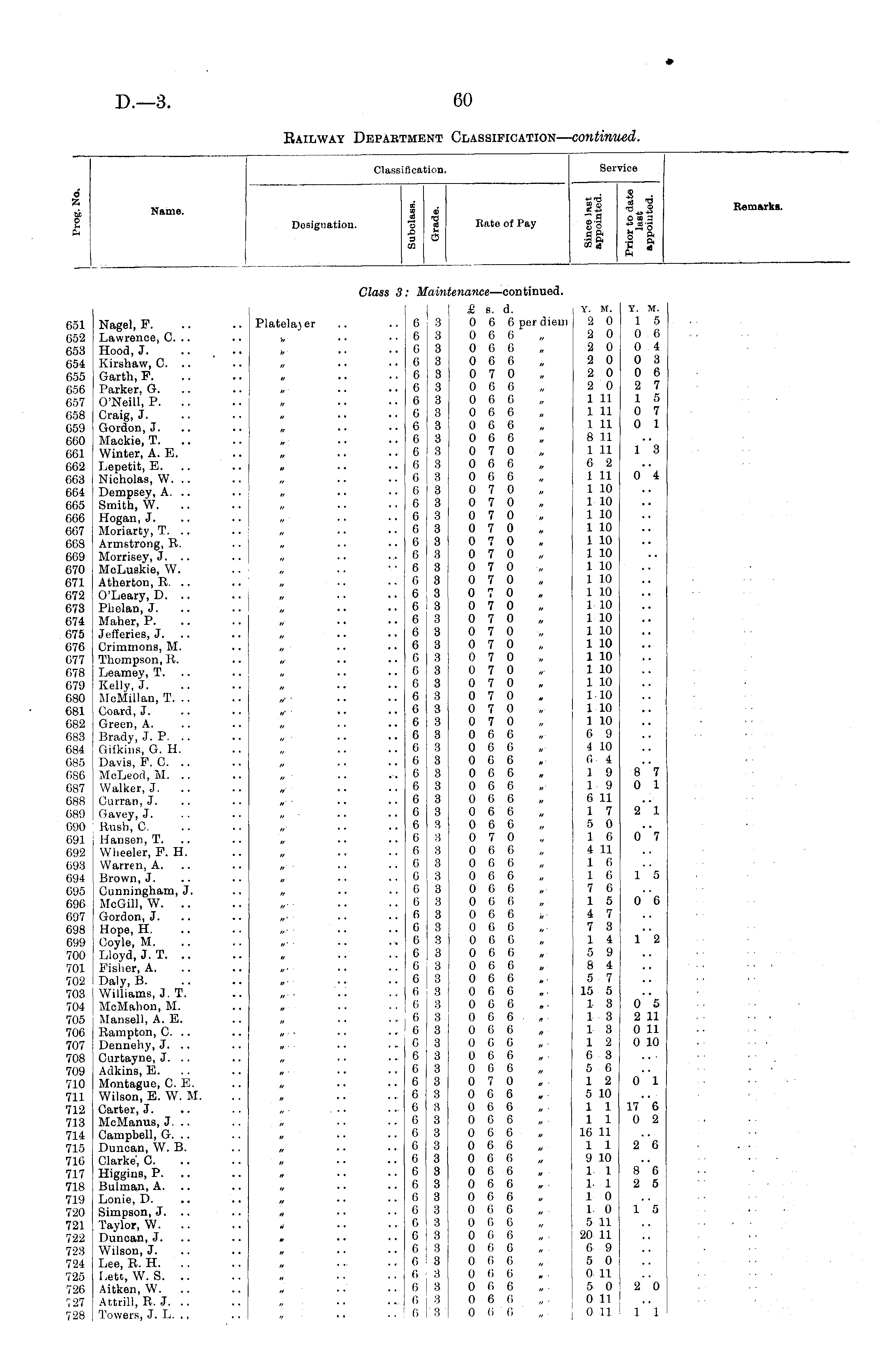Classiflcal iion. Service 6 i Name. Designation. "3 a CO i 1 Rate of Pay ~" a o to q II f! Remarks. Class 3 [aim tenance —con tinued. f>51 652 653 654 655 656 657 C58 G59 660 661 662 663 664 665 666 667 668 669 670 671 672 673 C74 G75 G76 677 678 679 680 681 682 C83 684 685 GS6 687 688 689 690 691 692 693 694 695 696 697 698 699 700 701 702 703 704 705 706 707 708 709 710 711 712 713 714 715 716 717 718 719 720 721 722 723 724 725 726 727 728 Nagel, F. Lawrence, C. .. Hood, J. Kirshaw, C. .. Garth, P. Parker. G. O'Neill, P, Craig, J. Gordon, J. Mackie, T. Winter, A. E. Lepetit, E. Nicholas, W. .. Dempsey, A. .. Smith, W. Hogan, J. Moriarty, T. .. Armstrong, R. Morrisey, J. .. McLuskie, W. Atherton, E. .. O'Leary, D. .. Phelan, J. Maher, P. Jefferies, J. Crimmons, M. Thompson, R. Leamey, T. Kelly, J. McMillan, T. .. Coard, J. Green, A. Brady, J. P. Gifkins, G. H. Davis, P. C. .. McLeod, M. .. Walker, J. Gurran, J. Gavey, J. Rush, C. Hansen, T. Wheeler, P. H. Warren, A. Brown, J. Cunningham, J. McGill, W. .. Gordon, J. Hope, H. Coyle, M. Lloyd, J. T. .. Fisher, A. Daly, B. Williams, J. T. McMahon, M. Mansell, A. E. Rampton, C. .. Dennehy, J. .. Curtayne, J. .. Adkins, E. Montague, C. E. Wilson, E. W. M. Carter, J. McManus, J. .. Campbell, G. .. Duncan, W. B. Clarke, C. Higgins, P. .. Bulman, A. Lonie, D. Simpson, J. Taylor, W. Duncan, J. Wilson, J. Lee, R. H. Lett, W. S. Aitken, W. Attrill, R. J. .. Towers, J. L. .. Platelajer « a n a a . »• ■ 6 6 6 6 6 6 6 G 6 6 6 6 6 6 6 6 6 6 6 6 6 6 6 6 6 6 6 6 6 6 6 6 6 6 6 6 6 6 6 6 6 6 G 6 6 6 6 6 6 6 G 6 6 6 6 6 G 6 6 6 6 6 6 6 6 6 6 6 6 6 6 6 6 6 6 6 n 6 3 3 3 3 3 3 3 3 3 3 3 3 3 3 3 3 3 3 3 3 3 3 3 3 3 3 3 3 3 3 3 3 3 3 3 3 3 3 3 3 :-5 8 3 3 3 3 3 3 3 3 3 3 3 3 3 3 3 3 3 3 3 3 3 3 3 3 3 3 3 3 3 3 33 3 3 8 3 £ s. d. 0 6 6 per diem 0 6 6 0 6 6 0 6 6 0 7 0 0 fi 8 0 6 6 0 6 6 0 6 6 0 6 6 0 7 0 0 6 6 0 0 6 0 7 0 0 7 0 0 7 0 0 7 0 0 7 0 0 7 0 0 7 0 0 7 0 0 7 0 0 7 0 0 7 0 0 7 0 0 7 0 0 7 0 0 7 0 0 7 0 0 7 0 0 7 0 0 7 0 0 6 6 0 6 6 0 6 6 0 6 G 0 6 6 0 6 6 0 6 6 0 6 6 0 7 0 0 r> 6 0 6 6 0 6 6 0 6 C 0 6 6 0 6 6 ■„ 0 6 0 0 6 6 0 f> 6 0 6 6 0 0 G 0 6 6 0 6 6 0 6 6, 0 6 6 „ 0 G G 0 6 6 0 6 6 0 7 0 0 6 6 0 6 6 0 G 6 0 6 6 0 6 6 0 6 6 0 6 6 0 6 6 0 6 6 0 6 6 0 6 6 0 6 6 0 6 G 0 6 f> 0 6 6 0 6 6 o g <; 0 6 6 Y. M. 2 0 2 0 2 0 2 0 2 0 2 0 1 11 1 11 1 11 8 11 1 11 f> 2 1 11 1 10 1 10 1 10 1 10 1 10 1 10 1 10 1 10 1 10 1 10 1 10 1 10 1 10 1 10 1 10 1 10 1 10 1 10 1 10 r> 9 4 10 6 4 1 9 1 9 6 11 1 7 5 0 1 6 4 11 1 6 1 6 7 6 1 5 4 7 7 3 1 4 5 9 8 4 5 7 15 5 1 3 1 3 1 3 1 2 6 3 5 6 1 2 5 10 1 1 1 1 16 11 1 1 9 10 1 1 1. 1 1 0 1 0 5 11 20 11 6 9 5 0 0 11 5 0 0 11 0 11 Y. M. 1 5 0 6 0 4 0 3 0 6 2 7 1 5 0 7 0 1 1*3 o"4 8"7 0 1 2"l o"7 1 5 o"g l'fl 0 5 2 11 0 11 0 10 0 1 17 6 0 2 2 G 8"g 2 5 15 2"o l"l