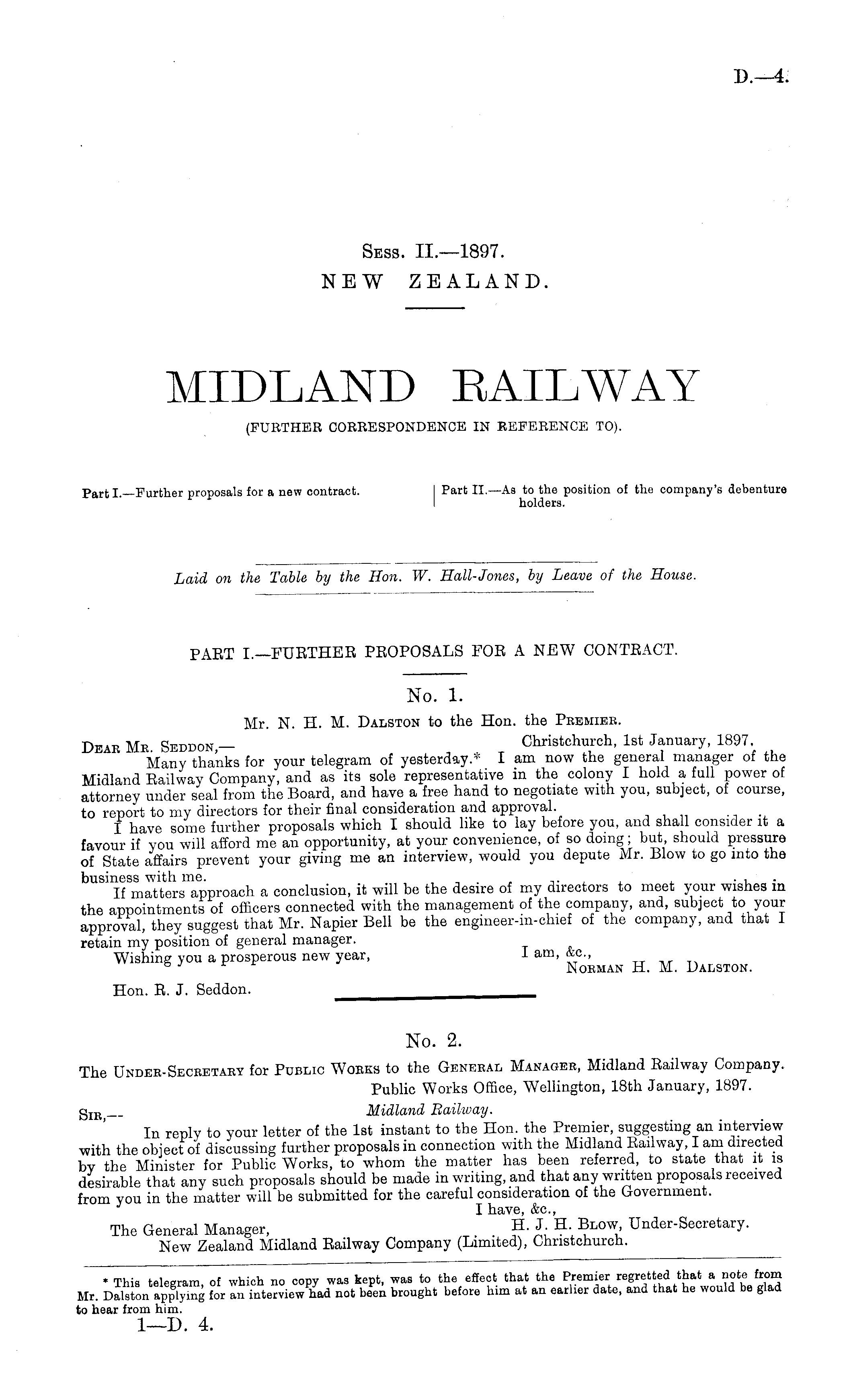 No. 1. Mr. N. H. M. Dalston to the Hon. the Premier. Dear Me. Sbddok — Christchurch, Ist January, 1897 Many thanks for your telegram of yesterday.* I am now the general manager of the Midland Eailway Company, and as its sole representative in the colony I hold a full power of attorney under seal from the Board, and have a free hand to negotiate with you, subject, of course, to report to my directors for their final consideration and approval. I have some further proposals which I should like to lay before you, and shall consider it a favour if you will afford me an opportunity, at your convenience, of so doing; but should pressure of State affairs prevent your giving me an interview, would you depute Mr. Blow to go into the business with me. . , If matters approach a conclusion, it will be the desire of my directors to meet your wishes m the appointments of officers connected with the management of the company, and, subject to your approval, they suggest that Mr. Napier Bell be the engineer-in-chief of the company, and that I retain my position of general manager. Wishing you a prosperous new year, I am, &c, ° J Norman H. M. Dalston. Hon. E. J. Seddon.