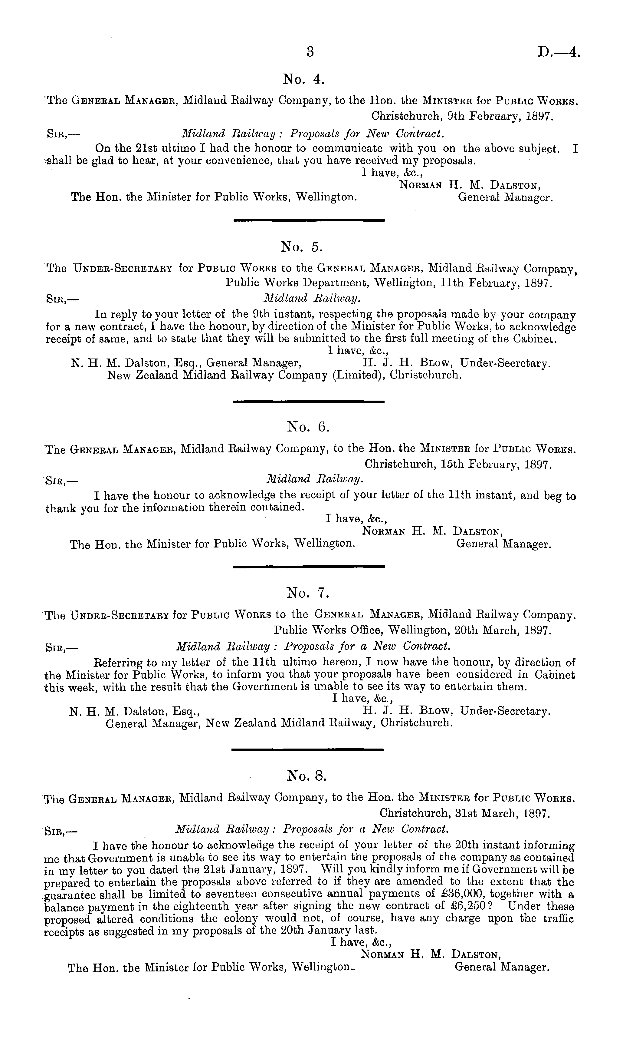 No. 4. The General Manager, Midland Railway Company, to the Hon. the Minister for Public Works. Christchureh, 9th February, 1897. Sir, —■ Midland Railway : Proposals for New Contract. On the 21st ultimo I had the honour to communicate with you on the above subject. I shall be glad to hear, at your convenience, that you have received my proposals. I have, &c, Norman H. M. Dalston, The Hon. the Minister for Public Works, Wellington. General Manager.