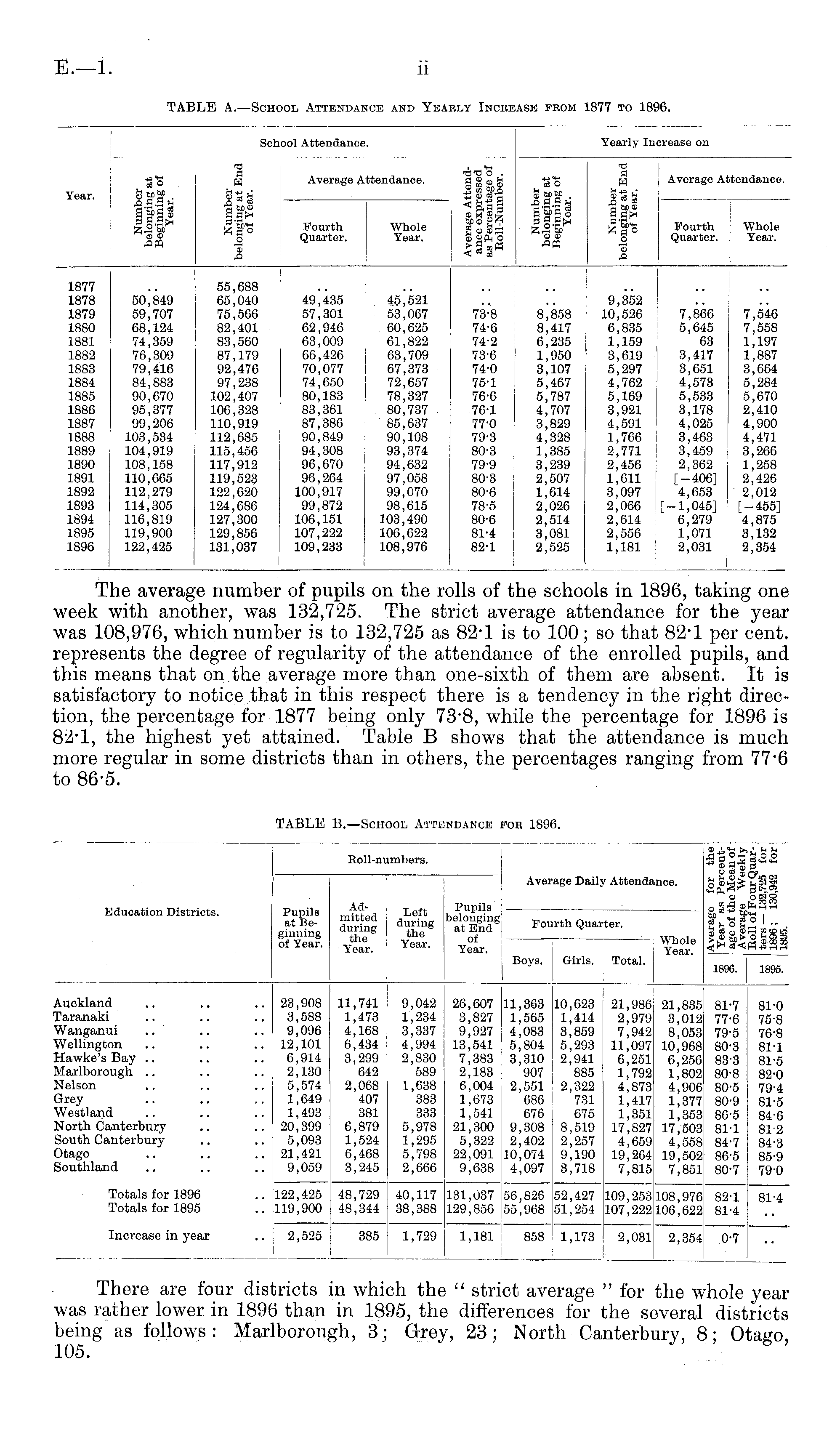TABLE A.—School Attendance and Yearly Increase from 1877 to 1896.