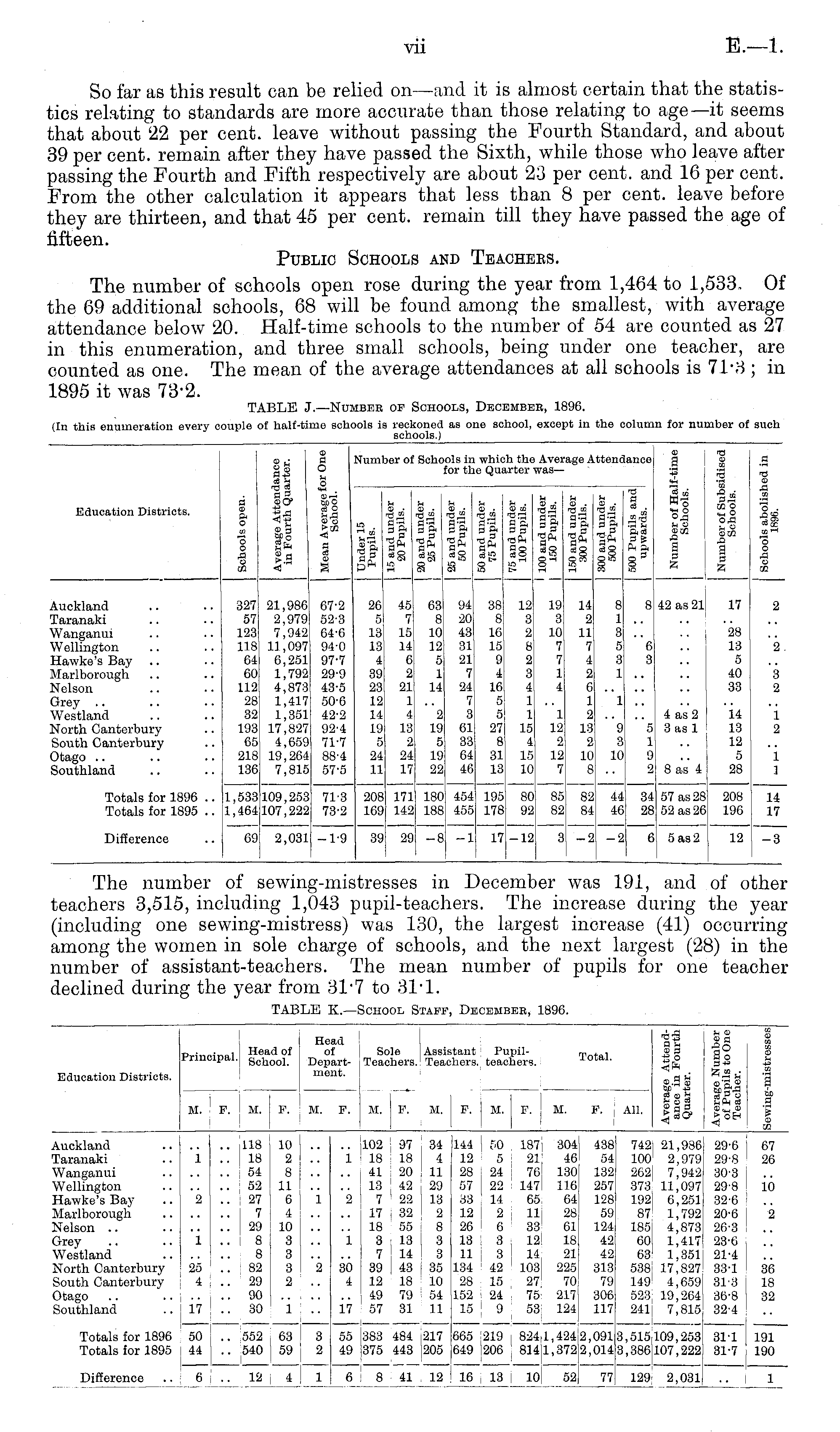 So far as this result can be relied on —and it is almost certain that the statistics relating to standards are more accurate than those relating to age—it seems that about 22 per cent, leave without passing the Fourth Standard, and about 39 per cent, remain after they have passed the Sixth, while those who leave after passing the Fourth and Fifth respectively are about 23 per cent, and 16 per cent. From the other calculation it appears that less than 8 per cent, leave before they are thirteen, and that 45 per cent, remain till they have passed the age of fifteen. Public Schools and Teachbes. The number of schools open rose during the year from 1,464 to 1,533, Of the 69 additional schools, 68 will be found among the smallest, with average attendance below 20. Half-time schools to the number of 54 are counted as 27 in this enumeration, and three small schools, being under one teacher, are counted as one. The mean of the average attendances at all schools is 71*8 ; in 1895 it was 73"2.