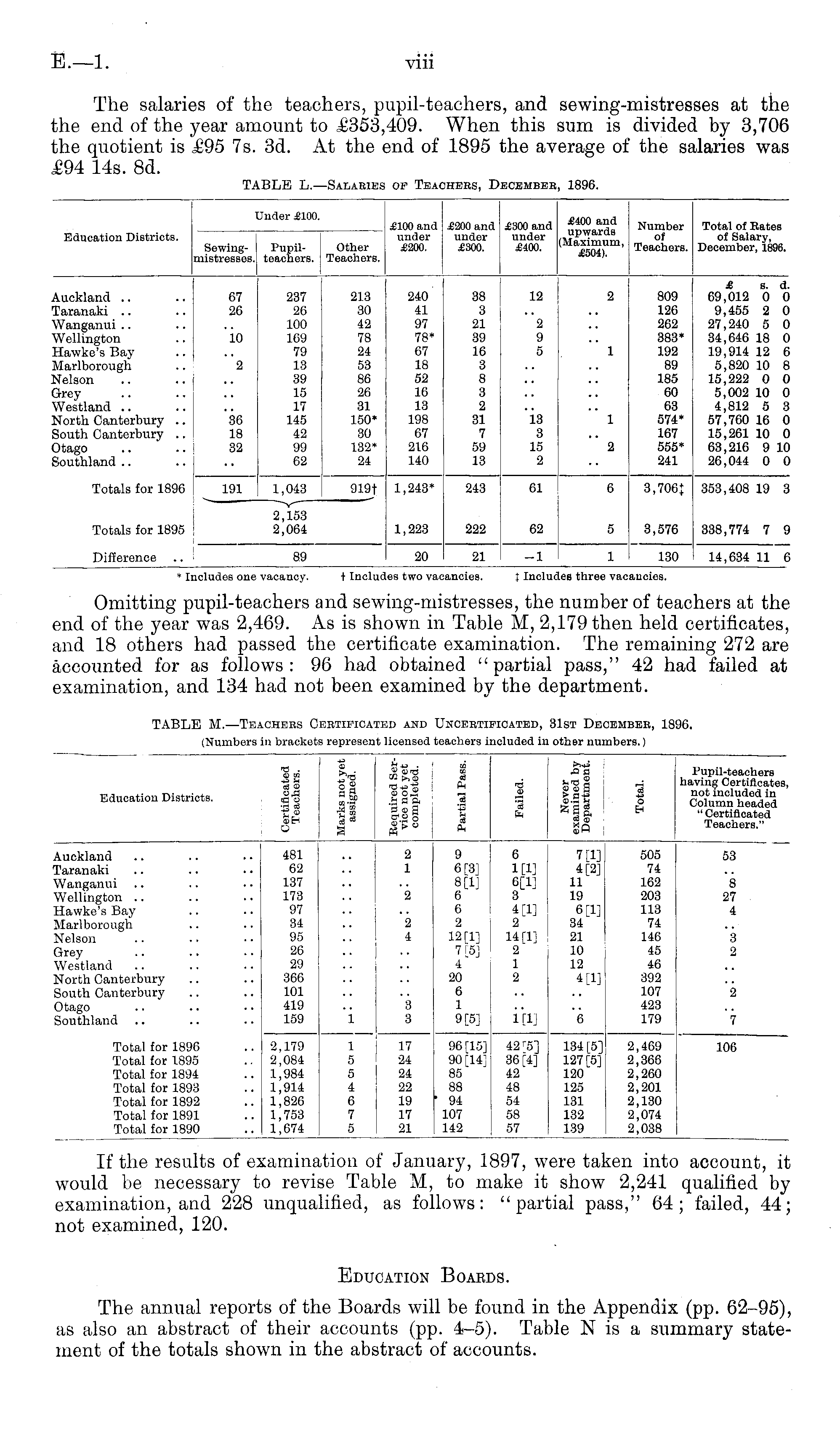 If the results of examination of January, 1897, were taken into account, it would be necessary to revise Table M, to make it show 2,241 qualified by examination, and 228 unqualified, as follows: "partial pass," 64; failed, 44; not examined, 120. Education Boaeds. The annual reports of the Boards will be found in the Appendix (pp. 62-95), as also an abstract of their accounts (pp. 4-5). Table Nis a summary statement of the totals shown in the abstract of accounts.