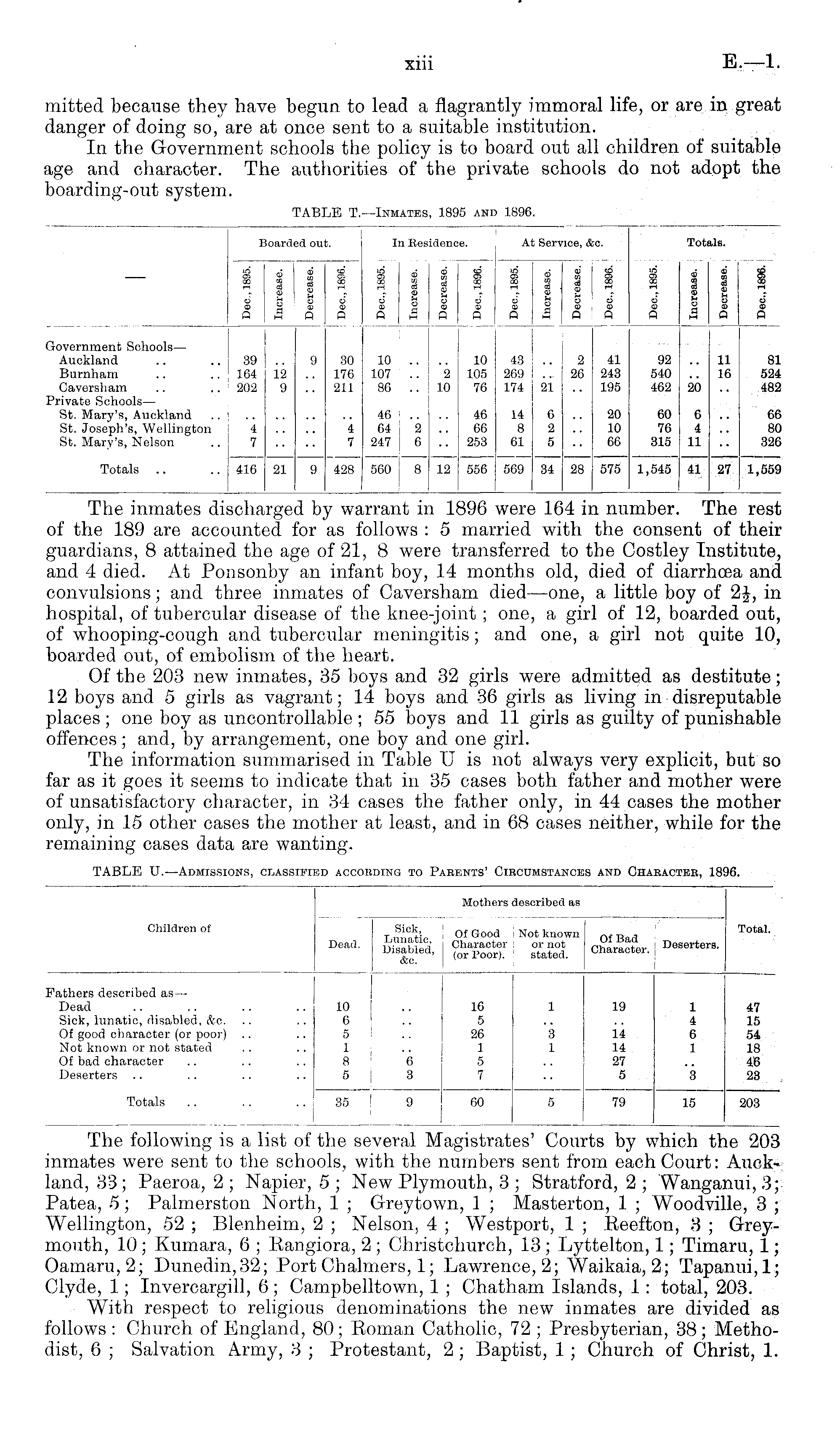 The following is a list of the several Magistrates' Courts by which the 203 inmates were sent to the schools, with the numbers sent from each Court: Auckland, 33 ; Paeroa, 2 ; Napier, 5 ; New Plymouth, 3 ; Stratford, 2 ; Wanganui, 3; Patea, 5; Palmerston North, 1 ; Greytown, 1 ; Masterton, 1 ; Woodville, 3 ; Wellington, 52 ; Blenheim, 2 ; Nelson, 4 ; Westport, 1 ; Eeefton, 3 ; Greymouth, 10; Kumara, 6 ; Kangiora, 2 ; Christchurch, 13 ; Lyttelton, 1; Timaru, 1; oamaru,2; Dunedin,32; Port Chalmers, 1; Lawrence, 2; Waikaia, 2; Tapanui,l; Clyde, 1; Invercargill, 6; Campbelltown, 1 ; Chatham Islands, 1 : total, 203. With respect to religious denominations the new inmates are divided as follows : Church of England, 80; Roman Catholic, 72 ; Presbyterian, 38; Methodist, 6 ; Salvation Army, 3 ; Protestant, 2 ; Baptist, 1 ; Church of Christ, 1.