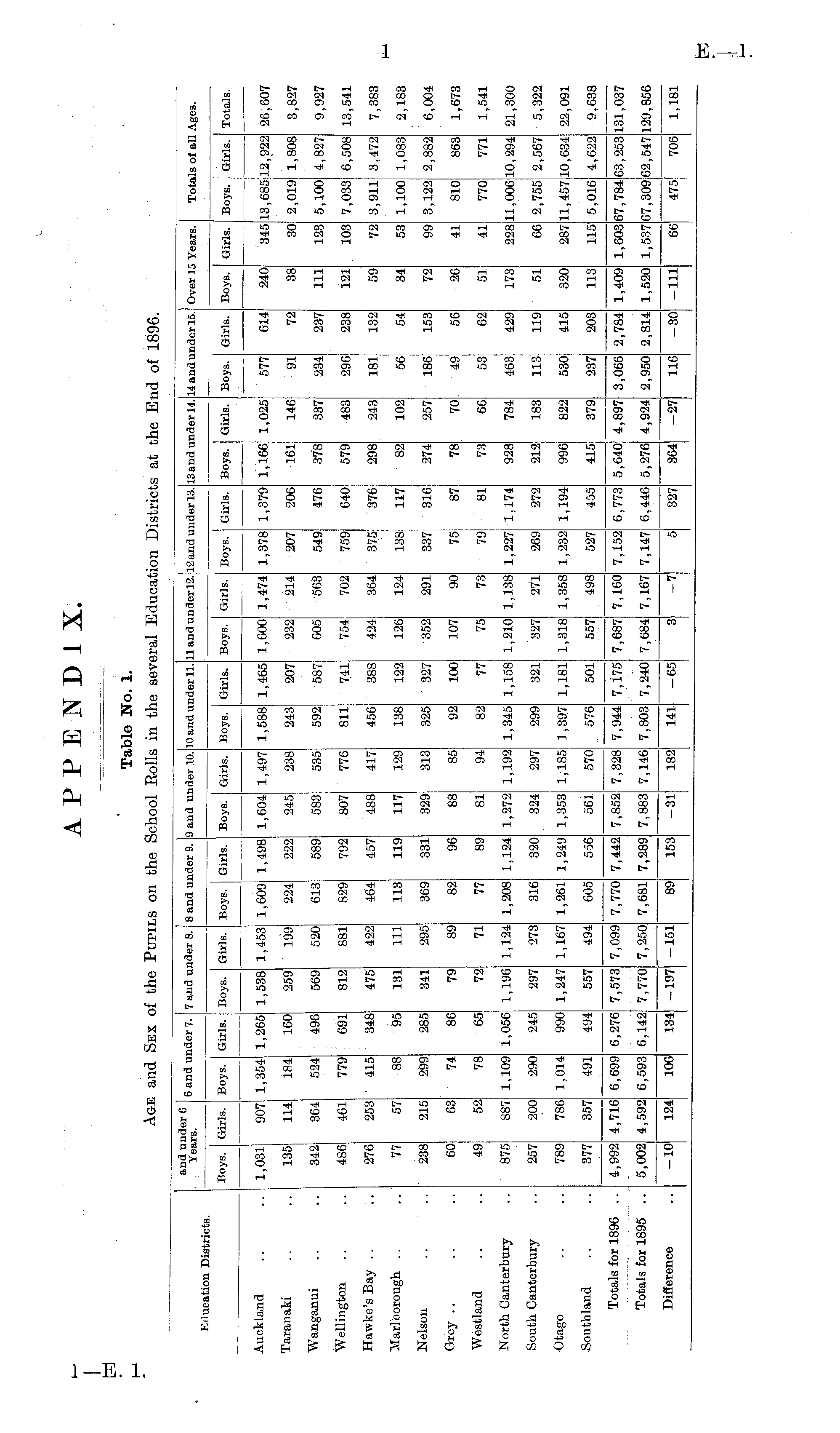 Table No. 1. Age and Sex of the Pupils on the School Rolls in the several Education Districts at the End of 1896.