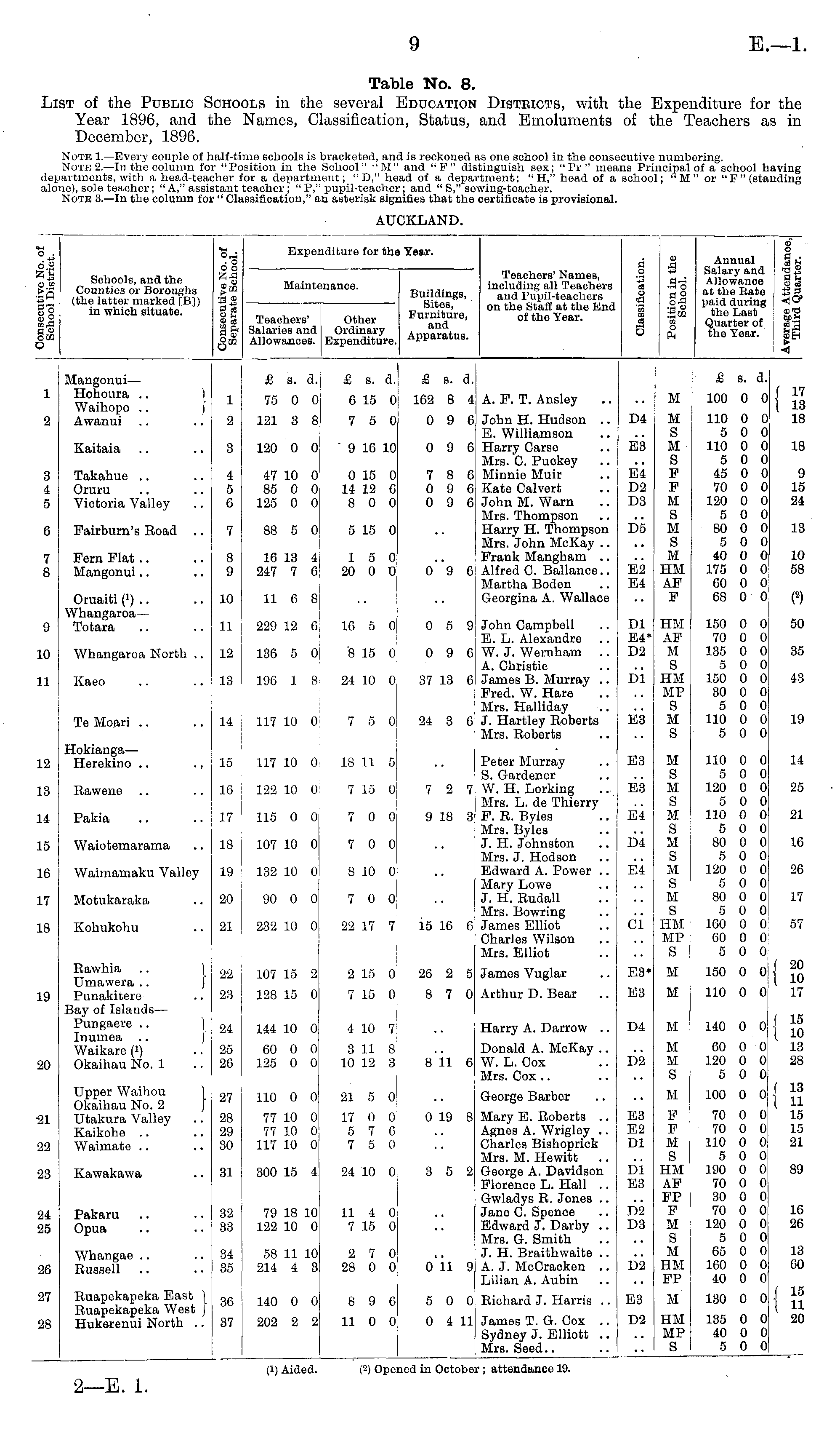Table No. 8. List of the Public Schools in the several Education Districts, with the Expenditure for the Year 1896, and the Names, Classification, Status, and Emoluments of the Teachers as in December, 1896. Note I.—Every couple of half-time schools is bracketed, and is reckoned as one school in the consecutive numbering. Note 2.—ln the column for "Position in the School" "M" and "F" distinguish sex; "Pr" means Principal of a school having departments, with a head-teacher for a department; ; 'D," head of a department; "H," head of a school; "M" or "P" (standing alone), sole teacher; "A," assistant teacher; "P," pupil-teachor; and " S," sewing- teacher. Note 3.—ln the column for " Classification," an asterisk signifies that the certificate is provisional.