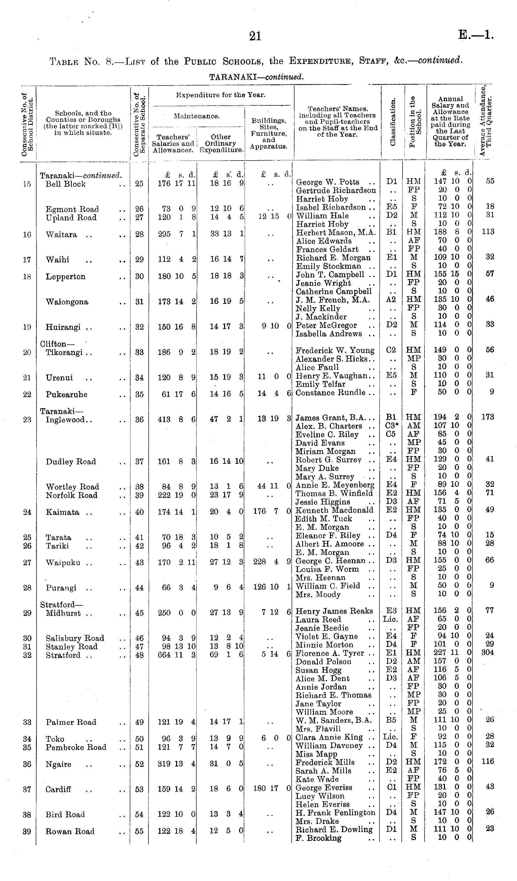 Table No. 8. —List of the Public Schools, the Expenditure, Staff, &c.— continued. TARANAKI— continued.