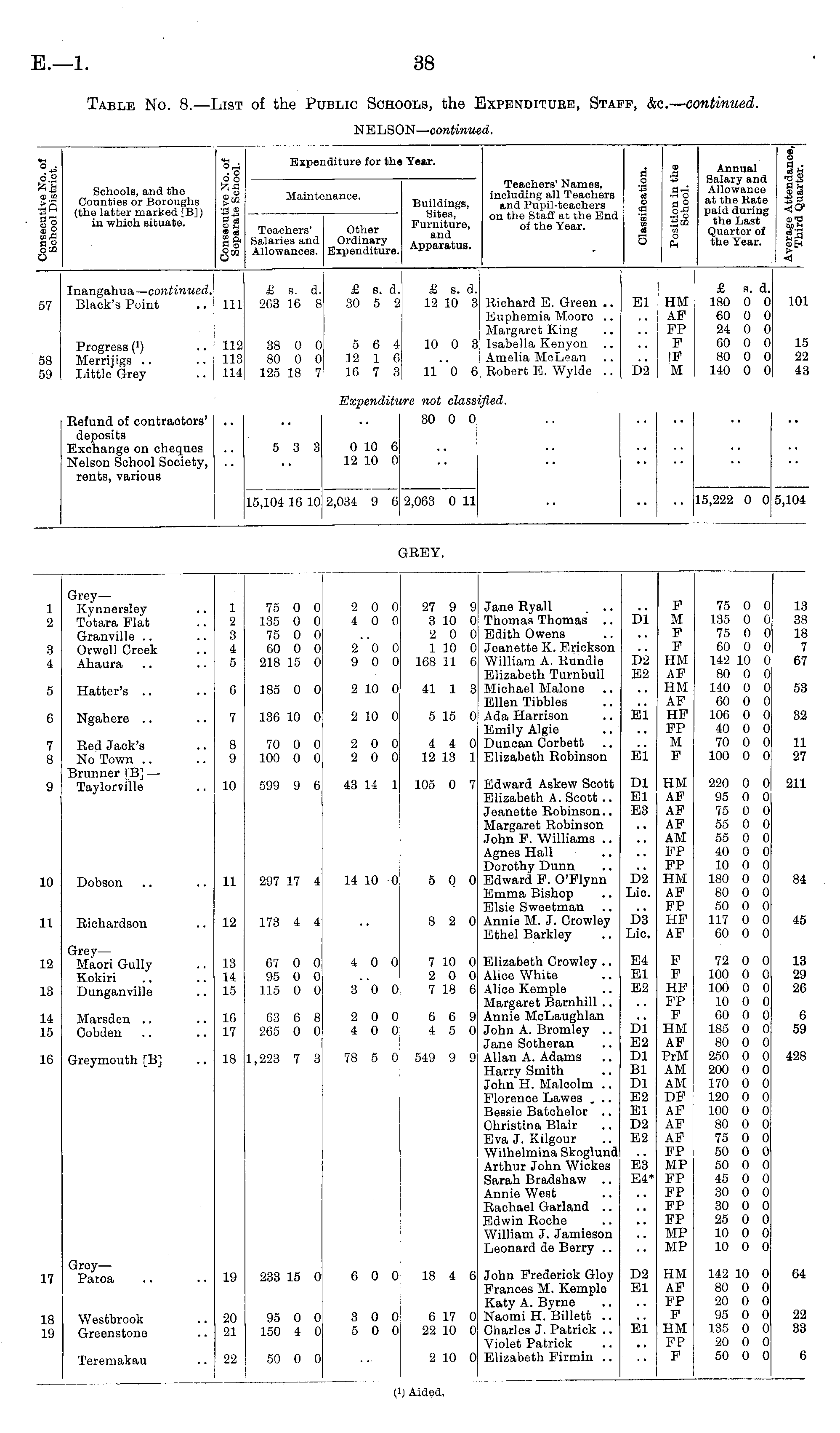 Table No. 8.—List of the Public Schools, the Expenditure, Staff, &c. — continued. NELSON— continued.