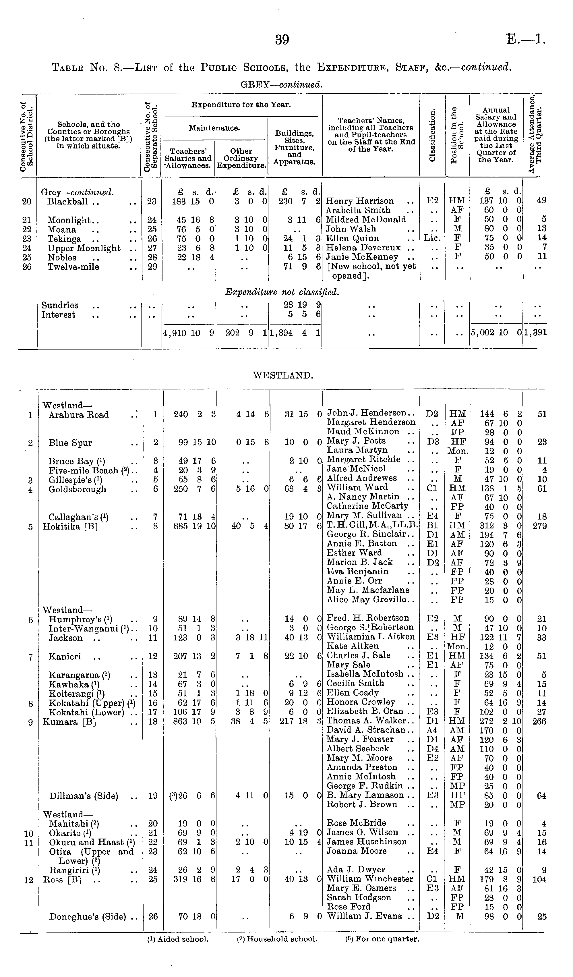 Table No. 8.—List of the Public Schools, the Expenditure, Staff, &c.— continued. GREY— continued.