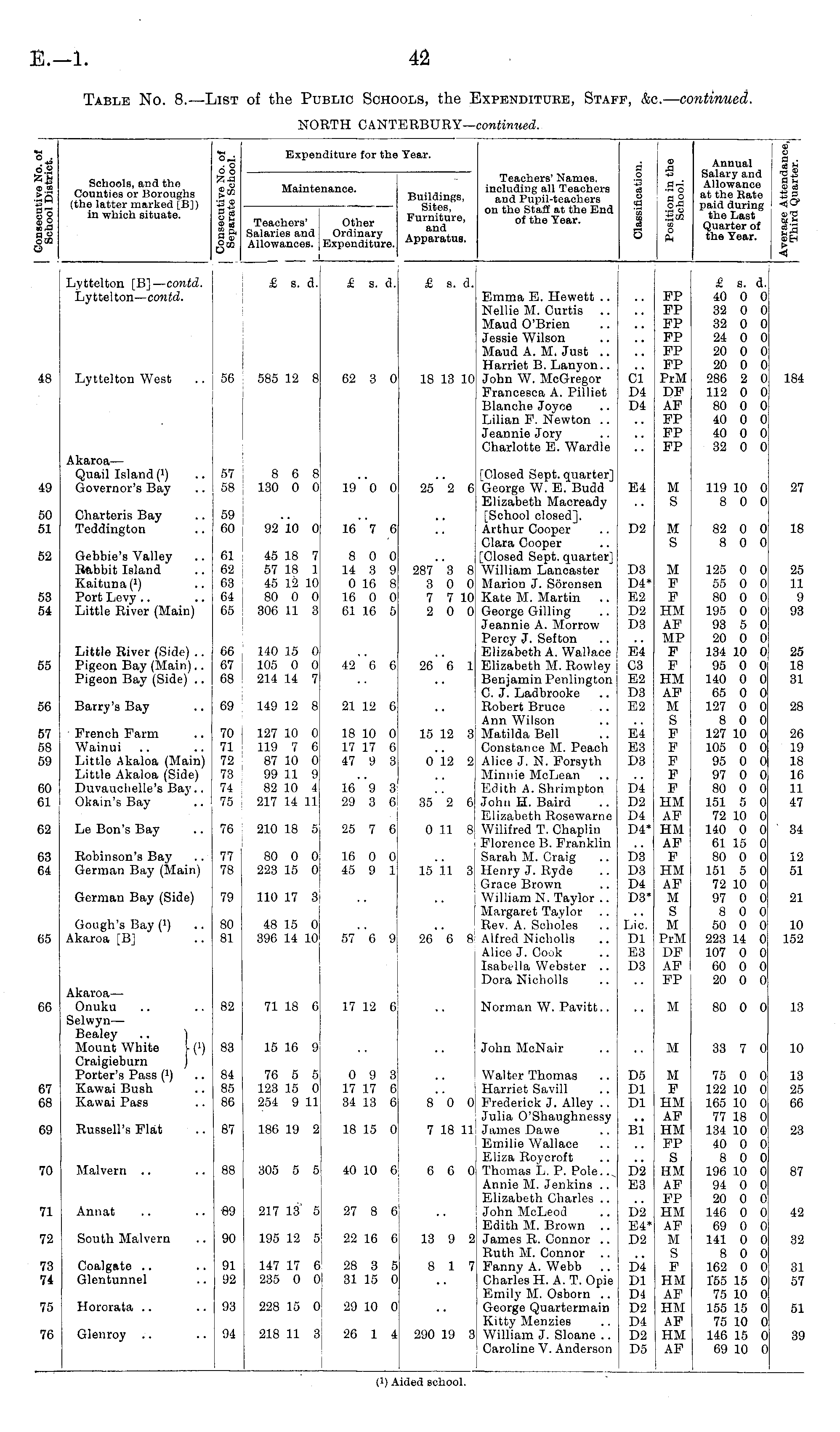 Table No. 8.—List of the Public Schools, the Expenditure, Staff, &c. — continued. NORTH CANTERBURY— continued.