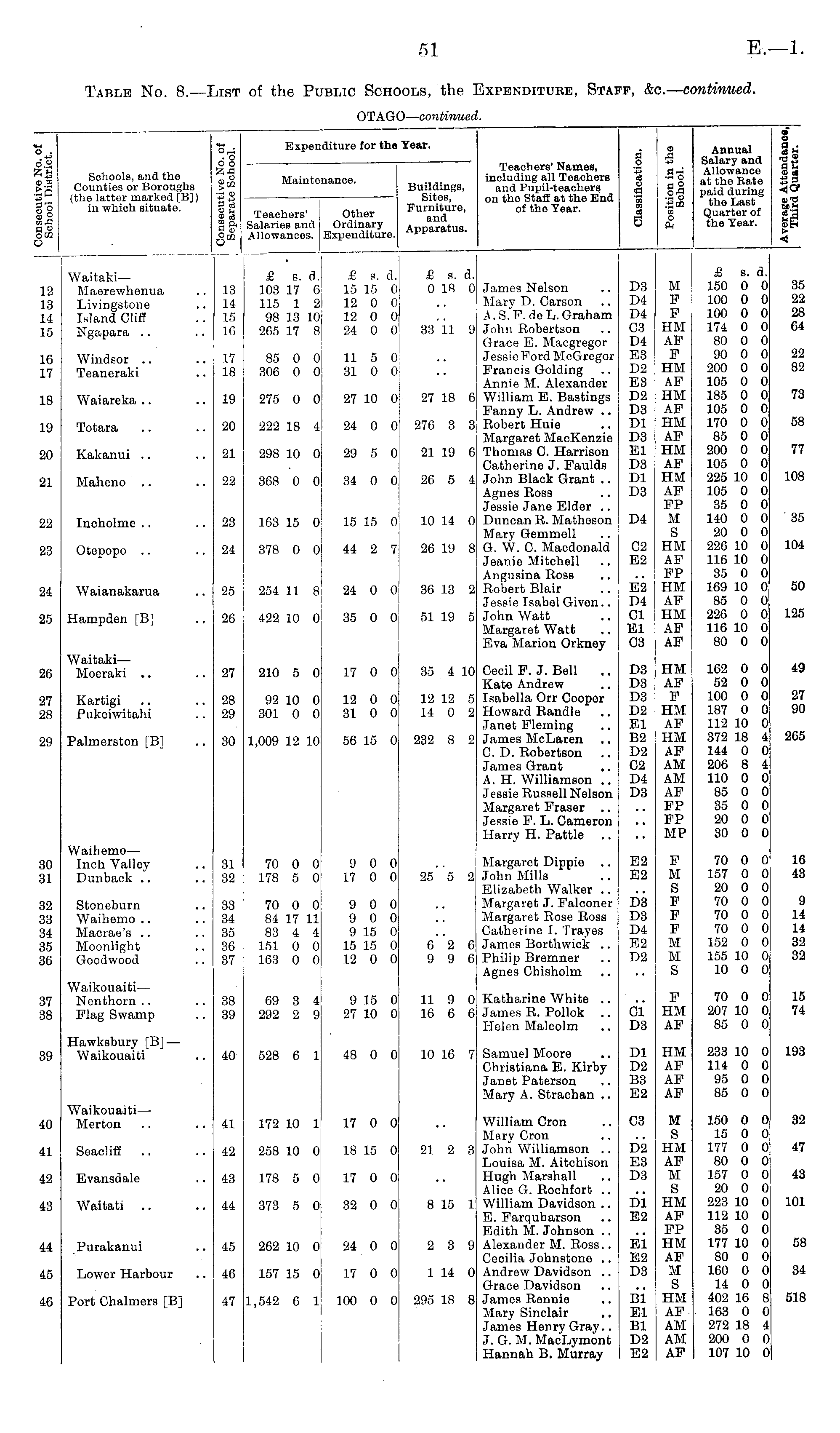 Table No. 8.—List of the Public Schools, the Expenditure, Staff, &c.— continued. OTAGO— continued.