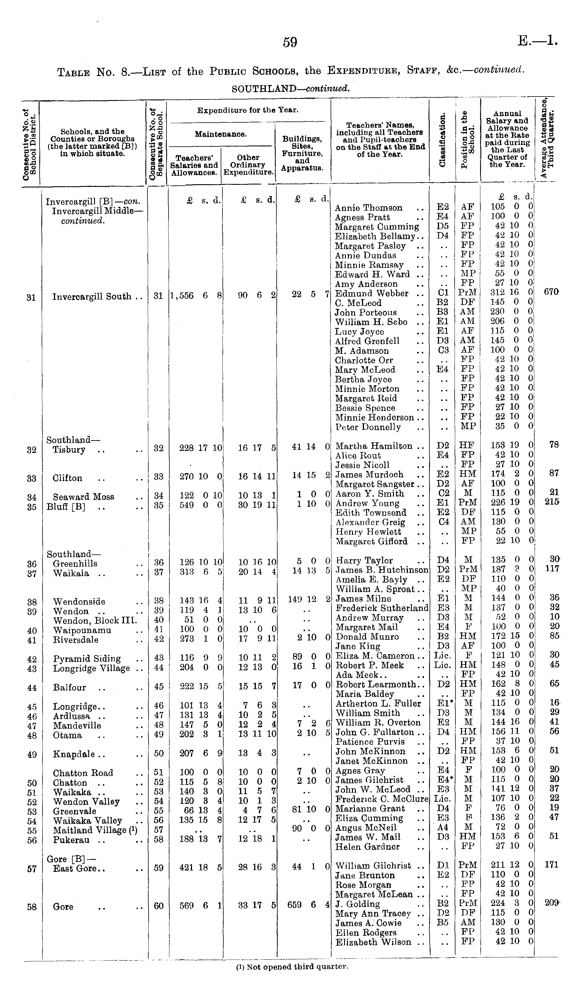 Table No. 8.—List of the Public Schools, the Expenditure, Staff, &c.— continued. SOUTHLAND— continued.