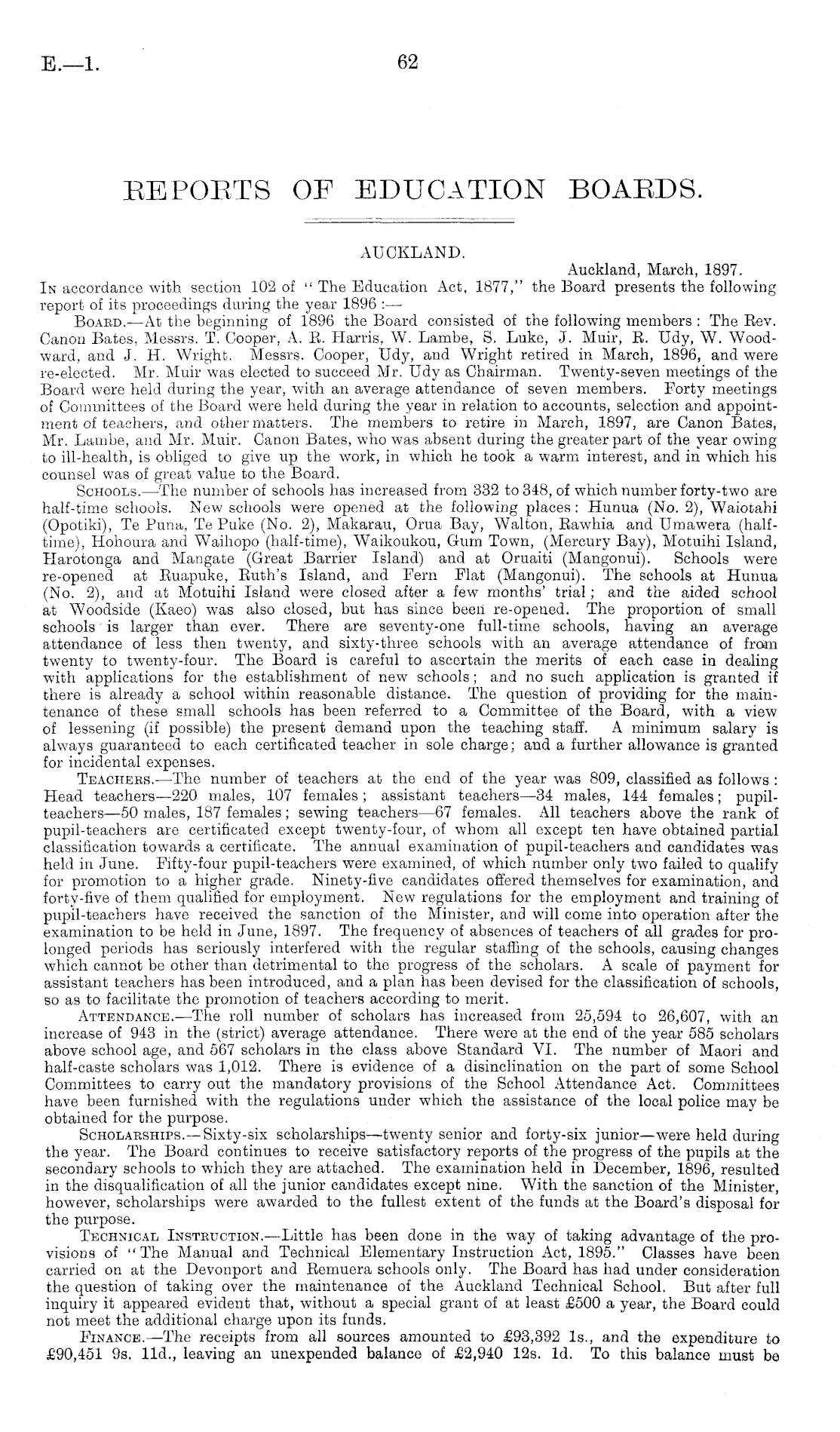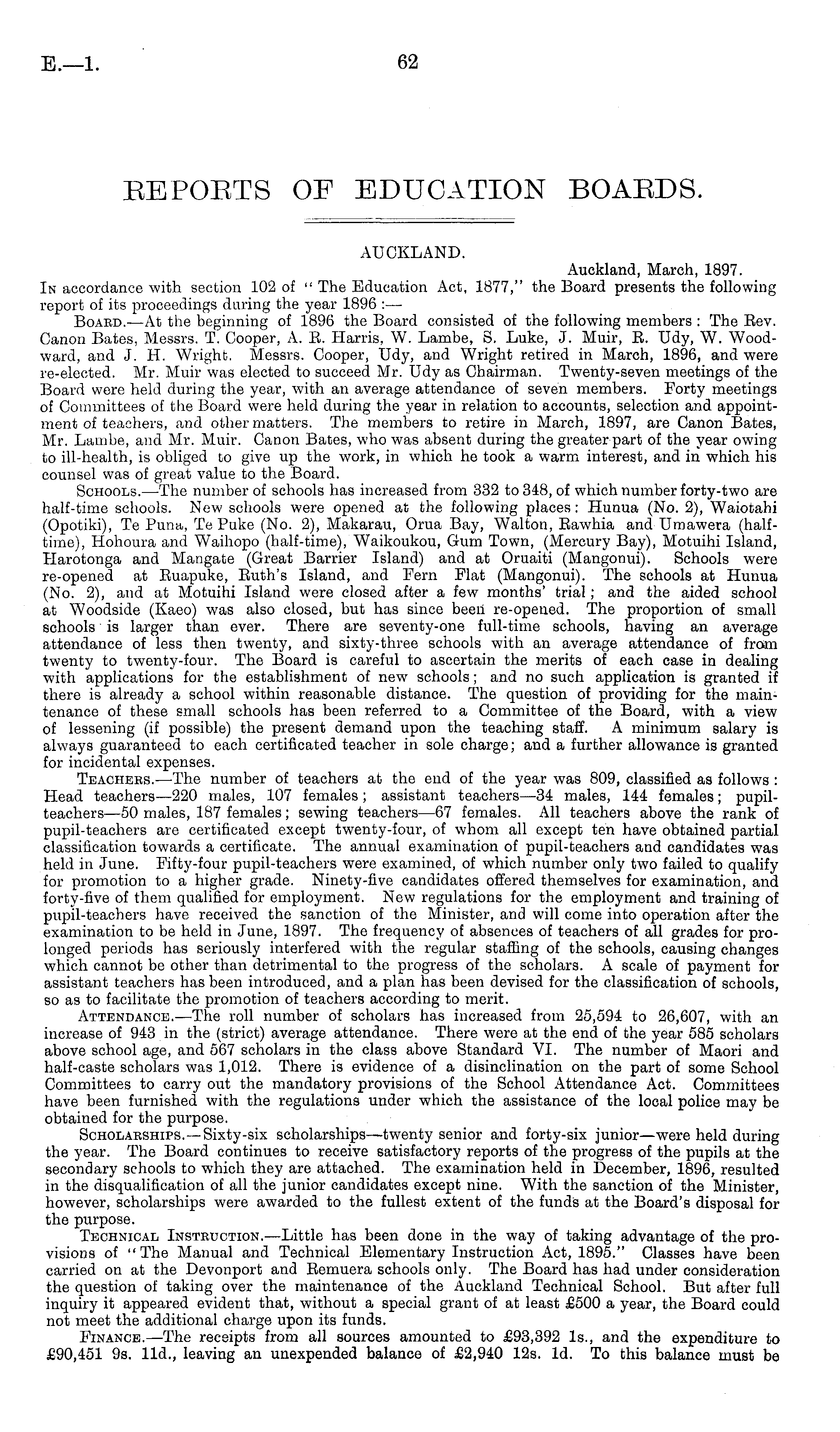 AUCKLAND. Auckland, March, 1897. In accordance with section 102 of " The Education Act, 1877," the Board presents the following report of its proceedings daring the year 1896 : — Boaed. —At the beginning of 1896 the Board consisted of the following members : The Eev. Canon Bates, Messrs. T. Cooper, A. E. Harris, W. Lambe, S. Luke, J. Muir, E. Udy, W. Woodward, and J. H. Wright. Messrs. Cooper, Udy, and Wright retired in March, 1896, and were re-elected. Mr. Muir was elected to succeed Mr. Udy as Chairman. Twenty-seven meetings of the Board were held during the year, with an average attendance of seven members. Forty meetings of Committees of the Board were held during the year in relation to accounts, selection and appointment of teachers, and other matters. The members to retire in March, 1897, are Canon Bates, Mr. Lambe, and Mr. Muir. Canon Bates, who was absent during the greater part of the year owing to ill-health, is obliged to give up the work, in which he took a warm interest, and in which his counsel was of great value to the Board. Schools. —The number of schools has increased from 332 to 348, of which number forty-two are half-time schools. New schools were opened at the following places : Hunua (No. 2), Waiotahi (Opotiki), Te Puna,, Tβ Puke (No. 2), Makarau, Orua Bay, Walton, Eawhia and Umawera (halftime), Hohoura and Waihopo (half-time), Waikoukou, Gum Town, (Mercury Bay), Motuihi Island, Harotonga and Mangate (Great Barrier Island) and at Oruaiti (Mangonui). Schools were re-opened at Euapuke, Euth's Island, and Fern Flat (Mangonui). The schools at Hunua (No. 2), and at Motuihi Island were closed after a few months' trial; and the aided school at Woodside (Kaeo) was also closed, but has since been re-opened. The proportion of small schools is larger than ever. There are seventy-one full-time schools, having an average attendance of less then twenty, and sixty-three schools with an average attendance of from twenty to twenty-four. The Board is careful to ascertain the merits of each case in dealing with applications for the establishment of new schools; and no such application is granted if there is already a school within reasonable distance. The question of providing for the maintenance of these small schools has been referred to a Committee of the Board, with a view of lessening (if possible) the present demand upon the teaching staff. A minimum salary is always guaranteed to each certificated teacher in sole charge; and a further allowance is granted for incidental expenses. Teachbes. —The number of teachers at the end of the year was 809, classified as follows : Head teachers—22o males, 107 females; assistant teachers—34 males, 144 females; pupilteachers —50 males, 187 females; sewing teachers —67 females. All teachers above the rank of pupil-teachers are certificated except twenty-four, of whom all except ten have obtained partial classification towards a certificate. The annual examination of pupil-teachers and candidates was held in June. Fifty-four pupil-teachers were examined, of which number only two failed to qualify for promotion to a higher grade. Ninety-five candidates offered themselves for examination, and forty-five of them qualified for employment. New regulations for the employment and training of pupil-teachers have received the sanction of the Minister, and will come into operation after the examination to be held in June, 1897. The frequency of absences of teachers of all grades for prolonged periods has seriously interfered with the regular staffing of the schools, causing changes which cannot be other than detrimental to the progress of the scholars. A scale of payment for assistant teachers has been introduced, and a plan has been devised for the classification of schools, so as to facilitate the promotion of teachers according to merit. Attendance. —The roll number of scholars has increased from 25,594 to 26,607, with an increase of 943 in the (strict) average attendance. There were at the end of the year 585 scholars above school age, and 567 scholars in the class above Standard VI. The number of Maori and half-caste scholars was 1,012. There is evidence of a disinclination on the part of some School Committees to carry out the mandatory provisions of the School Attendance Act. Committees have been furnished with the regulations under which the assistance of the local police may be obtained for the purpose. Scholarships.—Sixty-six scholarships—twenty senior and forty-six junior—were held during the year. The Board continues to receive satisfactory reports of the progress of the pupils at the secondary schools to which they are attached. The examination held in December, 1896, resulted in the disqualification of all the junior candidates except nine. With the sanction of the Minister, however, scholarships were awarded to the fullest extent of the funds at the Board's disposal for the purpose. Technical Instruction. —Little has been done in the way of taking advantage of the provisions of "The Manual and Technical Elementary Instruction Act, 1895." Classes have been carried on at the Devonport and Eemuera schools only. The Board has had under consideration the question of taking over the maintenance of the Auckland Technical School. But after full inquiry it appeared evident that, without a special grant of at least £500 a year, the Board could not meet the additional charge upon its funds. Finance. —The receipts from all sources amounted to £93,392 Is., and the expenditure to £90,451 9s. lid., leaving an unexpended balance of £2,940 12s. Id. To this balance must be