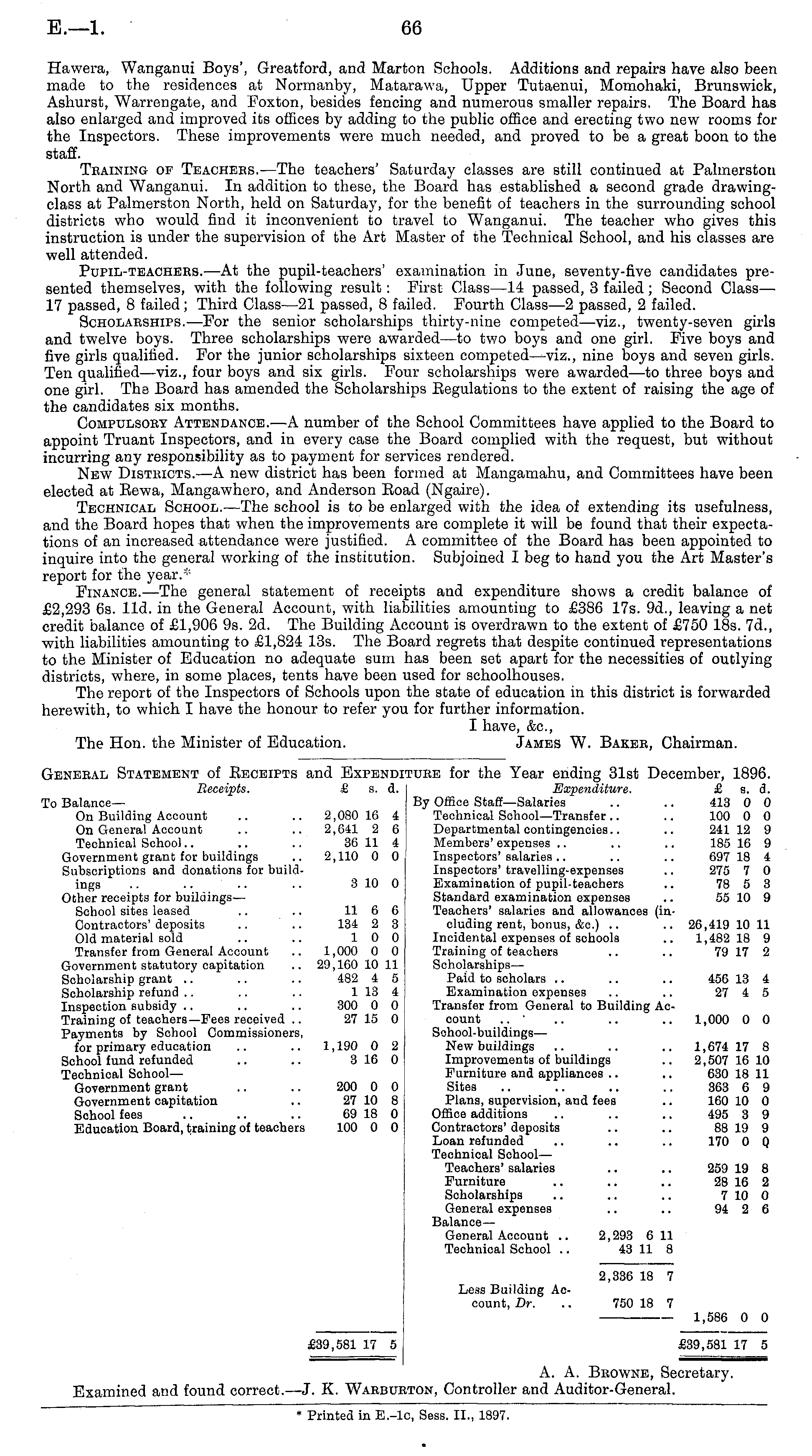 Hawera, Wanganui Boys', Greatford, and Marton Schools. Additions and repairs have also been made to the residences at Normanby, Matarawa, Upper Tutaenui, Momohaki, Brunswick, Ashurst, Warrengate, and Foxton, besides fencing and numerous smaller repairs. The Board has also enlarged and improved its offices by adding to the public office and erecting two new rooms for the Inspectors. These improvements were much needed, and proved to be a great boon to the staff. Training op Teachers.—The teachers' Saturday classes are still continued at Palmerston North and Wanganui. In addition to these, the Board has established a second grade drawingclass at Palmerston North, held on Saturday, for the benefit of teachers in the surrounding school districts who would find it inconvenient to travel to Wanganui. The teacher who gives this instruction is under the supervision of the Art Master of the Technical School, and his classes are well attended. Pupil-teachers.—At the pupil-teachers' examination in June, seventy-five candidates presented themselves, with the following result: First Class—l 4 passed, 3 failed; Second Class— 17 passed, 8 failed; Third Class—2l passed, 8 failed. Fourth Class—2 passed, 2 failed. Scholarships.—For the senior scholarships thirty-nine competed—viz., twenty-seven girls and twelve boys. Three scholarships were awarded—to two boys and one girl. Five boys and five girls qualified. For the junior scholarships sixteen competed—viz., nine boys and seven girls. Ten qualified—viz., four boys and six girls. Four scholarships were awarded—to three boys and one girl. The Board has amended the Scholarships Eegulations to the extent of raising the age of the candidates six months. Compulsory Attendance.—A number of the School Committees have applied to the Board to appoint Truant Inspectors, and in every case the Board complied with the request, but without incurring any responsibility as to payment for services rendered. New Distbicts. —A new district has been formed at Mangamahu, and Committees have been elected at Eewa, Mangawhero, and Anderson Eoad (Ngaire). Technical School. —The school is to be enlarged with the idea of extending its usefulness, and the Board hopes that when the improvements are complete it will be found that their expectations of an increased attendance were justified. A committee of the Board ha 3 been appointed to inquire into the general working of the insticution. Subjoined I beg to hand you the Art Master's report for the year.* Finance. —The general statement of receipts and expenditure shows a credit balance of £2,293 6s. lid. in the General Account, with liabilities amounting to £386 17s. 9d., leaving a net credit balance of £1,906 9s. 2d. The Building Account is overdrawn to the extent of £750 18s. 7d., with liabilities amounting to £1,824 13s. The Board regrets that despite continued representations to the Minister of Education no adequate sum has been set apart for the necessities of outlying districts, where, in some places, tents have been used for schoolhouses. The report of the Inspectors of Schools upon the state of education in this district is forwarded herewith, to which I have the honour to refer you for further information. I have, &c, The Hon. the Minister of Education. James W. Bakee, Chairman.