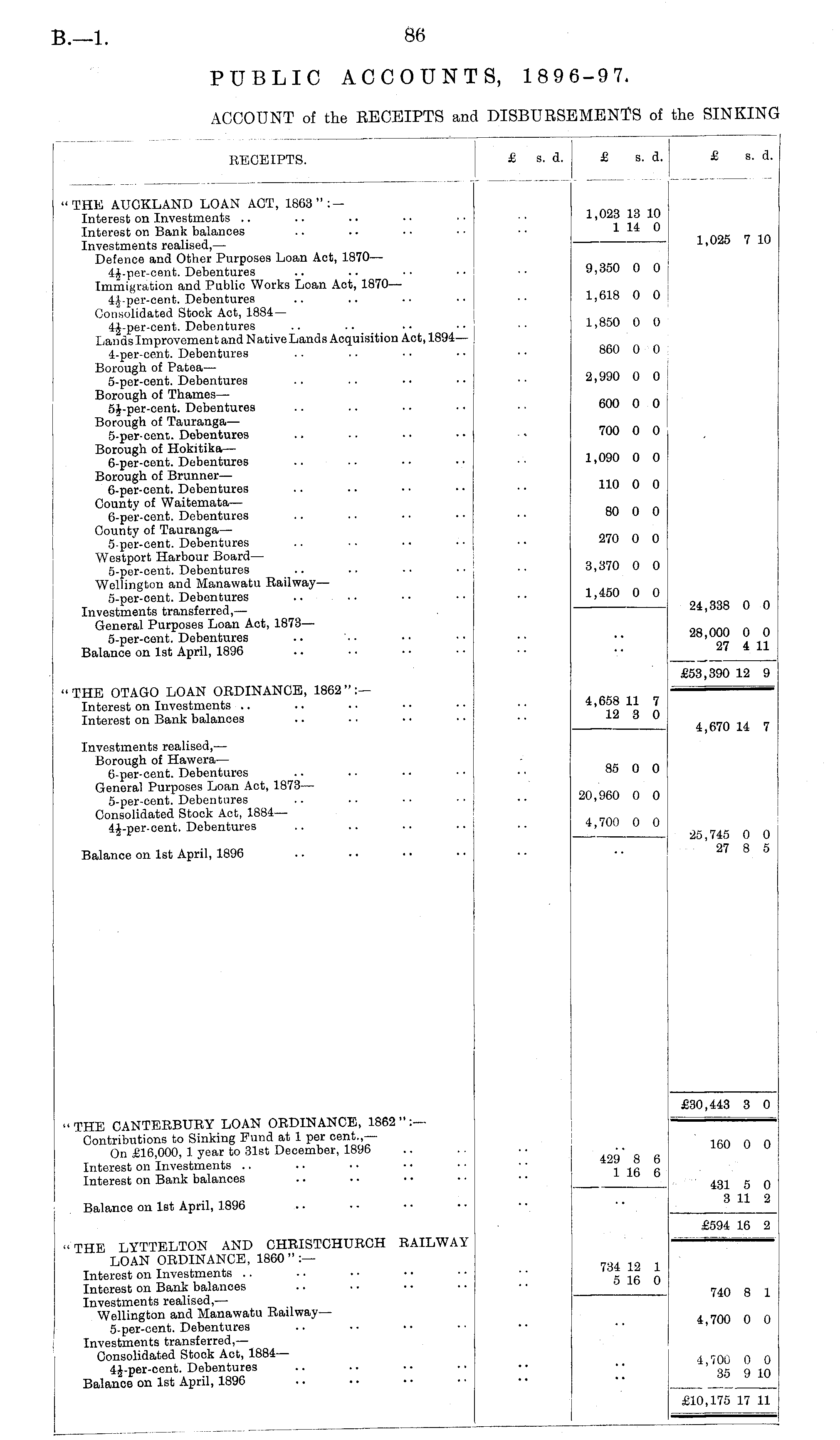 RECEIPTS. £ s. d. £ s. d. 1,023 13 10 1 14 0 ] £ s. d. 1,025 7 10 "THE AUCKLAND LOAN ACT, 1863":Interest on Investments Interest on Bank balances Investments realised, — Defence and Other Purposes Loan Act, 1870 — 4§-per-cent. Debentures Immigration and Public Works Loan Act, 1870 — 4J-per-cent. Debentures Consolidated Stock Act, 1884— 4J-per-cent. Debentures Lands Improvement and Native Lands Acquisition Act, 1894 — 4-per-cent. Debentures Borough of Patea— 5-per-cent. Debentures Borough of Thames — 5J-per-cent. Debentures Borough of Tauranga— 5-per-cent. Debentures Borough of Hokitika — 6-per-cent. Debentures Borough of Brunner — 6-per-cent. Debentures County of Waitemata — 6-per-cent. Debentures County of Tauranga — 5-per-cent. Debentures Westport Harbour Board— 5-per-cent. Debentures Wellington and Manawatu Railway— 5-per-cent. Debentures .. Investments transferred, — General Purposes Loan Act, 1873 — 5-per-cent. Debentures Balance on 1st April, 1896 9,350 0 0 j 1,618 0 0 1,850 0 0 860 0 0 2,990 0 0 600 0 0 700 0 0 1,090 0 0 110 0 0 80 0 0 270 0 0 3,370 0 0 1,450 0 0 24,338 0 0 28,000 0 0 27 4 11 " THE OTAGO LOAN ORDINANCE, 1862 " :— Interest on Investments Interest on Bank balances 4,658 11 7 12 3 0 £53,390 12 9 Investments realised, — Borough of Hawera — 6-per-cent. Debentures General Purposes Loan Act, 1873— 5-per-cent. Debentures Consolidated Stock Act, 1884— 4J-per-cent. Debentures 85 0 0 4,670 14 7 20,960 0 0 25,745 0 0 27 8 5 4,700 0 0 Balance on 1st April, 1896 "THE CANTERBURY LOAN ORDINANCE, 1862":— Contributions to Sinking Fund at 1 per cent.,— On £16,000, 1 year to 31st December, 1896 Interest on Investments Interest on Bank balances £30,443 3 0 429 8 6 1 16 6 160 0 0 431 5 0 3 11 2 Balance on 1st April, 1896 "THE LYTTELTON AND CHRISTCHURCH RAILWAY LOAN ORDINANCE, I860":— Interest on Investments Interest on Bank balances Investments realised, — Wellington and Manawatu Railway— 5-per-cent. Debentures Investments transferred,— Consolidated Stock Act, 1884— 4§-per-cent. Debentures Balance on 1st April, 1896 £594 16 2 734 12 1 5 16 0 740 8 1 4,700 0 0 4,700 0 0 35 9 10 £10,175 17 11