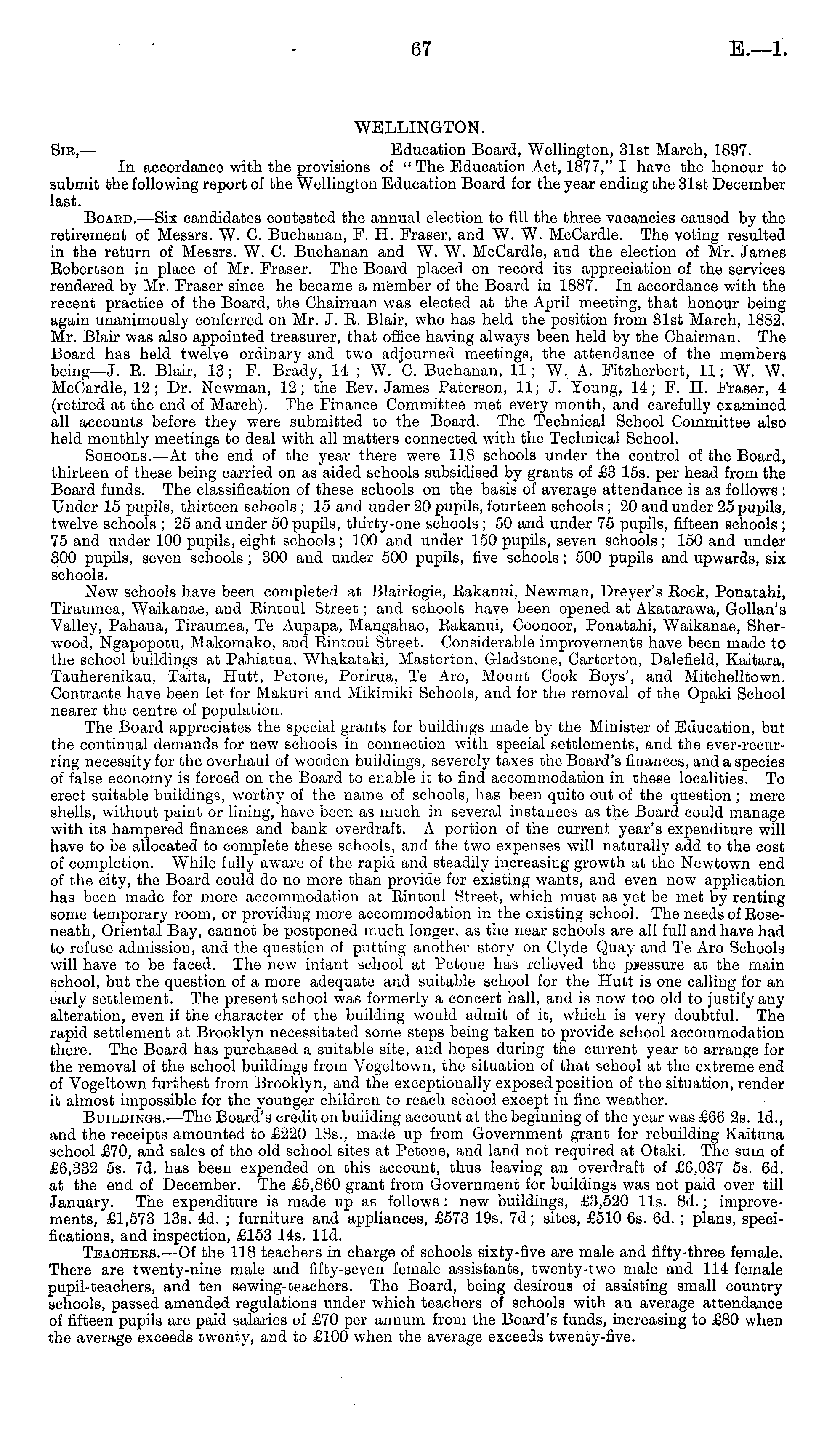 WELLINGTON. Sm, — Education Board, Wellington, 31st March, 1897. In accordance with the provisions of " The Education Act, 1877," I have the honour to submit the following report of the Wellington Education Board for the year ending the 31st December last. Boabd.—Six candidates contested the annual election to fill the three vacancies caused by the retirement of Messrs. W. C. Buchanan, F. H. Fraser, and W. W. McCardle. The voting resulted in the return of Messrs. W. C. Buchanan and W. W. McCardle, and the election of Mr. James Eobertson in place of Mr. Fraser. The Board placed on record its appreciation of the services rendered by Mr. Fraser since he became a member of the Board in 1887. In accordance with the recent practice of the Board, the Chairman was elected at the April meeting, that honour being again unanimously conferred on Mr. J. E. Blair, who has held the position from 31st March, 1882. Mr. Blair was also appointed treasurer, that office having always been held by the Chairman. The Board has held twelve ordinary and two adjourned meetings, the attendance of the members being— J. E. Blair, 13; F. Brady, 14 ;W. C. Buchanan, 11 ; W. A. Fitzherbert, 11; W. W. McCardle, 12; Dr. Newman, 12; the Eev. James Paterson, 11; J. Young, 14; F. H. Fraser, 4 (retired at the end of March). The Finance Committee met every month, and carefully examined all accounts before they were submitted to the Board. The Technical School Committee also held monthly meetings to deal with all matters connected with the Technical School. Schools.—At the end of the year there were 118 schools under the control of the Board, thirteen of these being carried on as aided schools subsidised by grants of £3 15s. per head from the Board funds. The classification of these schools on the basis of average attendance is as follows : Under 15 pupils, thirteen schools ; 15 and under 20 pupils, fourteen schools ; 20 and under 25 pupils, twelve schools ; 25 and under 50 pupils, thirty-one schools; 50 and under 75 pupils, fifteen schools ; 75 and under 100 pupils, eight schools; 100 and under 150 pupils, seven schools; 150 and under 300 pupils, seven schools; 300 and under 500 pupils, five schools; 500 pupils and upwards, six schools. New schools have been completed at Blairlogie, Eakanui, Newman, Dreyer's Eock, Ponatahi, Tiraumea, Waikanae, and Eintoul Street; and schools have been opened at Akatarawa, Gollan's Valley, Pahaua, Tiraumea, Te Aupapa, Mangahao, Eakanui, Coonoor, Ponatahi, Waikanae, Sherwood, Ngapopotu, Makomako, and Eintoul Street. Considerable improvements have been made to the school buildings at Pahiatua, Whakataki, Masterton, Gladstone, Carterton, Dalefield, Kaitara, Tauherenikau, Taita, Plutt, Petone, Porirua, Te Aro, Mount Cook Boys', and Mitchelltown. Contracts have been let for Makuri and Mikimiki Schools, and for the removal of the Opaki School nearer the centre of population. The Board appreciates the special grants for buildings made by the Minister of Education, but the continual demands for new schools in connection with special settlements, and the ever-recur-ring necessity for the overhaul of wooden buildings, severely taxes the Board's finances, and a species of false economy is forced on the Board to enable it to find accommodation in these localities. To erect suitable buildings, worthy of the name of schools, has been quite out of the question ; mere shells, without paint or lining, have been as much in several instances as the Board could manage with its hampered finances and bank overdraft. A portion of the current year's expenditure will have to be allocated to complete these schools, and the two expenses will naturally add to the cost oE completion. While fully aware of the rapid and steadily increasing growth at the Newtown end of the city, the Board could do no more than provide for existing wants, and even now application has been made for more accommodation at Eintoul Street, which must as yet be met by renting some temporary room, or providing more accommodation in the existing school. The needs of Boseneath, Oriental Bay, cannot be postponed much longer, as the near schools are all full and have had to refuse admission, and the question of putting another story on Clyde Quay and Te Aro Schools will have to be faced. The new infant school at Petone has relieved the pressure at the main school, but the question of a more adequate and suitable school for the Hutt is one calling for an early settlement. The present school was formerly a concert hall, and is now too old to justify any alteration, even if the character of the building would admit of it, which is very doubtful. The rapid settlement at Brooklyn necessitated some steps being taken to provide school accommodation there. The Board has purchased a suitable site, and hopes during the current year to arrange for the removal of the school buildings from Vogeltown, the situation of that school at the extreme end of Vogeltown furthest from Brooklyn, and the exceptionally exposed position of the situation, render it almost impossible for the younger children to reach school except in fine weather. Buildings.—The Board's credit on building account at the beginning of the year was £66 2s. Id., and the receipts amounted to £220 18s., made up from Government grant for rebuilding Kaituna school £70, and sales of the old school sites at Petone, and land not required at Otaki. The sum of £6,332 ss. 7d. has been expended on this account, thus leaving an overdraft of £6,037 ss. 6d. at the end of December. The £5,860 grant from Government for buildings was not paid over till January. The expenditure is made up as follows : new buildings, £3,520 lls. Bd.; improvements, £1,573 13s. 4d. ; furniture and appliances, £573 19s. 7d; sites, £510 6s. 6d. ; plans, specifications, and inspection, £153 14s. lid. Teachbes. —Of the 118 teachers in charge of schools sixty-five are male and fifty-three female. There are twenty-nine male 