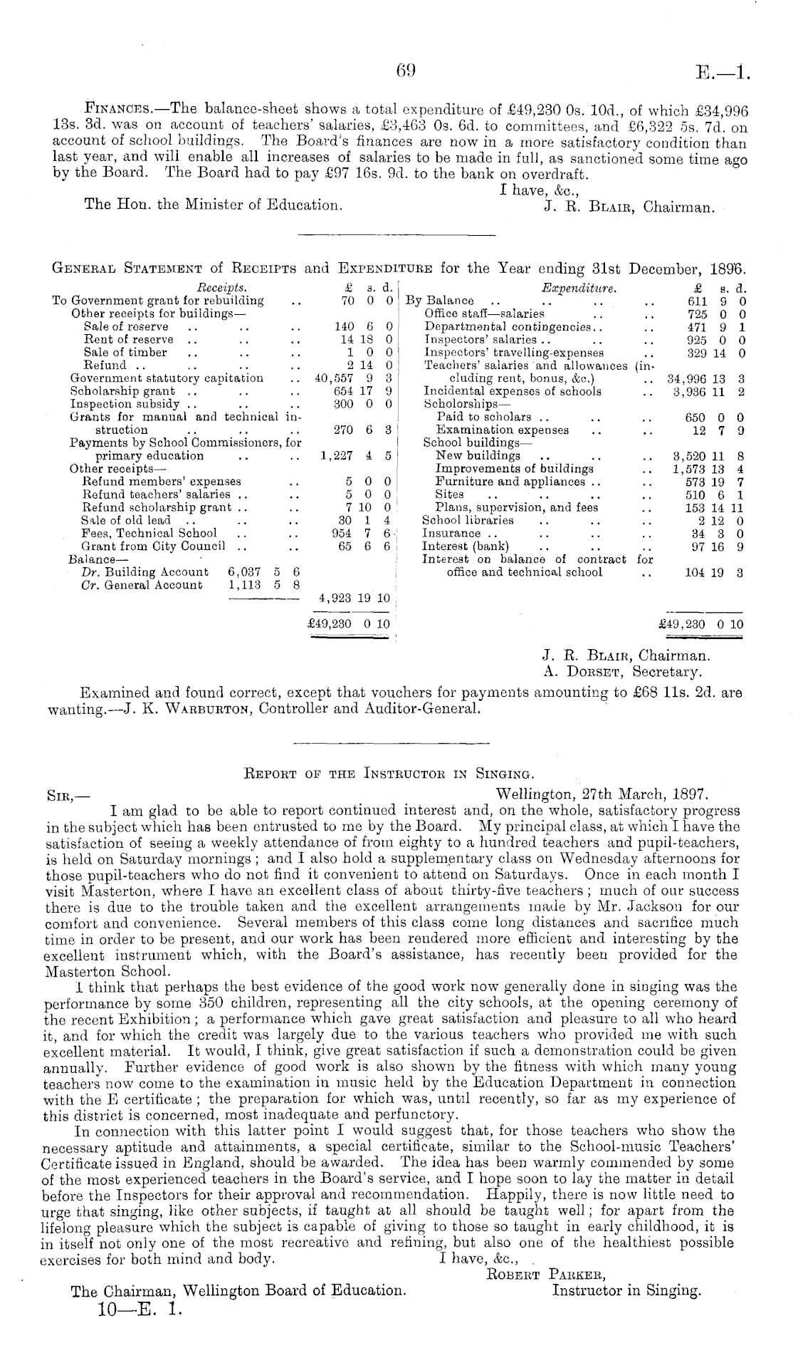 Finances.—The balance-sheet shows a total expenditure of £49,230 os. 10d., of which £34,996 13s. 3d. was on account of teachers' salaries, £3,463 os. 6d. to committees, and £6,322 ss. 7d. on account of school buildings. The Board's finances are now in a more satisfactory condition than last year, and will enable all increases of salaries to be made in full, as sanctioned some time ago by the Board. The Board had to pay £97 16s. 9d. to the bank on overdraft. I have, &c, The Hon. the Minister of Education. J. R. Blair, Chairman.