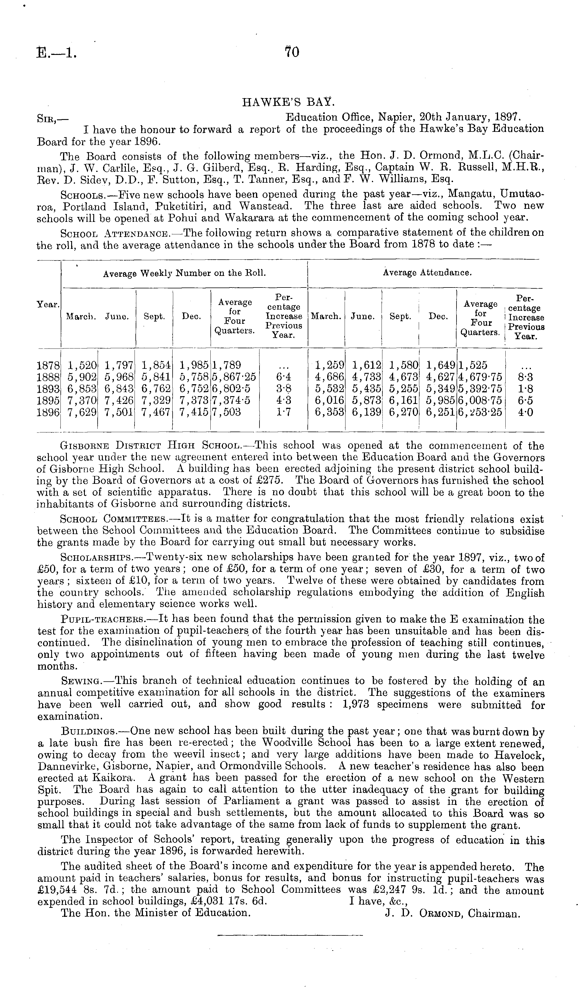 Gisborne Disteict High School. —This school was opened at the commencement of the school year under the new agreement entered into between the Education Board and the Governors of Gisbome High School. A building has been erected adjoining the present district school building by the Board of Governors at a cost of £275. The Board of Governors has furnished the school with a set of scientific apparatus. There is no doubt that this school will be a great boon to the inhabitants of Gisborne and surrounding districts. School Committees. —It is a matter for congratulation that the most friendly relations exist between the School Committees and the Education Board. The Committees continue to subsidise the grants made by the Board for carrying out small but necessary works. Scholarships.—Twenty-six new scholarships have been granted for the year 1897, viz., two of £50, for a term of two years ; one of £50, for a term of one year; seven of £30, for a term of two years ; sixteen of £10, for a term of two years. Twelve of these were obtained by candidates from the country schools. The amended scholarship regulations embodying the addition of English history and elementary science works well. Pupil-teacheks.—lt has been found that the permission given to make the E examination the test for the examination of pupil-teachers of the fourth year has been unsuitable and has been discontinued. The disinclination of young men to embrace the profession of teaching still continues, only two appointments out of fifteen having been made of young men during the last twelve months. Sewing.—This branch of technical education continues to be fostered by the holding of an annual competitive examination for all schools in the district. The suggestions of the examiners have been well carried out, and show good results : 1,973 specimens were submitted for examination. Buildings.—One new school has been built during the past year; one that was burnt down by a late bush fire has been re-erected ; the Woodville School has been to a large extent renewed, owing to decay from the weevil insect; and very large additions have been made to Havelock, Dannevirke, Gisborne, Napier, and Ormondville Schools. A new teacher's residence has also been erected at Kaikora. A grant has been passed for the erection of a new school on the Western Spit. The Board has again to call attention to the utter inadequacy of the grant for building purposes. During last session of Parliament a grant was passed to assist in the erection of school buildings in special and bush settlements, but the amount allocated to this Board was so small that it could not take advantage of the same from lack of funds to supplement the grant. The Inspector of Schools' report, treating generally upon the progress of education in this district during the year 1896, is forwarded herewith. The audited sheet of the Board's income and expenditure for the year is appended hereto. The amount paid in teachers' salaries, bonus for results, and bonus for instructing pupil-teachers was £19,544 Bs. 7d.; the amount paid to School Committees was £2,247 9s. Id.; and the amount expended in school buildings, £4,031 17s. 6d. I have, &c, The Hon. the Minister of Education. J. D. Okmond, Chairman.